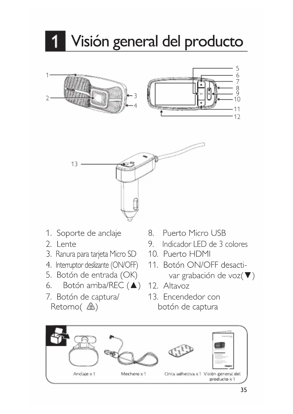 Funciones Grabación automática Detección de colisión y protección de archivos de emergencia Grabación en bucle perfecta Exposición automática Balance de blancos automático Marca de fecha y hora LCD Auto off Alerta de fatiga del conductor con índice de fatiga Botones de Grabación de emergencia EasyCapture Ángulo amplio Visión nocturna avanzada Sensor de imagen CMOS de 2,1 megapíxeles Resolución de vídeo Full HD (1920 x 1080p) a 30 fps HD Premium (1280x720p) a 60 fps HD Premium (1280x720p) a 30 fps Pantalla LCD de 2,7” Intervalo de abertura F/2,0 Objetivojo Objetivo gran angular 7G, FOV 156 (Diagonal) Formato de archivo .MOV Compresión de audio PCM/compresión de vídeo H.264 Memoria de acceso aleatorio SDRAM DDR3 64 M x 16 bits (1 Gbit) Memoria interna 32 Mb SPI Flash Soporte de grabación (memoria externa) Tarjeta Micro SD (clase 6 o superior, hasta 32 GB) Tiempo de grabación 160 min. a 16 GB para Full HD 320 min. a 32 GB para Full HD RTC 5 días Temperatura de funcionamiento -10℃ ~ 65℃ Temperatura de almacenamiento -20℃ ~ 70℃ Accesorios Cargador de coche Micro USB, montura 3M Anclaje, Guía rápida Interfaz Micro USB 2.0, HDMI, ranura Micro SD, micrófono, altavoz Idiomas Inglés, francés, alemán, italiano, español, portugués, polaco y ruso Alimentación Adaptador para coche 12-24 V/5V 1 A con botón de grabación EasyCapture Dimensiones (L x An. x Al.) 106,7 x 50,0 x 32,5 mm Especicacionestécnicas 71 Tuotteen osat ...................................................................................... 51 2 Pikaohje ..................................................................................................52