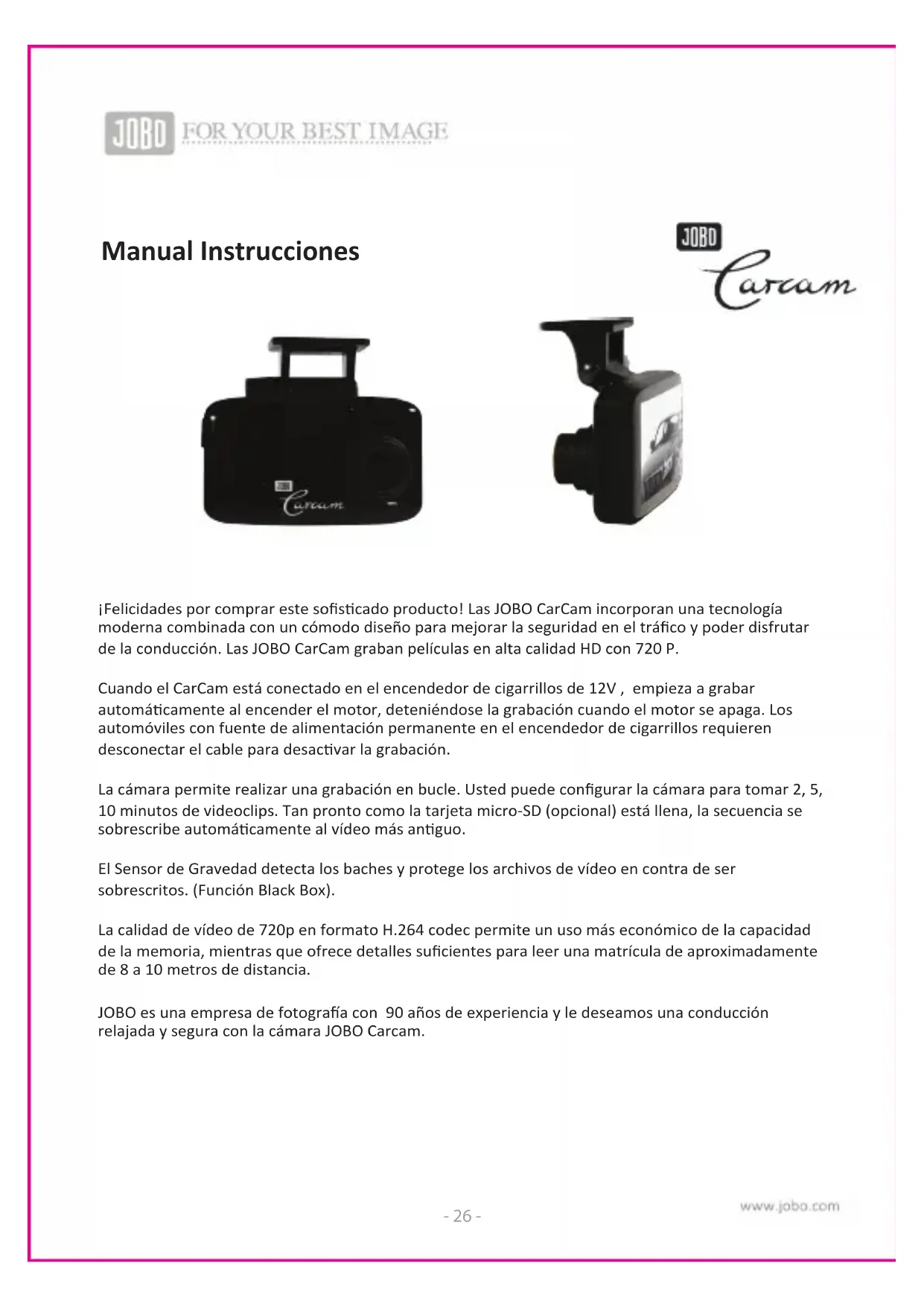 Dies ist eine ganz wichge Funkon – speziell für den Autokameraeinsatz entwickelt! Durch den eingebauten G-Sensor werden Erschüerungen wahrgenommen und je nach Einstellungssensibilität dieses Sensors werden diese Filme gegen Überschreiben geschützt. Somit wird verhindert, daß krische Videosequenzen (z.B. im Falle eines Aufpralls) im Loop-Recording Modus überschrieben werden. (Sogenannte BLACK-BOX Funkon). Diese Funkon empfehlen wir ausdrücklich zu akvieren, wenn Sie die Kamera im Loop-Recording Modus einsetzen. Ist der G-Sensor akviert so wird im OSD ein Auto mit angedeuteter Vibraon angezeigt. Photofunkonen:- 26 - Manual Instrucciones ¡Felicidades por comprar este sofiscado producto! Las JOBO CarCam incorporan una tecnología moderna combinada con un cómodo diseño para mejorar la seguridad en el tráfico y poder disfrutar de la conducción. Las JOBO CarCam graban películas en alta calidad HD con 720 P. Cuando el CarCam está conectado en el encendedor de cigarrillos de 12V , empieza a grabar automácamente al encender el motor, deteniéndose la grabación cuando el motor se apaga. Los automóviles con fuente de alimentación permanente en el encendedor de cigarrillos requieren desconectar el cable para desacvar la grabación. La cámara permite realizar una grabación en bucle. Usted puede configurar la cámara para tomar 2, 5, 10 minutos de videoclips. Tan pronto como la tarjeta micro-SD (opcional) está llena, la secuencia se sobrescribe automácamente al vídeo más anguo. El Sensor de Gravedad detecta los baches y protege los archivos de vídeo en contra de ser sobrescritos. (Función Black Box). La calidad de vídeo de 720p en formato H.264 codec permite un uso más económico de la capacidad de la memoria, mientras que ofrece detalles suficientes para leer una matrícula de aproximadamente de 8 a 10 metros de distancia. JOBO es una empresa de fotograa con 90 años de experiencia y le deseamos una conducción relajada y segura con la cámara JOBO Carcam.- 27 -