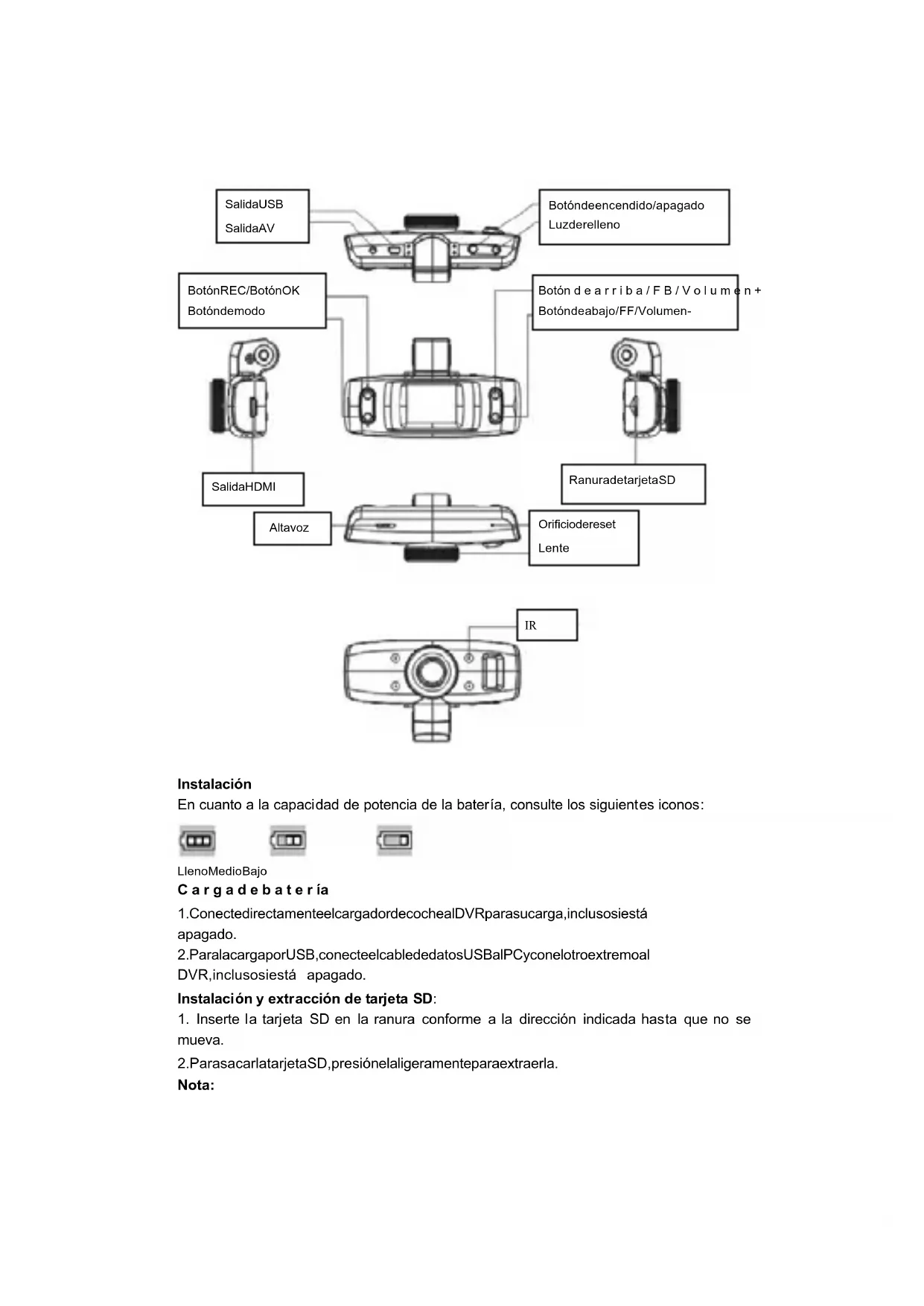 ConexinaTV 1. Use el cable HDMI para conectar el DVR a un TV para la reproduccin de archivos.2. Use un cable de TV para conectar el DVR a un TV para ver, capturar y navegar por las imgenes y vdeos. Consejo: sin el controlador instalado, el disco extrablesepodr usar si el DVR est encendido. Observaciones: si el dispositivo se cierra por un manejo indebido, presione el botnde reset para reiniciarlo y restaurarlo. Especificaciones tcnicas TamaodeLCD 1,5",4:3,LCDTFT Lente 120, alta resolucin de clase A+ con sper gran angular Idiomas disponibles alemn, ingls (predeterminado), francs, espaol, italiano, portugus, polaco, ruso, neerlands, griego, hngaro, checo, dans, sueco, noruego y fins Tamaodevdeo 720 P / 480 P Formato de vdeo AVI Resolucin fotogrfica 3 M (12 M, 8 M y 5 M interpolada) Formato fotogrfico JPG Tarjeta de memoria
