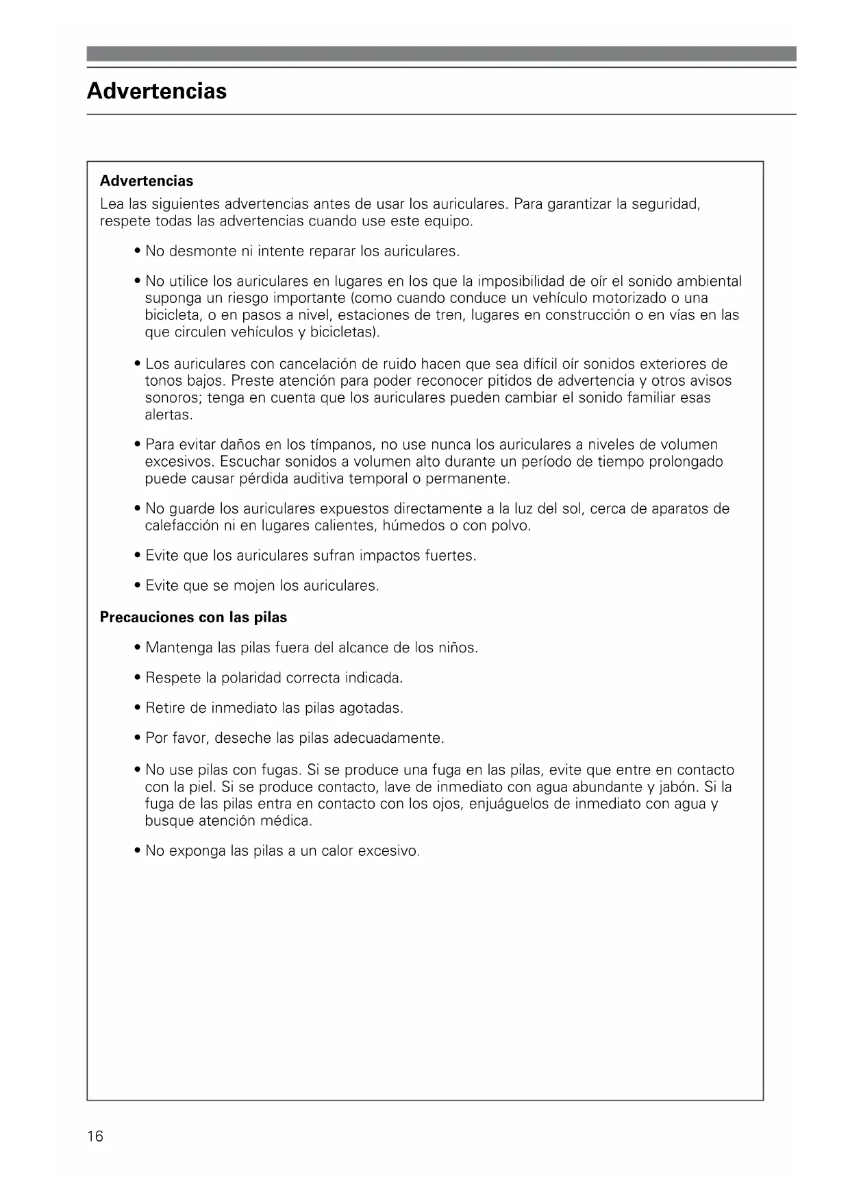 - Los auriculares con cancelación de ruido hacen que sea difícil oír sonidos exteriores de tonos bajos. Preste atención para poder reconocer pitidos de advertencia y otros avisos sonoros; tenga en cuenta que los auriculares pueden cambiar el sonido familiar esas alertas.