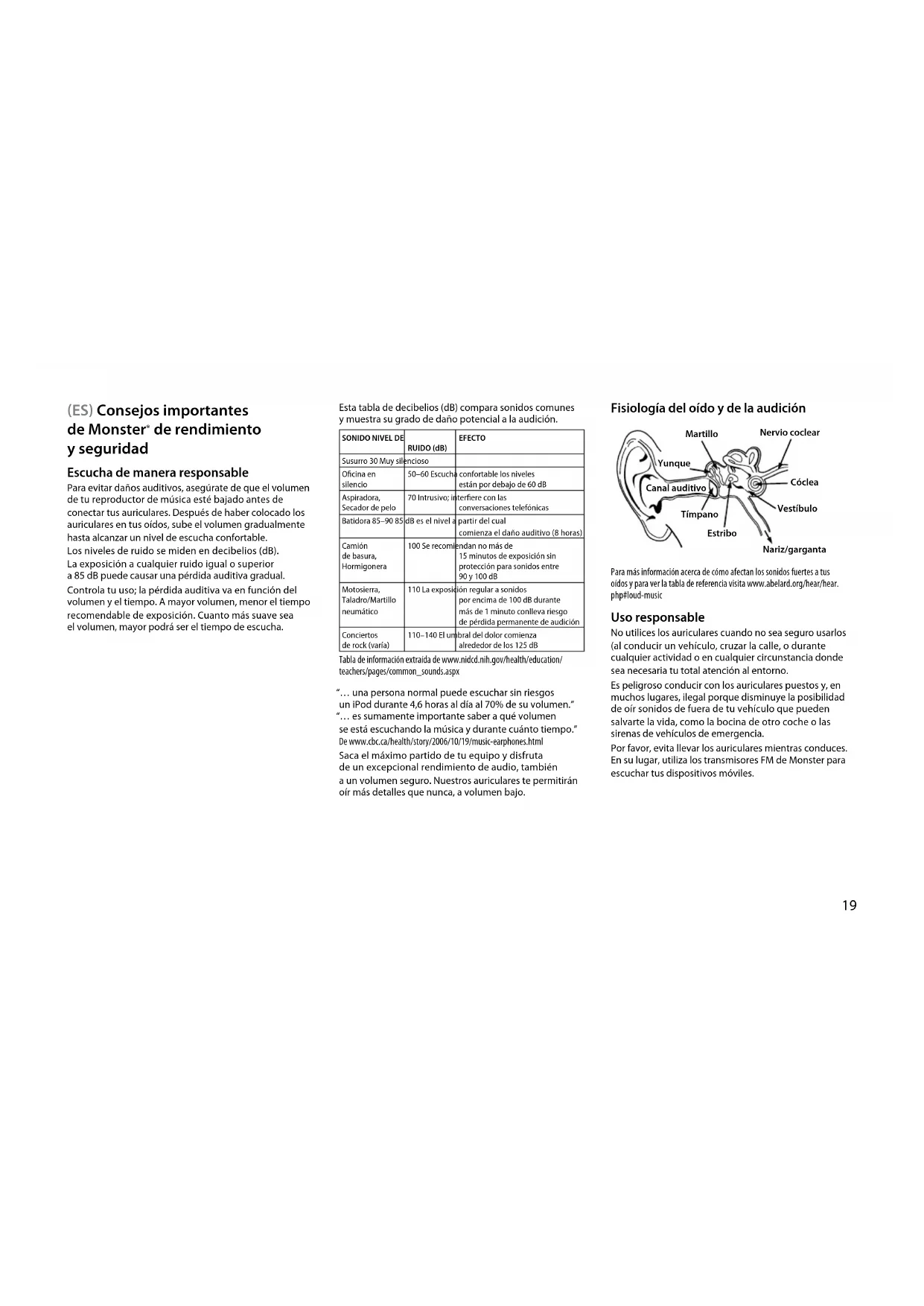 Aprende cómo establecer un nivel de escucha seguro y revisa otras importantes directrices de seguridad de la Asociación de electrónica de consumo (Consumer Electronics Association) en www.ce.org. Puedes encontrar información importante acerca de cómo evitar la pérdida de la audición inducida por el ruido y una lista exhaustiva de los ruidos que pueden ocasionar daños, en el sitio web de la Fundación para la investigación de la sordera (Deafness Research Foundation), www.drf.org.