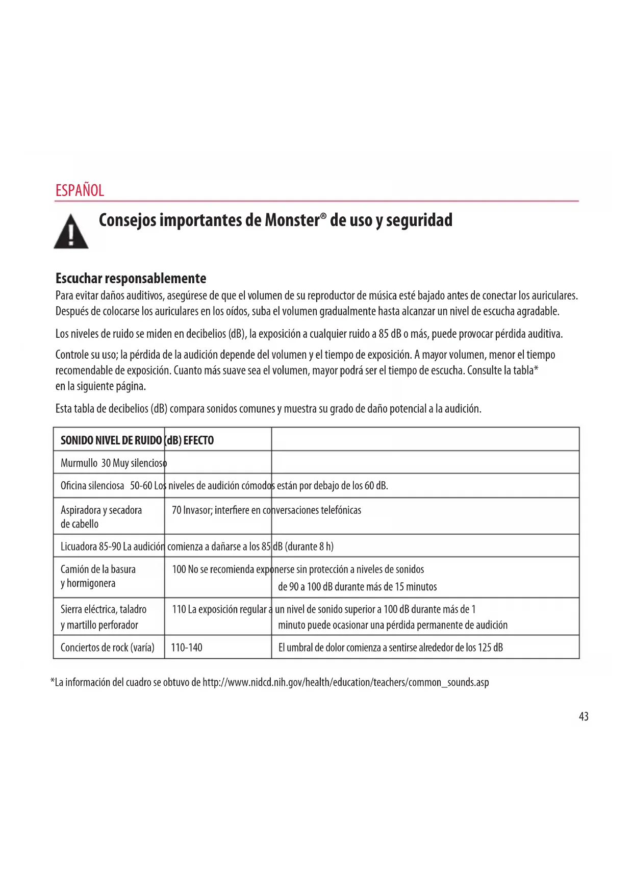 Controle su uso; la pérdida de la audición depende del volumen y el tiempo de exposición. A mayor volumen, menor el tiempo recomendable de exposición. Cuanto más suave sea el volumen, mayor podrá ser el tiempo de escucha. Consulte la tabla* en la siguiente página.