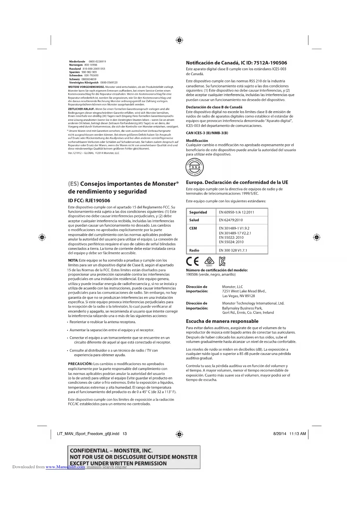 EN 301489-17 V2.2.1 EN 55022: 2010 EN 55024: 2010 Radio EN 300 328 V1.7.1 Número de certicación del modelo: 190506 (verde, negro, amarillo) Dirección de Monster, LLC importación: 7251 West Lake Mead Blvd., Las Vegas, NV 89128 Dirección de Monster Technology International, Ltd. importación: Ballymaley Business Park, Gort Rd., Ennis, Co. Clare, Ireland Escucha de manera responsable Para evitar daños auditivos, asegúrate de que el volumen de tu reproductor de música esté bajado antes de conectar tus auriculares. Después de haber colocado los auriculares en tus oídos, sube el volumen gradualmente hasta alcanzar un nivel de escucha confortable. Los niveles de ruido se miden en decibelios (dB). La exposición a cualquier ruido igual o superior a 85 dB puede causar una pérdida auditiva gradual. Controla tu uso; la pérdida auditiva va en función del volumen y el tiempo. A mayor volumen, menor el tiempo recomendable de exposición. Cuanto más suave sea el volumen, mayor podrá ser el tiempo de escucha. N2001 LIT_MAN_iSport_Freedom_g6jl.indd 13 8/20/14 11:13 AM Downloaded from www.Manualslib.com manuals search engineEsta tabla de decibelios (dB) compara sonidos comunes y muestra su grado de daño potencial a la audición. Saca el máximo partido de tu equipo y disfruta de un excepcional rendimiento de audio, también a un volumen seguro. Nuestros auriculares te permitirán oír más detalles que nunca, a volumen bajo. Aprende cómo establecer un nivel de escucha seguro y revisa otras importantes directrices de seguridad de la Asociación de electrónica de consumo (Consumer Electronics Association) en www.ce.org. Puedes encontrar información importante acerca de cómo evitar la pérdida de la audición inducida por el ruido y una lista exhaustiva de los ruidos que pueden ocasionar daños, en el sitio web de la Fundación para la investigación de la sordera (Deafness Research Foundation), www.drf.org. Fisiología del oído y de la audición Para más información sobre cómo los ruidos fuertes afectan sus oídos y sobre cómo protegerlos, consulte www.abelard.org/hear/hear.php#loud-music Uso responsable No utilices los auriculares cuando no sea seguro usarlos—al conducir un vehículo, montar en bicicleta, cruzar la calle, o durante cualquier actividad o en cualquier circunstancia donde sea necesaria tu total atención al entorno. Es peligroso conducir con los auriculares puestos y, en muchos lugares, ilegal porque disminuye la posibilidad de oír sonidos de fuera de tu vehículo que pueden salvarte la vida, como la bocina de otro coche o las sirenas de vehículos de emergencia. Por favor, evita llevar los auriculares mientras conduces. En su lugar, utiliza los transmisores FM de Monster para escuchar tus dispositivos móviles. Limpieza Limpie los auriculares con un paño humedecido con jabón líquido suave. Botones y partes Los auriculares incluyen las siguientes partes: Yunque Nervio coclear Estribo Tímpano Canal auditivo Cóclea Vestíbulo Nariz/garganta Martillo
