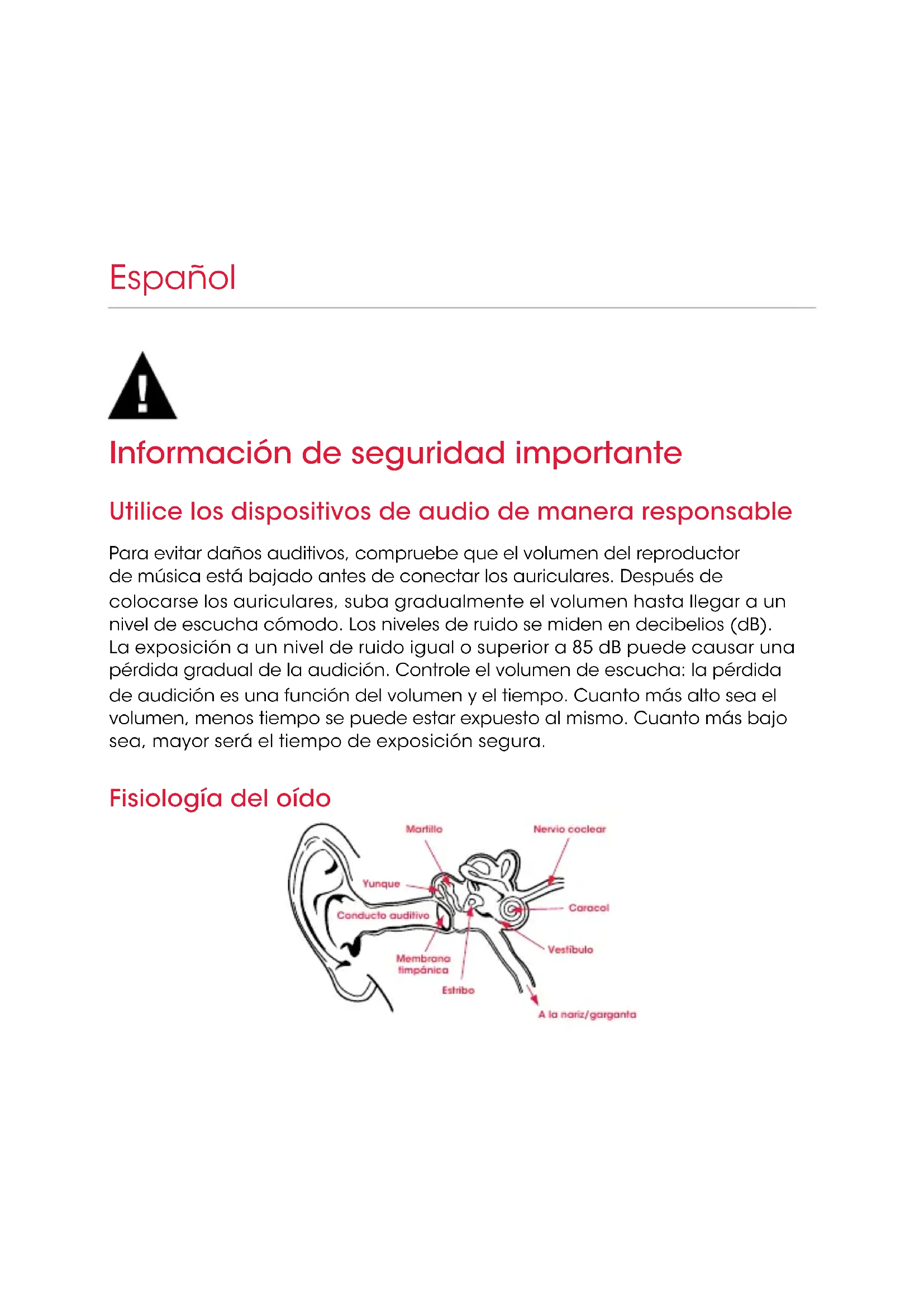 aujourd’hui www.beatsbydre.com/register Oui Non FrançaisInformación de seguridad importante Utilice los dispositivos de audio de manera responsable Para evitar daños auditivos, compruebe que el volumen del reproductor de música está bajado antes de conectar los auriculares. Después de colocarse los auriculares, suba gradualmente el volumen hasta llegar a un nivel de escucha cómodo. Los niveles de ruido se miden en decibelios (dB). La exposición a un nivel de ruido igual o superior a 85 dB puede causar una pérdida gradual de la audición. Controle el volumen de escucha: la pérdida de audición es una función del volumen y el tiempo. Cuanto más alto sea el volumen, menos tiempo se puede estar expuesto al mismo. Cuanto más bajo sea, mayor será el tiempo de exposición segura. Fisiología del oído Español Martillo Nervio coclear Estribo Membrana timpánica Conducto auditivo Caracol Yunque Vestíbulo A la nariz/garganta24