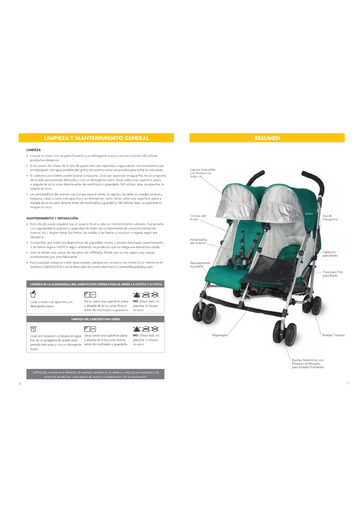 - Las almohadillas del asiento con correas para el arnés, la capota y la cesta no pueden lavarse a máquina. Lavar a mano con agua fría y un detergente suave. Secar sobre una superficie plana y alejada de la luz solar directa antes de reutilizarlo o guardarlo. NO utilizar lejía, no planchar ni limpiar en seco. MANTENIMIENTO Y REPARACIÓN: