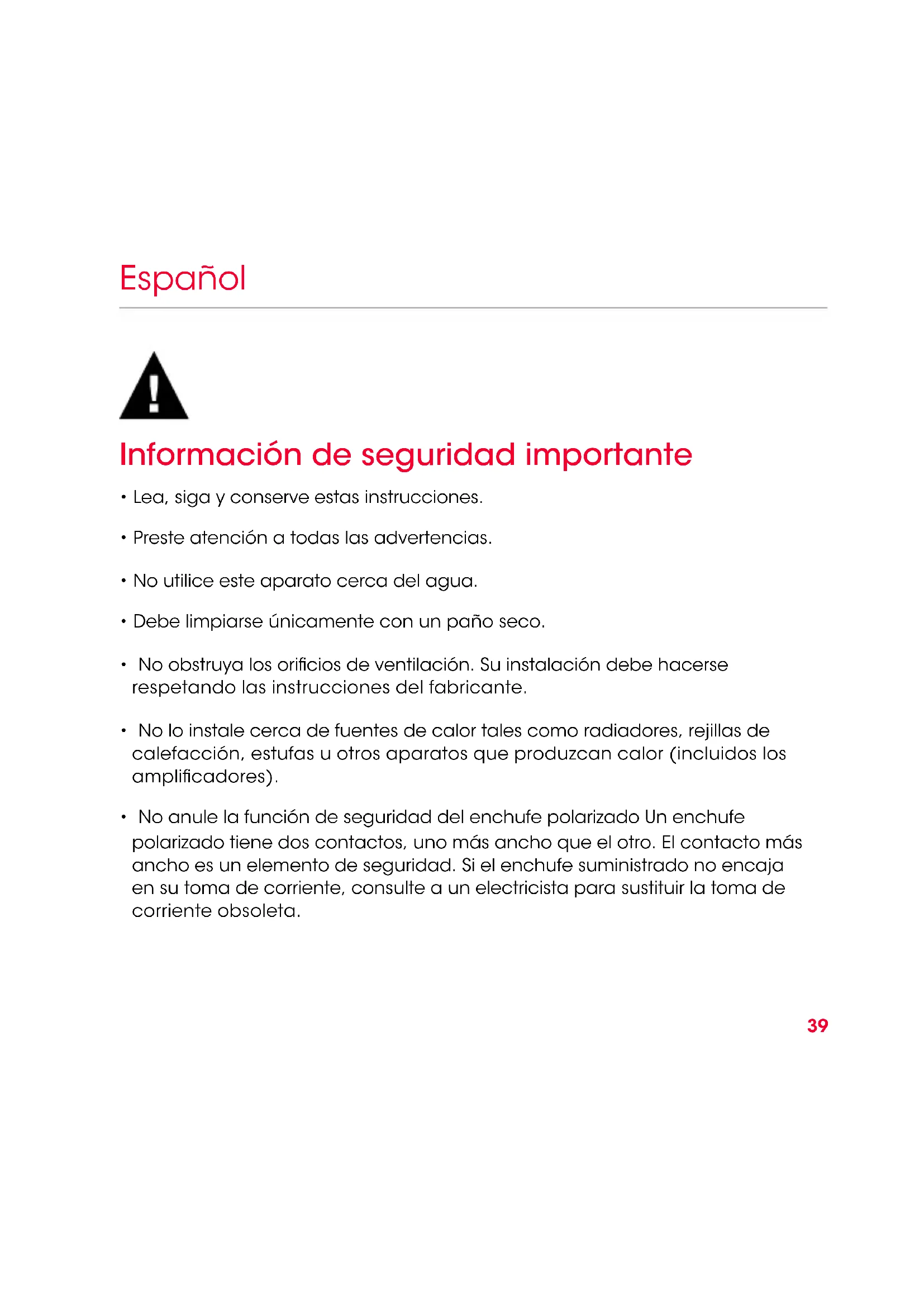 - No anule la función de seguridad del enchufe polarizado Un enchufe polarizado tiene dos contactos, uno más ancho que el otro. El contacto más ancho es un elemento de seguridad. Si el enchufe suministrado no encaja en su toma de corriente, consulte a un electricista para sustituir la toma de corriente obsoleta.40 Español