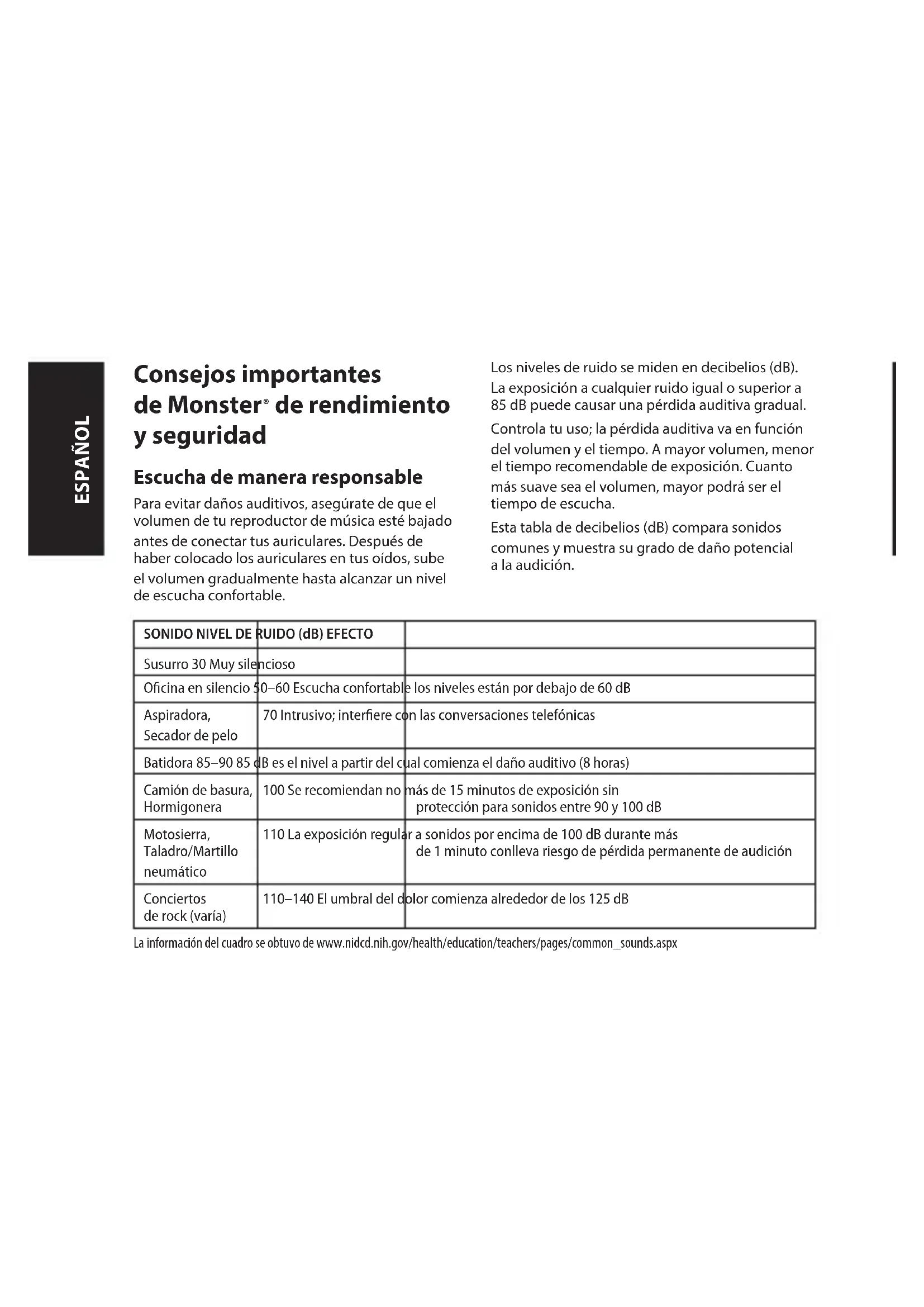 de rendimiento y seguridad Escucha de manera responsable Para evitar daños auditivos, asegúrate de que el volumen de tu reproductor de música esté bajado antes de conectar tus auriculares. Después de haber colocado los auriculares en tus oídos, sube el volumen gradualmente hasta alcanzar un nivel de escucha confortable. Los niveles de ruido se miden en decibelios (dB). La exposición a cualquier ruido igual o superior a 85 dB puede causar una pérdida auditiva gradual. Controla tu uso; la pérdida auditiva va en función del volumen y el tiempo. A mayor volumen, menor el tiempo recomendable de exposición. Cuanto más suave sea el volumen, mayor podrá ser el tiempo de escucha. Esta tabla de decibelios (dB) compara sonidos comunes y muestra su grado de daño potencial a la audición. SONIDO NIVEL DE RUIDO (dB) EFECTO Susurro 30 Muy silencioso Ocina en silencio 50–60 Escucha confortable los niveles están por debajo de 60 dB Aspiradora, Secador de pelo 70 Intrusivo; interere con las conversaciones telefónicas Batidora 85–90 85 dB es el nivel a partir del cual comienza el daño auditivo (8 horas) Camión de basura, Hormigonera 100 Se recomiendan no más de 15 minutos de exposición sin protección para sonidos entre 90 y 100 dB Motosierra, Taladro/Martillo neumático 110 La exposición regular a sonidos por encima de 100 dB durante más de 1 minuto conlleva riesgo de pérdida permanente de audición Conciertos de rock (varía) 110–140 El umbral del dolor comienza alrededor de los 125 dB La información del cuadro se obtuvo de www.nidcd.nih.gov/health/education/teachers/pages/common_sounds.aspx ESPAÑOLSaca el máximo partido a tu equipo y disfruta de un excepcional rendimiento de audio, también a un volumen seguro. Nuestros auriculares te permitirán oír más detalles que nunca, a volumen bajo. Aprende cómo establecer un nivel de escucha seguro y revisa otras importantes directrices de seguridad de la Asociación de electrónica de consumo (Consumer Electronics Association) en www.ce.org. Puedes encontrar información importante acerca de cómo evitar la pérdida de la audición inducida por el ruido y una lista exhaustiva de los ruidos que pueden ocasionar daños, en el sitio web de la Fundación para la investigación de la sordera (Deafness Research Foundation), www.drf.org. Fisiología del oído y de la audición For additional information on what loud noises do to your ear and more on protecting the ear, reference www.abelard.org/hear/hear. php#loud-music Uso responsable No utilices los auriculares cuando no sea seguro usarlos – al conducir un vehículo, montar en bicicleta, cruzar la calle, o durante cualquier actividad o en cualquier circunstancia donde sea necesaria tu total atención al entorno. Es peligroso conducir con los auriculares puestos y, en muchos lugares, ilegal porque disminuye la posibilidad de oír sonidos de fuera de tu vehículo que pueden salvarte la vida, como la bocina de otro coche o las sirenas de vehículos de emergencia. Por favor, evita llevar los auriculares mientras conduces. En su lugar, utiliza los transmisores FM de Monster para escuchar tus dispositivos móviles. Rodaje de los auriculares ¿Periodo de rodaje para los auriculares? Estás de broma, ¿verdad? Pues no. Como cualquier otro producto de alto rendimiento, ya sea un coche o unos auriculares, se trata de dispositivos mecánicos que se van ajustando después del uso. Tus nuevos auriculares sonarán increíblemente bien nada más sacarlos de la caja, pero se irán suavizando con el uso y terminarán por sonar aún mejor. Recomendamos su uso durante 8 horas. Después de 20 horas de reproducción, ya deben estar totalmente rodados. Disfruta. Yunque Nervio coclear Estribo Tímpano Canal auditivo Cóclea Vestíbulo Nariz/garganta Martillo ESPAÑOLPila Si procede, la batería debe reciclarse o desecharse adecuadamente. Información al consumidor en aplicación de la Directiva Comunitaria RAEE 96/2002 (sobre Residuos de Aparatos Eléctricos y Electrónicos) Este producto está sujeto al reglamento de la Unión Europea que promueve la reutilización y reciclaje de aparatos eléctricos y electrónicos usados. Este producto puede contener sustancias peligrosas, y la extracción y utilización de recursos naturales fue necesaria para su fabricación. El símbolo que aparece al inicio, si gura en el producto o en su envase, indica que este producto no debe eliminarse junto con el resto de sus residuos doméstico. Así que es responsabilidad de los consumidores deshacerse de sus aparatos depositándolos en un punto de recogida designado para el reciclaje de aparatos eléctricos o electrónicos. La recogida selectiva y reciclaje de los residuos de sus aparatos en el momento de su eliminación contribuye a la conservación de los recursos naturales y garantiza su reciclaje de forma que se proteja la salud de las personas y el medio ambiente. Para obtener más información sobre los puntos de recogida de residuos eléctricos y electrónicos para su reciclaje, póngase en contacto con su ayuntamiento, con el servicio de eliminación de residuos domésticos, o con el establecimiento en el que adquirió el producto. Para obtener más información sobre los productos Monster, visite nuestra página web: www.MonsterProducts.com. Atención al Cliente de Monster
