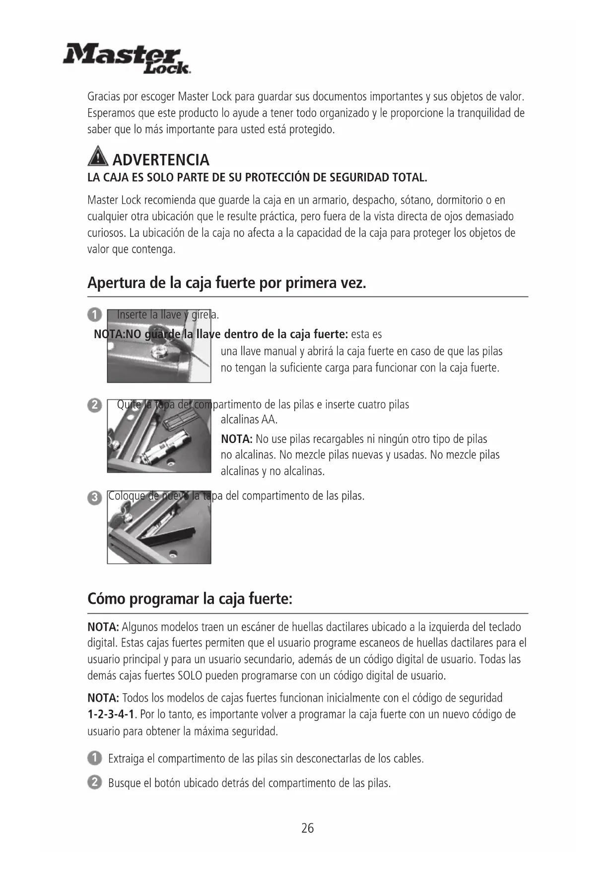 NOTA: Todos los modelos de cajas fuertes funcionan inicialmente con el código de seguridad 1-2-3-4-1. Por lo tanto, es importante volver a programar la caja fuerte con un nuevo código de usuario para obtener la máxima seguridad.