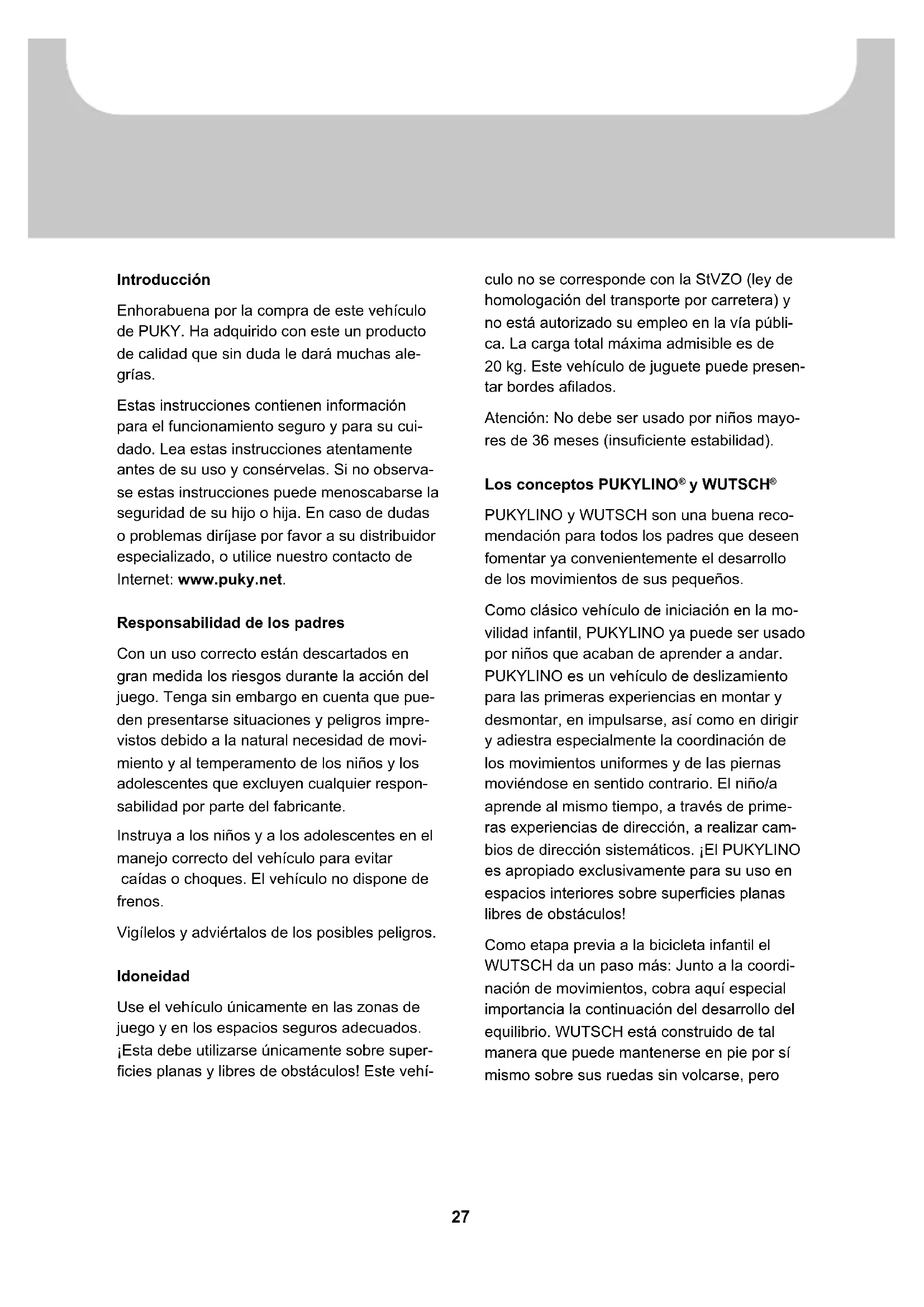Drobné díly, které během montáže potřebujete (například šrouby a podložky), se nesmí dostat do dětských rukou. Hrozí nebezpečí zadušení spolknutím. Držte jakýkoliv obalový materiál mimo dosah dětí. Montáž musí důkladně provést dospělý člověk, aby později nemohlo dojít k úrazům a zraně- ním. Vyhraďte si na to dostatek času. Některé montážní práce vyžadují řemeslnou zručnost a praxi při zacházení s nářadím (např. klíč na šrouby). Pokud si nejste jisti, obraťte se na specializovaného prodejce nebo servis. Na některých místech je nutné, aby se šrouby utáhly určitým utahovacím momentem. Tento utahovací moment je uveden v newtonmetrech (např. 2 Nm). Pokud se šroub dotáhne příliš malým utahovacím momentem, může být spoj volný a ne bezpečný. Je-li utahovací moment příliš velký, mohou se šrouby a jiné díly poško- dit a zničit. Obr. 1: Povolením šroubového spoje sejměte podložku (!) z přepravní pojistky. Obr. 2: Vidlici nasuňte až na doraz skrz hlavo- vou trubku. Dbejte na správné vyrovnání ložis- ka řízení (1). Nasaďte podložky. Obr. 3: Řídítka nasuňte až doraz na vidlici a upevněte dotáhnutím šroubu. Drážku v řídít- kách nastavte směrem dozadu (!). Poté stlačte kulovou krytku dolů, dokud nezapadne. Obr. 4: Sedlo nasaďte na rám a sešroubujte.27 PUKYLINO & WUTSCH Manual de instrucciones ES Introducción Enhorabuena por la compra de este vehículo de PUKY. Ha adquirido con este un producto de calidad que sin duda le dará muchas ale- grías. Estas instrucciones contienen información para el funcionamiento seguro y para su cui- dado. Lea estas instrucciones atentamente antes de su uso y consérvelas. Si no observa- se estas instrucciones puede menoscabarse la seguridad de su hijo o hija. En caso de dudas o problemas diríjase por favor a su distribuidor especializado, o utilice nuestro contacto de Internet: www.puky.net. Responsabilidad de los padres Con un uso correcto están descartados en gran medida los riesgos durante la acción del juego. Tenga sin embargo en cuenta que pue- den presentarse situaciones y peligros impre- vistos debido a la natural necesidad de movi- miento y al temperamento de los niños y los adolescentes que excluyen cualquier respon- sabilidad por parte del fabricante. Instruya a los niños y a los adolescentes en el manejo correcto del vehículo para evitar caídas o choques. El vehículo no dispone de frenos. Vigílelos y adviértalos de los posibles peligros. Idoneidad Use el vehículo únicamente en las zonas de juego y en los espacios seguros adecuados. ¡Esta debe utilizarse únicamente sobre super- ficies planas y libres de obstáculos! Este vehí- culo no se corresponde con la StVZO (ley de homologación del transporte por carretera) y no está autorizado su empleo en la vía públi- ca. La carga total máxima admisible es de 20 kg. Este vehículo de juguete puede presen- tar bordes afilados. Atención: No debe ser usado por niños mayo- res de 36 meses (insuficiente estabilidad). Los conceptos PUKYLINO