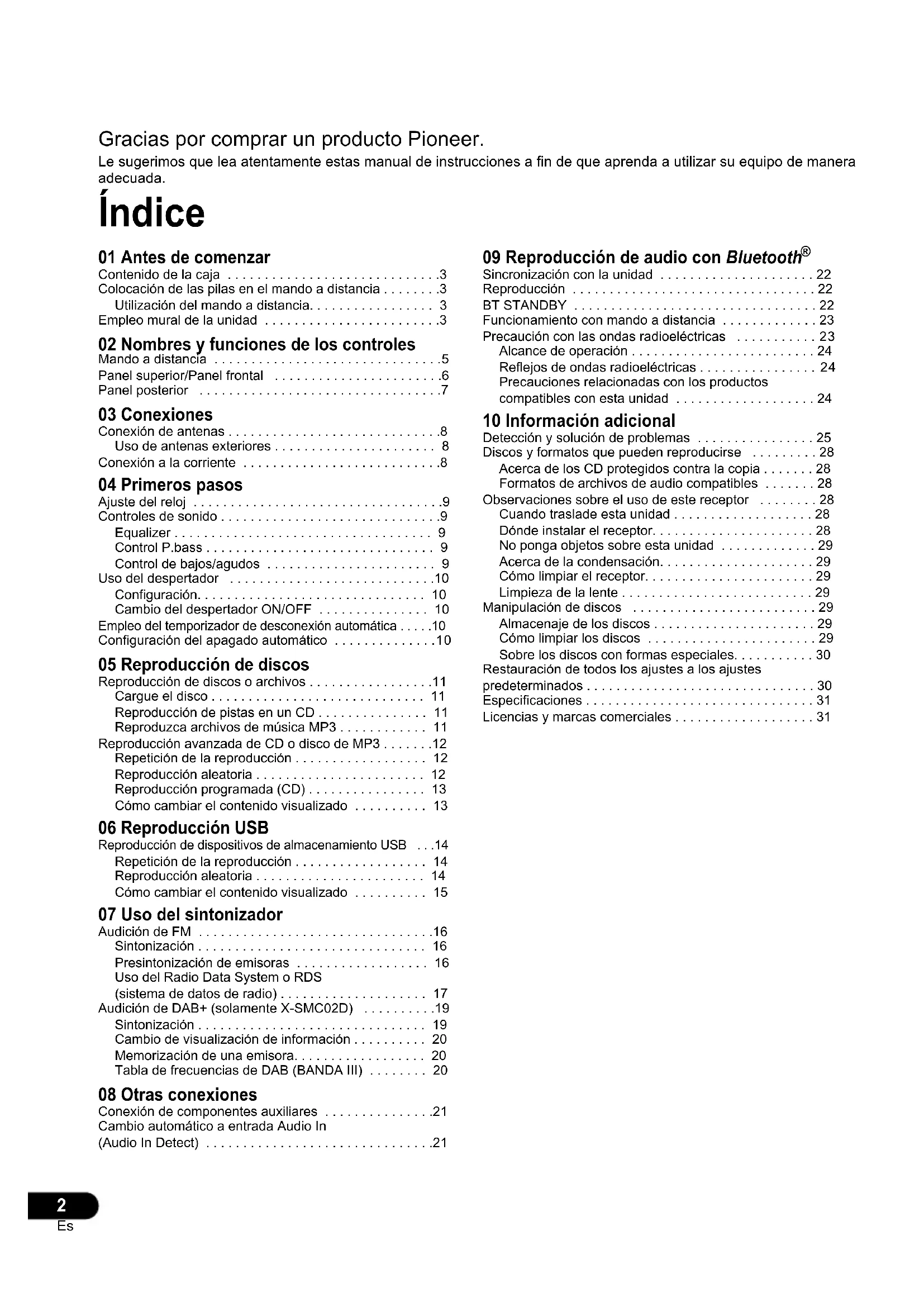 - Gracias por comprar un producto Pioneer. Le sugerimos que lea atentamente estas manual de instrucciones a fin de que aprenda a utilizar su equipo de manera adecuada. Índice 01 Antes de comenzar Contenido de la caja p. 3