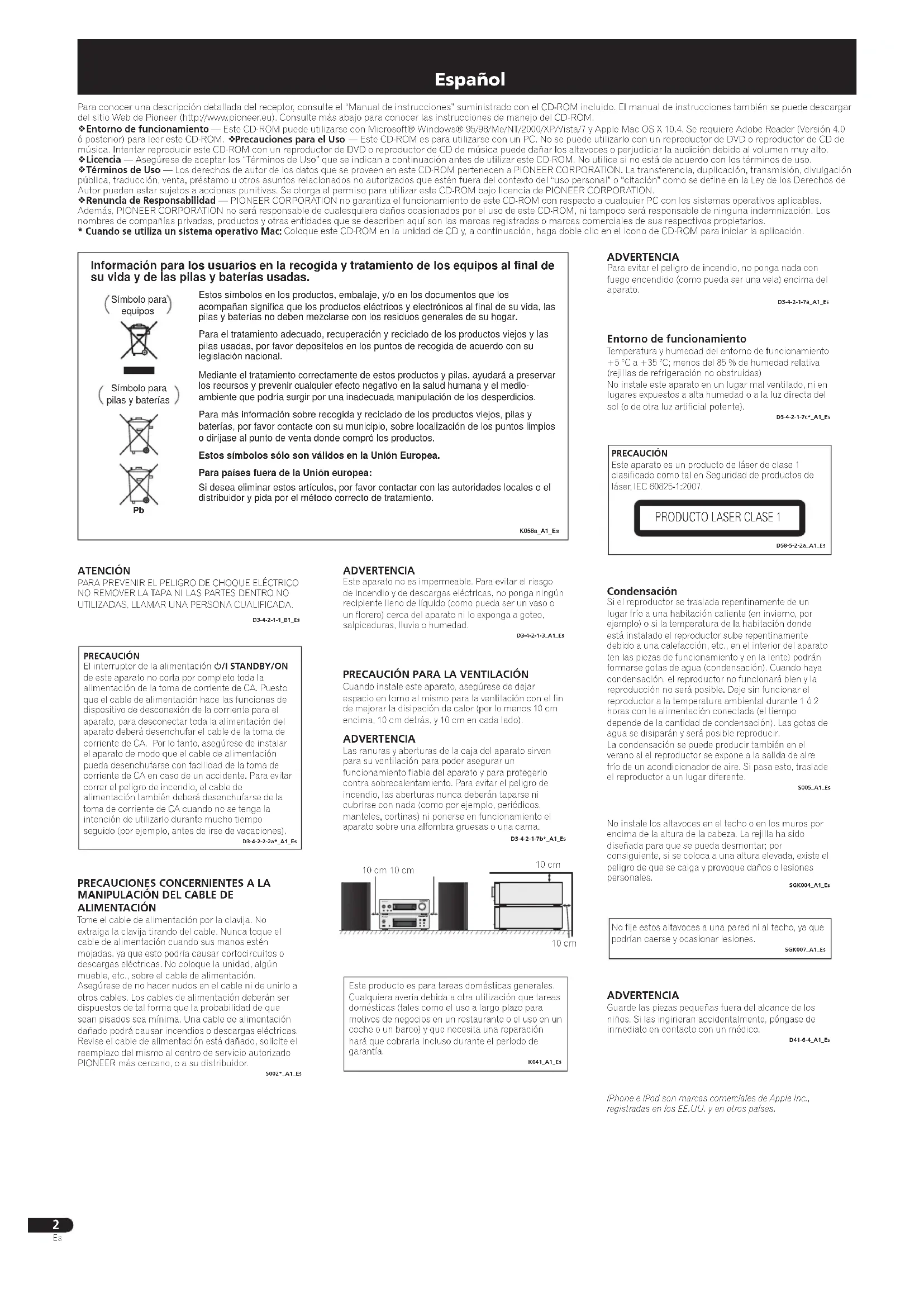 Información para los usuarios en la recogida y tratamiento de los equipos al final de su vida y de las pilas y baterías usadas. Estos símbolos en los productos, embalaje, y/o en los documentos que los acompañan significa que los productos eléctricos y electrónicos al final de su vida, las pilas y baterías no deben mezclarse con los residuos generales de su hogar.Para el tratamiento adecuado, recuperación y reciclado de los productos viejos y las pilas usadas, por favor deposítelos en los puntos de recogida de acuerdo con su legislación nacional.Mediante el tratamiento correctamente de estos productos y pilas, ayudará a preservar los recursos y prevenir cualquier efecto negativo en la salud humana y el medio- ambiente que podría surgir por una inadecuada manipulación de los desperdicios.Para más información sobre recogida y reciclado de los productos viejos, pilas y baterías, por favor contacte con su municipio, sobre localización de los puntos limpios o diríjase al punto de venta donde compró los productos.Estos símbolos sólo son válidos en la Unión Europea.Para países fuera de la Unión europea:Si desea eliminar estos artículos, por favor contactar con las autoridades locales o el distribuidor y pida por el método correcto de tratamiento.Símbolo parapilas y bateríasSímbolo para equiposATENCIÓNPARA PREVENIR EL PELIGRO DE CHOQUE ELÉCTRICO NO REMOVER LA TAPA NI LAS PARTES DENTRO NO UTILIZADAS, LLAMAR UNA PERSONA CUALIFICADA.D3-4-2-1-1_B1_EsPRECAUCIÓN El interruptor de la alimentación /I STANDBY/ON de este aparato no corta por completo toda la alimentación de la toma de corriente de CA. Puesto que el cable de alimentación hace las funciones de dispositivo de desconexión de la corriente para el aparato, para desconectar toda la alimentación del aparato deberá desenchufar el cable de la toma de corriente de CA. Por lo tanto, asegúrese de instalar el aparato de modo que el cable de alimentación pueda desenchufarse con facilidad de la toma de corriente de CA en caso de un accidente. Para evitar correr el peligro de incendio, el cable de alimentación también deberá desenchufarse de la toma de corriente de CA cuando no se tenga la intención de utilizarlo durante mucho tiempo seguido (por ejemplo, antes de irse de vacaciones).D3-4-2-2-2a*_A1_Es10 cm 10 cm10 cm10 cmNo fije estos altavoces a una pared ni al techo, ya que podrían caerse y ocasionar lesiones.SGK007_A1_EsNo instale los altavoces en el techo o en los muros por encima de la altura de la cabeza. La rejilla ha sido diseñada para que se pueda desmontar; por consiguiente, si se coloca a una altura elevada, existe el peligro de que se caiga y provoque daños o lesiones personales.iPhone e iPod son marcas comerciales de Apple Inc., registradas en los EE.UU. y en otros países.SGK004_A1_EsCondensaciónSi el reproductor se traslada repentinamente de un lugar frío a una habitación caliente (en invierno, por ejemplo) o si la temperatura de la habitación donde está instalado el reproductor sube repentinamente debido a una calefacción, etc., en el interior del aparato (en las piezas de funcionamiento y en la lente) podrán formarse gotas de agua (condensación). Cuando haya condensación, el reproductor no funcionará bien y la reproducción no será posible. Deje sin funcionar el reproductor a la temperatura ambiental durante 1 ó 2 horas con la alimentación conectada (el tiempo depende de la cantidad de condensación). Las gotas de agua se disiparán y será posible reproducir.La condensación se puede producir también en el verano si el reproductor se expone a la salida de aire frío de un acondicionador de aire. Si pasa esto, traslade el reproductor a un lugar diferente.S005_A1_EsADVERTENCIAGuarde las piezas pequeñas fuera del alcance de los niños. Si las ingirieran accidentalmente, póngase de inmediato en contacto con un médico.D41-6-4_A1_EsXC_P01_P01DAB_QSG.indb 2 2012/12/21 13:32:45English Français Deutsch Nederlands Italiano Español