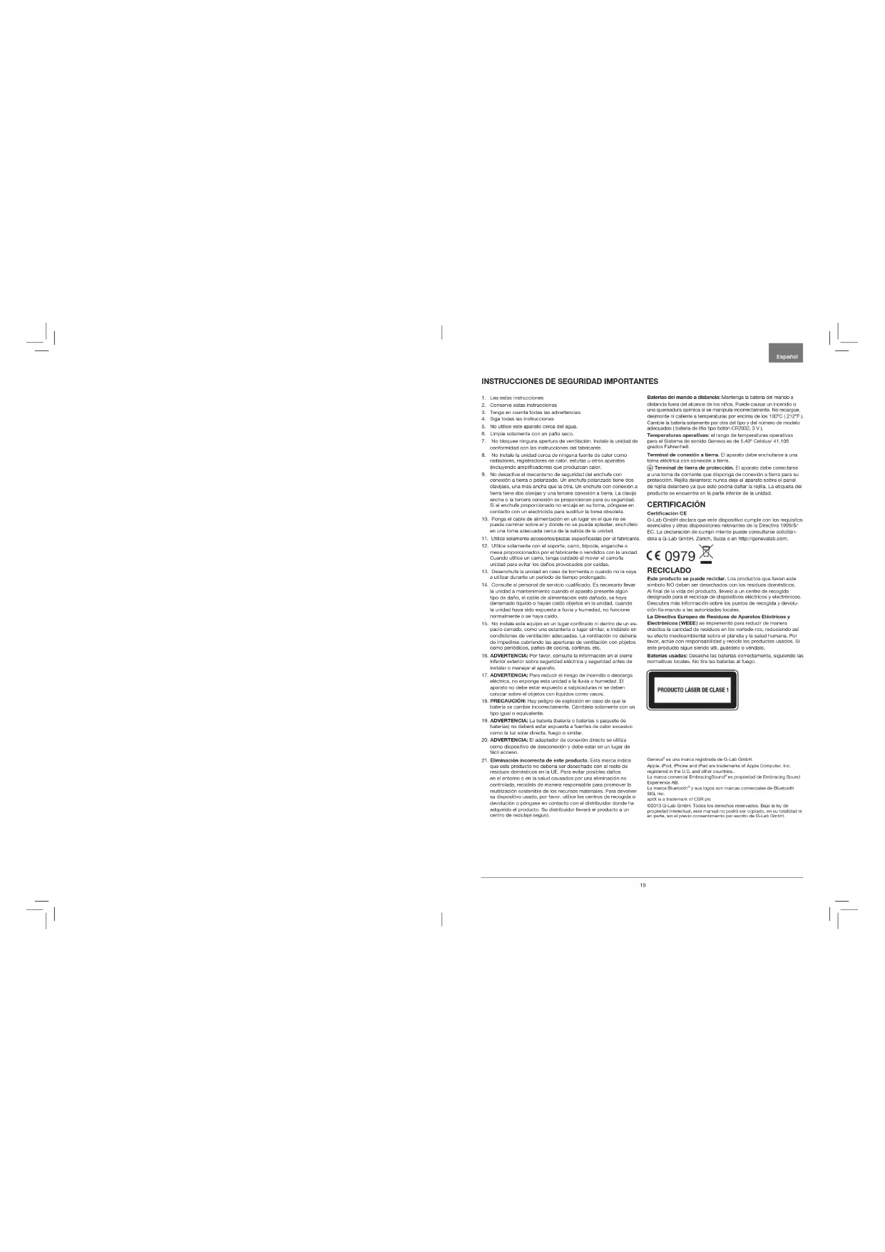 1. Lea estas instrucciones 2. Conserve estas instrucciones3. Tenga en cuenta todas las advertencias4. Siga todas las instrucciones 5. No utilice este aparato cerca del agua.6. Limpie solamente con un paño seco.7. No bloquee ninguna apertura de ventilación. Instale la unidad de conformidad con las instrucciones del fabricante.8. No instale la unidad cerca de ninguna fuente de calor como radiadores, registradores de calor, estufas u otros aparatos (incluyendo amplicadores) que produzcan calor. 9. No desactive el mecanismo de seguridad del enchufe con conexión a tierra o polarizado. Un enchufe polarizado tiene dos clavijass, una más ancha que la otra. Un enchufe con conexión a tierra tiene dos clavijas y una tercera conexión a tierra. La clavija ancha o la tercera conexión se proporcionan para su seguridad. Si el enchufe proporcionado no encaja en su toma, póngase en contacto con un electricista para sustituir la toma obsoleta.10. Ponga el cable de alimentación en un lugar en el que no se pueda caminar sobre el y donde no se pueda aplastar, enchúfelo en una toma adecuada cerca de la salida de la unidad.11. Utilice solamente accesorios/piezas especicadas por el fabricante.12. Utilice solamente con el soporte, carro, trípode, enganche o mesa proporcionados por el fabricante o vendidos con la unidad. Cuando utilice un carro, tenga cuidado al mover el carro/la unidad para evitar los daños provocados por caídas.13. Desenchufe la unidad en caso de tormenta o cuando no la vaya a utilizar durante un periodo de tiempo prolongado.14. Consulte al personal de servicio cualicado. Es necesario llevar la unidad a mantenimiento cuando el aparato presente algún tipo de daño, el cable de alimentación esté dañado, se haya derramado líquido o hayan caído objetos en la unidad, cuando la unidad haya sido expuesta a lluvia y humedad, no funcione normalmente o se haya caído.15. No instale este equipo en un lugar connado ni dentro de un es-pacio cerrado, como una estantería o lugar similar, e instálelo en condiciones de ventilación adecuadas. La ventilación no debería de impedirse cubriendo las aperturas de ventilación con pbjetos como periódicos, paños de cocina, cortinas, etc.16. ADVERTENCIA: Por favor, consulte la información en el cierre inferior exterior sobre seguridad eléctrica y seguridad antes de instalar o manejar el aparato.17. ADVERTENCIA: Para reducir el riesgo de incendio o descarga eléctrica, no exponga esta unidad a la lluvia o humedad. El aparato no debe estar expuesto a salpicaduras ni se deben colocar sobre el objetos con líquidos como vasos.18. PRECAUCIÓN: Hay peligro de explosión en caso de que la batería se cambie incorrectamente. Cámbiela solamente con un tipo igual o equivalente.19. ADVERTENCIA: La batería (batería o baterías o paquete de baterías) no deberá estar expuesta a fuentes de calor excesivo como la luz solar directa, fuego o similar.20. ADVERTENCIA: El adaptador de conexión directo se utiliza como dispositivo de desconexión y debe estar en un lugar de fácil acceso.21. Eliminación incorrecta de este producto. Esta marca indica que este producto no debería ser desechado con el resto de residuos domésticos en la UE. Para evitar posibles daños en el entorno o en la salud causados por una eliminación no controlada, recíclelo de manera responsable para promover la reutilización sostenible de los recursos materiales. Para devolver su dispositivo usado, por favor, utilice los centros de recogida o devolución o póngase en contacto con el distribuidor donde ha adquirido el producto. Su distribuidor llevará el producto a un centro de reciclaje seguro. Baterías del mando a distancia: Mantenga la batería del mando a distancia fuera del alcance de los niños. Puede causar un incendio o una quemadura química si se manipula incorrectamente. No recargue, desmonte ni caliente a temperaturas por encima de los 100ºC ( 212ºF ). Cambie la batería solamente por otra del tipo y del número de modelo adecuados ( batería de litio tipo botón CR2032, 3 V ).Temperaturas operativas: el rango de temperaturas operativas para el Sistema de sonido Geneva es de 5,40ª Celsius/ 41,105 grados Fahrenheit.Terminal de conexión a tierra. El aparato debe enchufarse a una toma eléctrica con conexión a tierra. Terminal de tierra de protección. El aparato debe conectarse a una toma de corriente que disponga de conexión a tierra para su protección. Rejilla delantera: nunca deje el aparato sobre el panel de rejilla delantero ya que esto podría dañar la rejilla. La etiqueta del producto se encuentra en la parte inferior de la unidad. CERTIFICACIÓN Certicación CEG-Lab GmbH declara que este dispositivo cumple con los requisitos esenciales y otras disposiciones relevantes de la Directiva 1999/5/EC. La declaración de cumpli-miento puede consultarse solicitán-dola a G-Lab GmbH, Zúrich, Suiza o en http://genevalab.com.