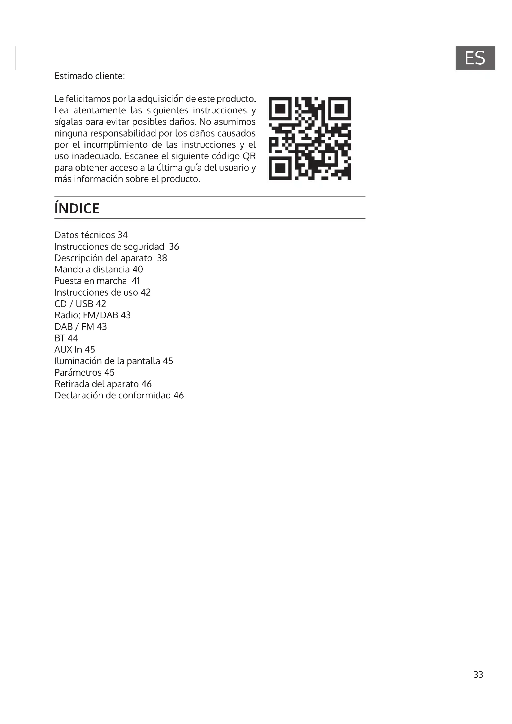 ÍNDICE Datos técnicos 34 Instrucciones de seguridad 36 Descripción del aparato 38 Mando a distancia 40 Puesta en marcha 41 Instrucciones de uso 42 CD / USB 42 Radio: FM/DAB 43 DAB / FM 43 BT 44 AUX In 45 Iluminación de la pantalla 45 Parámetros 45 Retirada del aparato 46 Declaración de conformidad 46 Estimado cliente: Le felicitamos por la adquisición de este producto. Lea atentamente las siguientes instrucciones y sígalas para evitar posibles daños. No asumimos ninguna responsabilidad por los daños causados por el incumplimiento de las instrucciones y el uso inadecuado. Escanee el siguiente código QR para obtener acceso a la última guía del usuario y más información sobre el producto.34