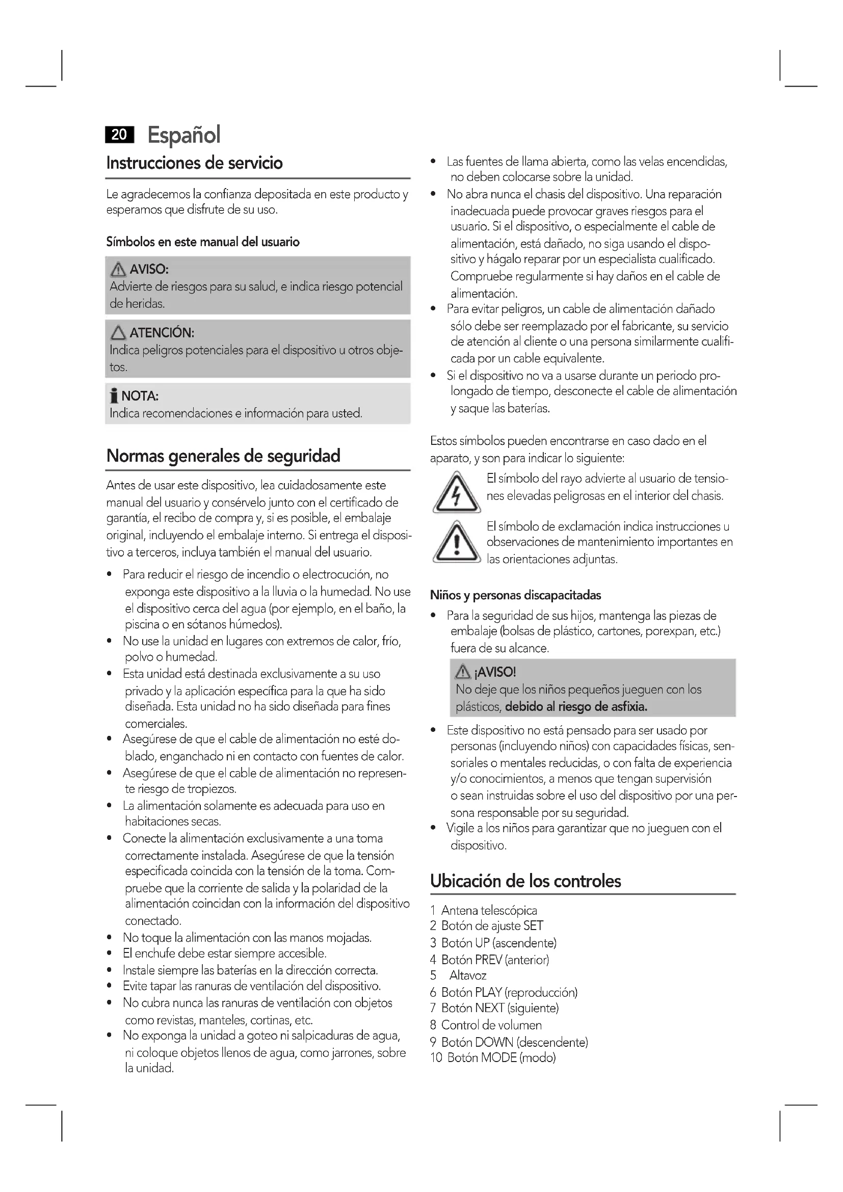 - Sieldispositivonovaausarseduranteunperiodopro- longado de tiempo, desconecte el cable de alimentación y saque las baterías. Estos símbolos pueden encontrarse en caso dado en el aparato, y son para indicar lo siguiente: El símbolo del rayo advierte al usuario de tensio- nes elevadas peligrosas en el interior del chasis. Elsímbolodeexclamaciónindicainstruccionesu observaciones de mantenimiento importantes en las orientaciones adjuntas. Niños y personas discapacitadas