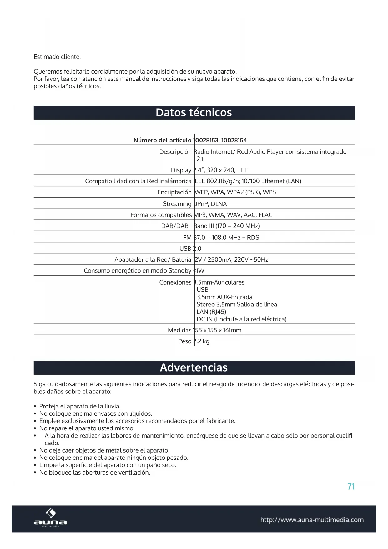 Display 2.4“, 320 x 240, TFT Compatibilidad con la Red inalámbrica IEEE 802.11b/g/n; 10/100 Ethernet (LAN) Encriptación WEP, WPA, WPA2 (PSK), WPS Streaming UPnP, DLNA Formatos compatibles MP3, WMA, WAV, AAC, FLAC DAB/DAB+ Band III (170 – 240 MHz) FM 87.0 – 108.0 MHz + RDS USB 2.0 Apaptador a la Red/ Batería 12V / 2500mA; 220V ~50Hz Consumo energético en modo Standby <1W Conexiones 3,5mm-Auriculares USB 3.5mm AUX-Entrada Stereo 3,5mm Salida de línea LAN (RJ45) DC IN (Enchufe a la red eléctrica) Medidas 155 x 155 x 161mm Peso 2,2 kg Advertencias Siga cuidadosamente las siguientes indicaciones para reducir el riesgo de incendio, de descargas eléctricas y de posi- bles daños sobre el aparato: