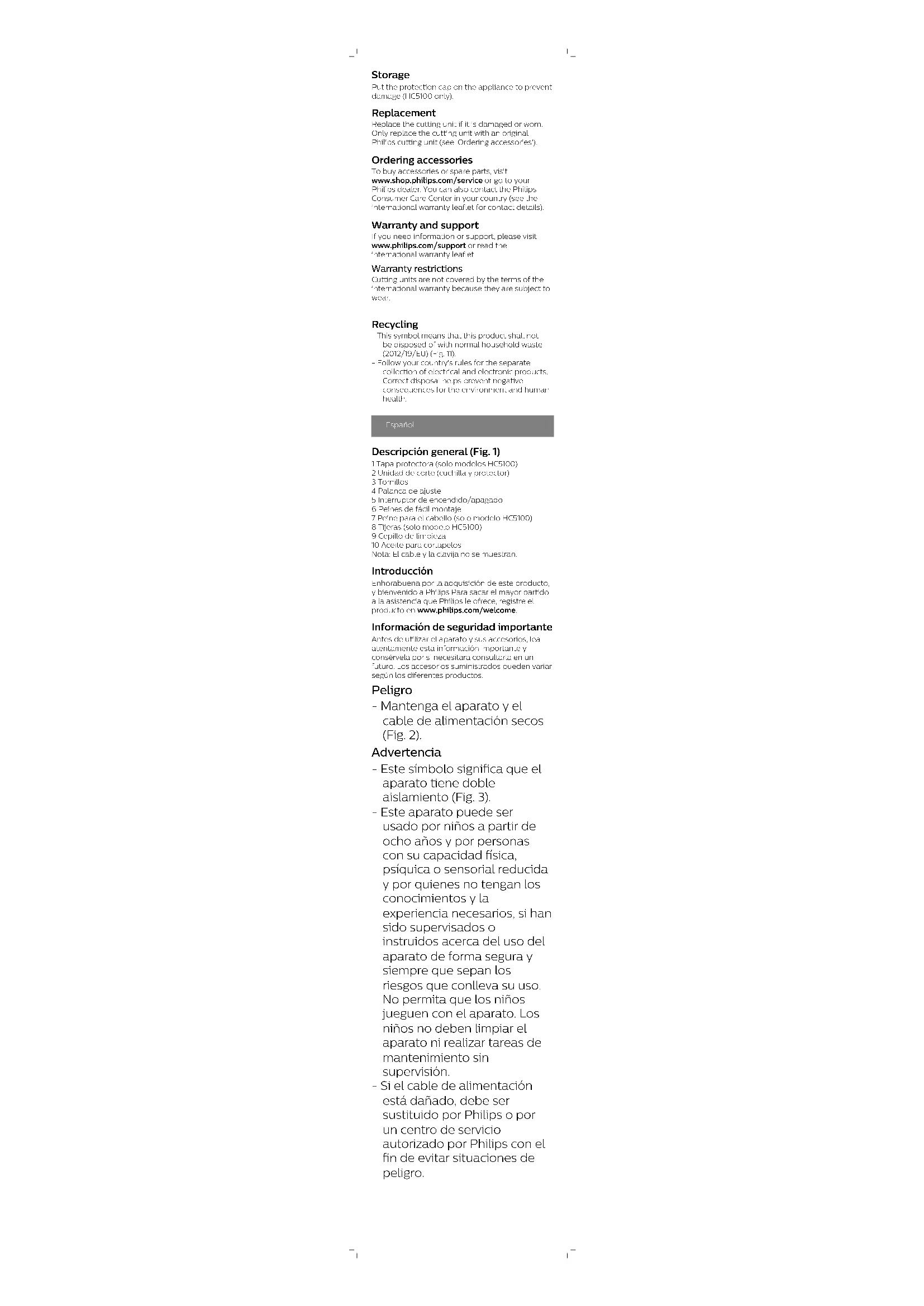 Recycling - This symbol means that this product shall not be disposed of with normal household waste (2012/19/EU) (Fig. 11). - Follow your country's rules for the separate collection of electrical and electronic products. Correct disposal helps prevent negative consequences for the environment and human health. Español Descripción general (Fig. 1) 1 Tapa protectora (solo modelos HC5100) 2 Unidad de corte (cuchilla y protector) 3 Tornillos 4 Palanca de ajuste 5 Interruptor de encendido/apagado 6 Peines de fácil montaje 7 Peine para el cabello (solo modelo HC5100) 8 Tijeras (solo modelo HC5100) 9 Cepillo de limpieza 10 Aceite para cortapelos Nota: El cable y la clavija no se muestran. Introducción Enhorabuena por la adquisición de este producto, y bienvenido a Philips Para sacar el mayor partido a la asistencia que Philips le ofrece, registre el producto en www.philips.com/welcome. Información de seguridad importante Antes de utilizar el aparato y sus accesorios, lea atentamente esta información importante y consérvela por si necesitara consultarla en un futuro. Los accesorios suministrados pueden variar según los diferentes productos. Peligro - Mantenga el aparato y el cable de alimentación secos (Fig. 2). Advertencia - Este símbolo significa que el aparato tiene doble aislamiento (Fig. 3). - Este aparato puede ser usado por niños a partir de ocho años y por personas con su capacidad física, psíquica o sensorial reducida y por quienes no tengan los conocimientos y la experiencia necesarios, si han sido supervisados o instruidos acerca del uso del aparato de forma segura y siempre que sepan los riesgos que conlleva su uso. No permita que los niños jueguen con el aparato. Los niños no deben limpiar el aparato ni realizar tareas de mantenimiento sin supervisión. - Si el cable de alimentación está dañado, debe ser sustituido por Philips o por un centro de servicio autorizado por Philips con el fin de evitar situaciones de peligro.- Compruebe siempre el aparato antes de utilizarlo. No utilice el aparato si está dañado, ya que podría ocasionar lesiones. Sustituya las piezas dañadas por repuestos originales. Precaución - Utilice este aparato solo para el uso al que está destinado como se indica en el manual de usuario. - Por razones de higiene, el aparato debería ser usado únicamente por una persona. - No utilice nunca aire comprimido, estropajos, agentes de limpieza abrasivos ni líquidos agresivos, como gasolina o acetona, para limpiar el aparato. Campos electromagnéticos (CEM) Este Philips cumple los estándares y las normativas aplicables sobre exposición a campos electromagnéticos. General - Este aparato es adecuado para voltajes de red de 220 a 240voltios. Uso del aparato Nota: Asegúrese de que el pelo esté limpio y seco. No utilice el aparato en cabello recién lavado. Consejos y trucos - Para cortar de la forma más eficaz, desplace el aparato en dirección contraria a la de crecimiento del pelo. - Debido a que el cabello crece en direcciones diferentes, necesita mover el aparato en diferentes direcciones (hacia arriba, hacia abajo o en diagonal). - Haga pasadas que se solapen por toda la cabeza para asegurarse de que el aparato atrape todo el cabello que quiera cortar. - Asegúrese de que la parte plana del peine-guía esté completamente en contacto con el cuero cabelludo para conseguir un corte uniforme. - Si desea perfilar el contorno, incline el aparato. - Elimine con regularidad el pelo cortado del peine-guía para el pelo. Si se ha acumulado mucho pelo en el peine, elimínelo del aparato soplando o sacudiéndolo. Extracción y colocación de los peines de fácil montaje 1 Para quitar un peine del elemento de corte, suba el gancho de la parte trasera del peine y desengánchelo por delante (Fig. 4). 2 Para colocar un peine en el elemento de corte, acóplelo en la parte delantera del elemento de corte y empuje hacia abajo por detrás ('hasta que encaje') (Fig. 5). Preparación para su uso Utilice la palanca de ajuste del lado izquierdo del aparato para establecer la longitud del cabello deseada. Mueva la palanca hacia arriba para reducir la longitud de corte y hacia abajo para aumentarla. Cuando oiga un chasquido, habrá llegado al siguiente ajuste (Fig. 6) de longitud. Encendido y apagado del aparato 1 Para encender el aparato, deslice el botón de encendido/apagado hacia arriba (Fig. 9). 2 Para apagar el aparato, deslice el botón de encendido/apagado hacia abajo (Fig. 9). Corte con peine de fácil montaje 1 Coloque el peine que desee en el aparato ('hasta que encaje') (Fig. 5). 2 Encienda el aparato (Fig. 9). 3 Coloque el peine en el cuero cabelludo y mueva el aparato por el cabello lentamente. Tamaños de peine Tamaños de peine en