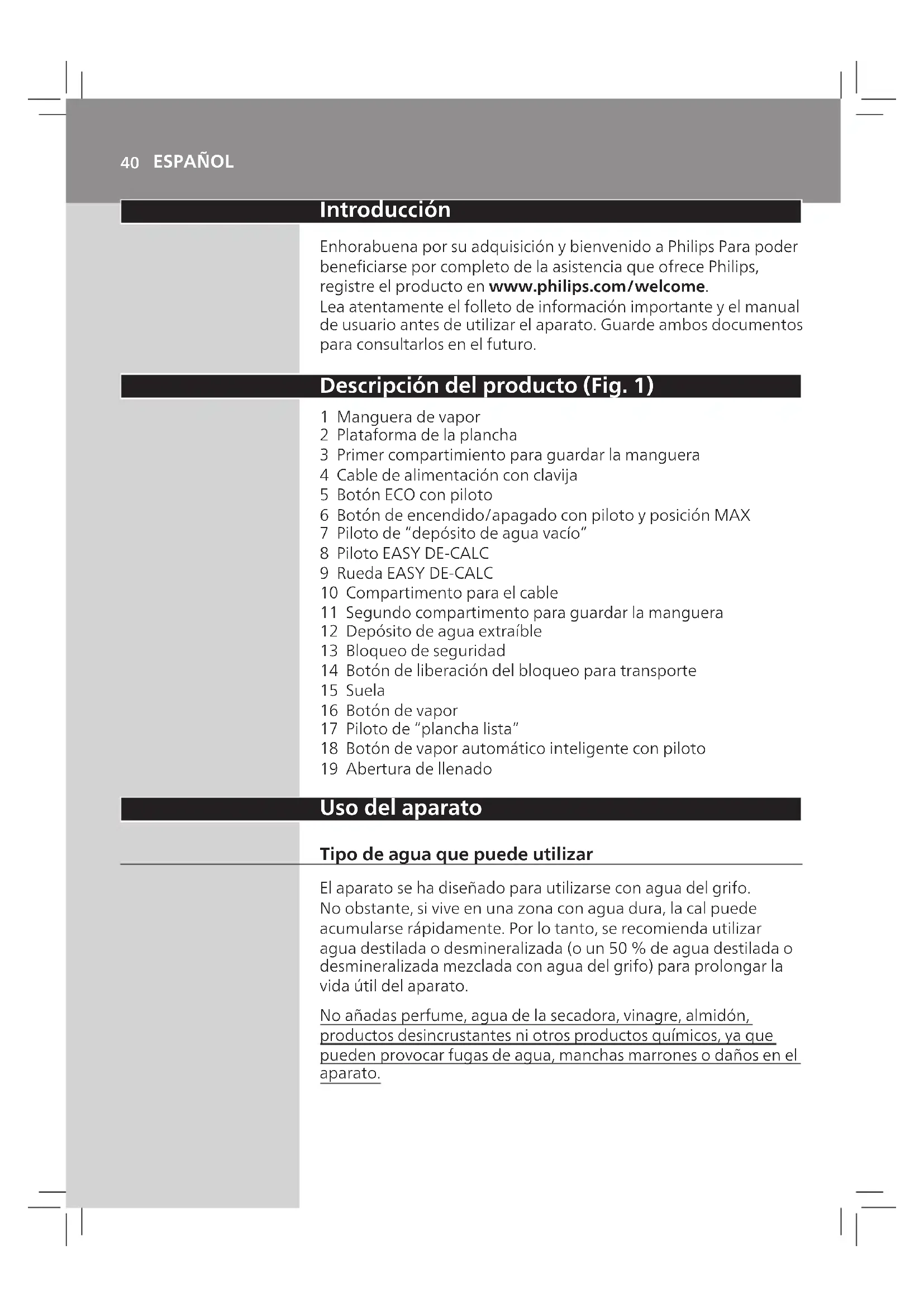 Es muy importante utilizar la función EASY DE-CALC en cuanto el piloto EASY DE-CALC empiece a parpadear y la plancha emita un pitido continuo. El piloto EASY DE-CALC parpadea y la plancha comienza a emitir un pitido continuo después de aproximadamente un mes o diez sesiones de planchado para indicar que debe eliminar los depósitos de cal del aparato. Realice el siguiente procedimiento de EASY DE-CALC antes de seguir planchando. Para evitar el riesgo de quemaduras, desenchufe la plancha y deje que se enfríe durante al menos dos horas antes de realizar el procedimiento de EASY DE-CALC.46 ESPAÑOL 1 Desenchufelaclavijadelatomadecorriente. 2 Coloquelaplanchasobreelbordedelamesa. 3 Coloqueunvaso(conunacapacidaddealmenos350ml) debajodelaruedaEASYDE-CALCygírelaenelsentido contrarioaldelasagujasdelreloj. 4 QuitelaruedaEASYDE-CALCydejequeelaguacon partículasdecaluyahaciaelvaso. 5 Cuandonosalgamásaguadelaplancha,vuelvaacolocar laruedaEASYDE-CALCygírelaenelsentidodelasagujas delrelojparajarla. 6 Puedeseguirutilizandolaplanchainmediatamente despuésdeterminarelprocedimientodeEASYDE-CALC. IMPORTANTE: Eliminación de los depósitos de cal de la suela Si no utiliza la función EASY DE-CALC con regularidad, es posible que las partículas de cal se acumulen en la suela y salgan manchas marrones de la suela durante el planchado. En esta situación, es necesario eliminar los depósitos de cal de la suela mediante el siguiente procedimiento. Le aconsejamos que repita el procedimiento dos veces para una mayor limpieza.47 ESPAÑOL Para evitar el riesgo de quemaduras, desenchufe la plancha y deje que se enfríe durante al menos dos horas antes de eliminar los depósitos de cal de la suela. 1 Desenchufelaclavijadelatomadecorriente. 2 Coloquelaplanchasobreelbordedelamesa. 3 Asegúresedequeeldepósitodeaguaestávacío. 4 Coloqueunvaso(conunacapacidaddealmenos350ml) debajodelaruedaEASYDE-CALCygírelaenelsentido contrarioaldelasagujasdelreloj. 5 QuitelaruedaEASYDE-CALCydejequeelaguacon partículasdecaluyahaciaelvaso. 6 SostengalaplanchademodoquelaaperturadeEASYDE- CALCquedehaciaarribayvierta900mldeaguadestilada en ella. Nota: Tenga en cuenta el peso de la plancha al inclinarla. 7 MantengalaaperturadeEASYDE-CALCmirandohacia arriba,vuelvaacolocarlaruedaEASYDE-CALCygírelaen elsentidodelasagujasdelrelojparajarla.48 ESPAÑOL 8 Coloquedenuevolaplanchaenunasupercieestabley plana. Enchufe y encienda la plancha. 9 Esperecincominutoshastaquesecaliente. 10 Mantengapulsadoelbotóndevapormientrasmueve laplanchasobreuntrozodepañogruesodurante tresminutos. Advertencia: Sale agua caliente y sucia por la suela. 11 Dejedemoverlaplanchacuandonosalgamásaguao empieceasalirvapor. 12 Puedecontinuarutilizandolaplanchainmediatamente. Delocontrario,desenchufelaplanchacuandoterminede eliminarlosdepósitosdecal. Almacenamiento 1 Apagueydesenchufelaplancha. 2 Extraigayvacíeeldepósitodeagua. 3 Coloquelaplanchaensuplataforma.Pulseelbloqueode transporteparabloquearlaplanchaenlaplataforma. 4 Doblelamanguerayelcabledealimentación.Colóquelos ensusrespectivoscompartimentos. 5 Puedetransportarlaplanchaconunamanopormediode la empuñadura de la plancha. No transporte el aparato sujetándolo por la palanca para liberar el depósito de agua.49 ESPAÑOL Solución de problemas En este capítulo se resumen los problemas más frecuentes que pueden surgir con el aparato. Si no puede resolver el problema con la siguiente información, visite www.philips.com/support para consultar una lista de preguntas más frecuentes o póngase en contacto con el servicio de atención al cliente en su país. Problema Posiblecausa Solución La funda de la tabla de planchar se moja o aparecen gotas de agua en la prenda durante el planchado. Se ha condensado vapor en la funda de la tabla de planchar después de una sesión larga de planchado. Sustituya la funda de la tabla de planchar si la espuma está desgastada. También puede añadir una capa adicional de eltro debajo de la funda de la tabla de planchar para evitar la condensación. Puede adquirir eltro en una tienda de telas. Puede que la funda de su tabla de planchar no esté diseñada para soportar el elevado ujo de vapor del aparato. Coloque una capa adicional de eltro debajo de la funda de la tabla de planchar para evitar la condensación en la tabla de planchar. Puede adquirir eltro en una tienda de telas. Salen gotitas de agua por la suela. El vapor que había en la manguera se enfría y se condensa en forma de agua. Esto hace que salgan gotitas de agua por la suela. Expulse el vapor lejos de la prenda durante unos segundos. Sale vapor o agua por debajo de la rueda EASY DE- CALC. La rueda EASY DE-CALC no se ha apretado correctamente. Apague la plancha y deje que se enfríe durante doshoras. Desenrosque la rueda EASY DE-CALC y vuelva a enroscarla correctamente en la plancha. Nota: Puede que se escape un poco de agua al quitar la rueda. La junta de goma de la rueda EASY DE-CALC está desgastada. Póngase en contacto con un centro de servicio autorizado por Philips para obtener una rueda EASY DE-CALC nueva. Sale agua sucia e impurezas por la suela o la suela está sucia. Las impurezas o los componentes químicos del agua se han depositado en los oricios de salida del vapor o en la suela. Limpie la suela con un paño húmedo. Se ha acumulado demasiada cal y partículas minerales dentro del aparato. Elimine los depósitos de cal de la plancha con regularidad (consulte el capítulo “Importante: ELIMINACIÓN DE