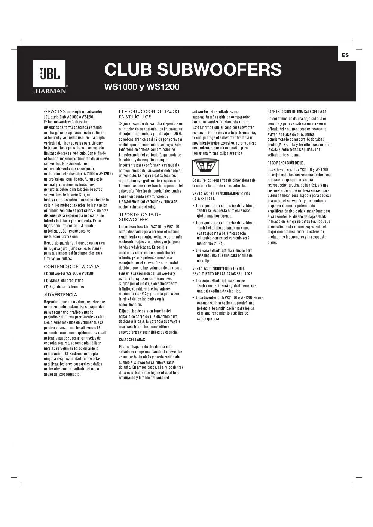 HARMAN International Industries, Inc. 8500 Balboa Boulevard, Northridge, CA 91329 USA www.jbl.com© 2015 HARMAN International Industries, Incorporated. Tous droits réservés. JBL est une marque commerciale de HARMAN International Industries, Incorporated, déposée aux États-Unis et/ou dans d’autres pay.GRACIAS por elegir un subwoofer JBL serie Club WS1000 o WS1200. Estos subwoofers Club están diseñados de forma adecuada para una amplia gama de aplicaciones de audio de automóvil y se pueden usar en una amplia variedad de tipos de cajas para obtener bajos amplios y potentes con un espacio limitado dentro del vehículo. Con el fin de obtener el máximo rendimiento de su nuevo subwoofer, le recomendamos encarecidamente que encargue la instalación del subwoofer WS1000 o WS1200 a un profesional cualificado. Aunque este manual proporciona instrucciones generales sobre la instalación de estos subwoofers de la serie Club, no incluye detalles sobre la construcción de la caja ni los métodos exactos de instalación en ningún vehículo en particular. Si no cree disponer de la experiencia necesaria, no intente instalarlo por su cuenta. En su lugar, consulte con su distribuidor autorizado JBL las opciones de instalación profesional. Recuerde guardar su tique de compra en un lugar seguro, junto con este manual, para que ambos estén disponibles par