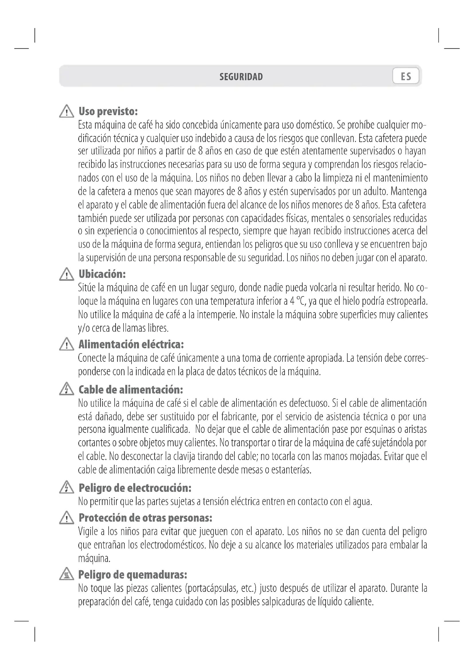 - Instantheizer aus Aluminium mit TemperatursondeES Uso previsto: Esta máquina de café ha sido concebida únicamente para uso doméstico. Se prohíbe cualquier mo- dificación técnica y cualquier uso indebido a causa de los riesgos que conllevan. Esta cafetera puede ser utilizada por niños a partir de 8 años en caso de que estén atentamente supervisados o hayan recibido las instrucciones necesarias para su uso de forma segura y comprendan los riesgos relacio- nados con el uso de la máquina. Los niños no deben llevar a cabo la limpieza ni el mantenimiento de la cafetera a menos que sean mayores de 8 años y estén supervisados por un adulto. Mantenga el aparato y el cable de alimentación fuera del alcance de los niños menores de 8 años. Esta cafetera también puede ser utilizada por personas con capacidades físicas, mentales o sensoriales reducidas o sin experiencia o conocimientos al respecto, siempre que hayan recibido instrucciones acerca del uso de la máquina de forma segura, entiendan los peligros que su uso conlleva y se encuentren bajo la supervisión de una persona responsable de su seguridad. Los niños no deben jugar con el aparato. Ubicación: Sitúe la máquina de café en un lugar seguro, donde nadie pueda volcarla ni resultar herido. No co- loque la máquina en lugares con una temperatura inferior a 4 °C, ya que el hielo podría estropearla. No utilice la máquina de café a la intemperie. No instale la máquina sobre superficies muy calientes y/o cerca de llamas libres. Alimentación eléctrica: Conecte la máquina de café únicamente a una toma de corriente apropiada. La tensión debe corres- ponderse con la indicada en la placa de datos técnicos de la máquina. Cable de alimentación: No utilice la máquina de café si el cable de alimentación es defectuoso. Si el cable de alimentación está dañado, debe ser sustituido por el fabricante, por el servicio de asistencia técnica o por una persona igualmente cualificada. No dejar que el cable de alimentación pase por esquinas o aristas cortantes o sobre objetos muy calientes. No transportar o tirar de la máquina de café sujetándola por el cable. No desconectar la clavija tirando del cable; no tocarla con las manos mojadas. Evitar que el cable de alimentación caiga libremente desde mesas o estanterías. Peligro de electrocución: No permitir que las partes sujetas a tensión eléctrica entren en contacto con el agua. Protección de otras personas: Vigile a los niños para evitar que jueguen con el aparato. Los niños no se dan cuenta del peligro que entrañan los electrodomésticos. No deje a su alcance los materiales utilizados para embalar la máquina. Peligro de quemaduras: No toque las piezas calientes (portacápsulas, etc.) justo después de utilizar el aparato. Durante la preparación del café, tenga cuidado con las posibles salpicaduras de líquido caliente. SEGURIDADITES Limpieza: Antes de limpiar la máquina, es indispensable que desconecte la clavija de la toma de corriente y que espere a que la máquina se enfríe. ¡No sumerja la máquina en agua! Está totalmente prohibido manipular el interior de la máquina. Sustituya el agua del depósito tras varios días de desuso. Almacenamiento de la máquina: Cuando la máquina permanezca en desuso durante un periodo de tiempo prolongado, desconecte la clavija de la toma de corriente y guárdela en un lugar seco al que los niños no puedan acceder. Protéjala del polvo y la suciedad. Reparaciones/mantenimiento: En caso de averías, defectos o sospecha de avería después de una caída, desconecte inmediatamente la clavija de la toma de corriente. No utilice una máquina defectuosa. Solo los Centros de Asistencia Técnica autorizados pueden manipular la máquina y repararla. En caso de que se manipule la má- quina en centros no autorizados, se declina cualquier responsabilidad por los posibles daños que puedan producirse. Depósito de agua: Vierta en el depósito únicamente agua fresca potable sin gas. No ponga en marcha la máquina si no hay suficiente agua en el depósito. Ranura para la inserción de cápsulas: En la ranura para la inserción de cápsulas solo deben introducirse cápsulas compatibles. No introduz- ca los dedos ni cualquier otro cuerpo extraño. Las cápsulas solo deben utilizarse una vez. Eliminación de la máquina al final de su vida útil: INFORMACIÓN PARA LOS USUARIOS: de acuerdo con las Directivas 2002/95/CE, 2002/96/CE Y 2003/108/CE (y modificaciones siguientes), relativas a la reducción del uso de sustancias peligrosas en los aparatos eléctricos y electrónicos, como así también al procedimiento de eliminación de los residuos procedentes de los mismos. El símbolo de la cuba tachada en la máquina y en su embalaje, según lo previsto por la directiva Europea 2002/96/CE, indica que el producto, al llegar al final de su vida útil, debe ser sometido a recogida diferenciada. La máquina se entregará a un centro de recogida adecuado. Para mayor información acerca de la correcta eliminación de los desechos, los responsables deben dirigirse al servicio público específico o a los revendedores de máquinas nuevas. SEGURIDADES