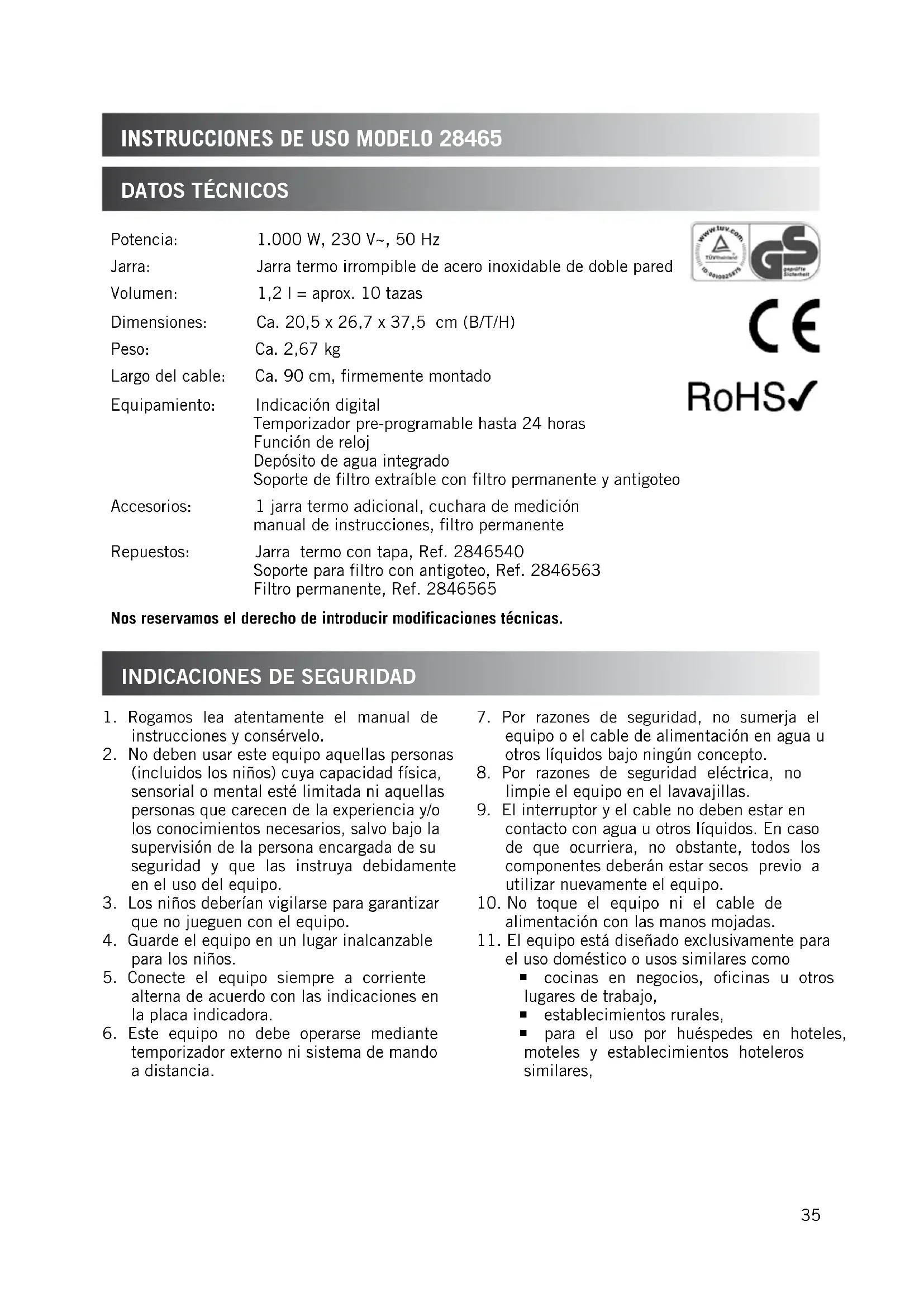 el uso doméstico o usos similares como cocinas en negocios, oficinas u otros lugares de trabajo, establecimientos rurales, para el uso por huéspedes en hoteles, moteles y establecimientos hoteleros similares, Potencia: 1.000 W, 230 V~, 50 Hz Jarra: Jarra termo irrompible de acero inoxidable de doble pared Volumen: 1,2 l = aprox. 10 tazas Dimensiones: Ca. 20,5 x 26,7 x 37,5 cm (B/T/H) Peso: Ca. 2,67 kg Largo del cable: Ca. 90 cm, firmemente montado Equipamiento: Indicación digital Temporizador pre-programable hasta 24 horas Función de reloj Depósito de agua integrado Soporte de filtro extraíble con filtro permanente y antigoteo Accesorios: 1 jarra termo adicional, cuchara de medición manual de instrucciones, filtro permanente Repuestos: Jarra termo con tapa, Ref. 2846540 Soporte para filtro con antigoteo, Ref. 2846563 Filtro permanente, Ref. 2846565 Nos reservamos el derecho de introducir modificaciones técnicas.36 consejo para Disfrutar De un café excelente en pensiones privadas o casas vacacionales.