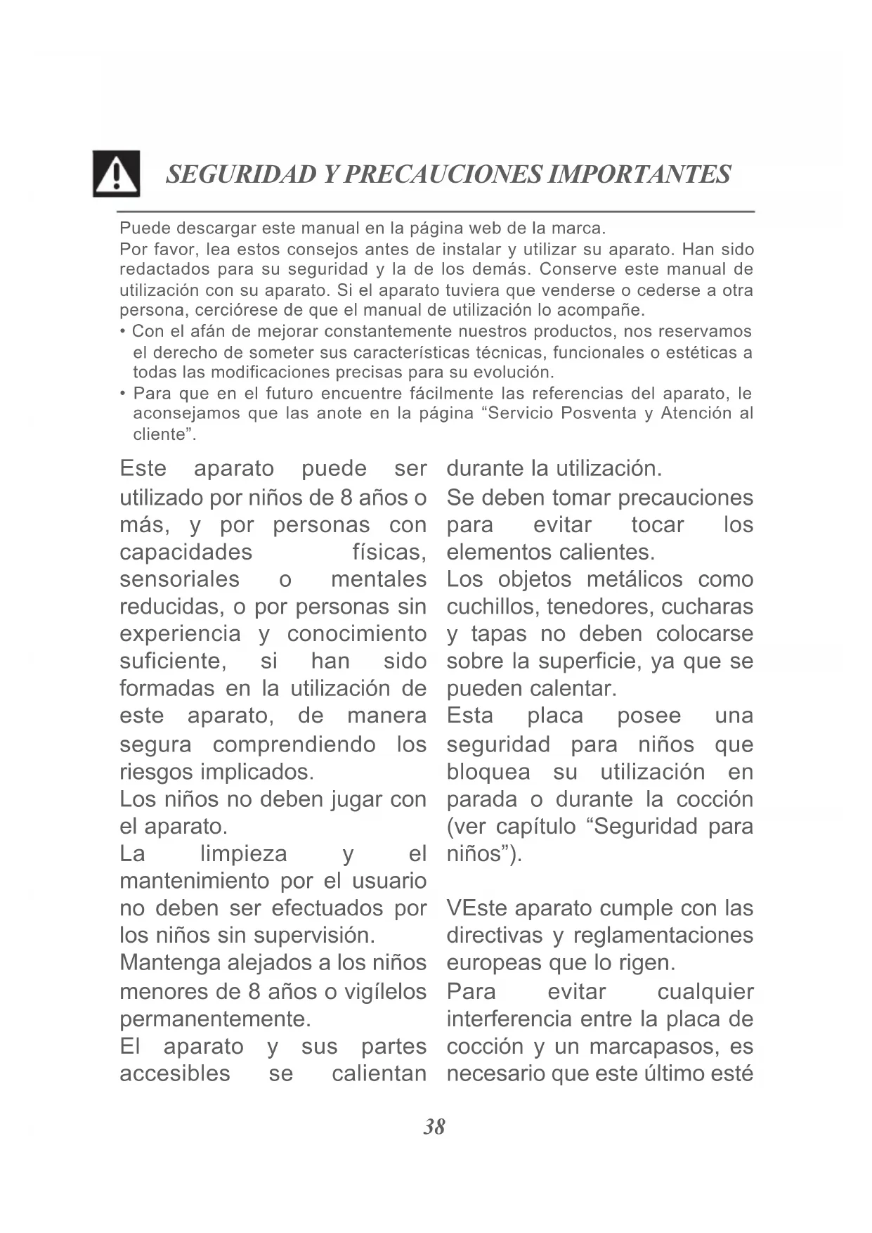 - Para que en el futuro encuentre fácilmente las referencias del aparato, le aconsejamos que las anote en la página “Servicio Posventa y Atención al cliente”. Este aparato puede ser utilizado por niños de 8 años o más, y por personas con capacidades físicas, sensoriales o mentales reducidas, o por personas sin experiencia y conocimiento suficiente, si han sido formadas en la utilización de este aparato, de manera segura comprendiendo los riesgos implicados. Los niños no deben jugar con el aparato. La limpieza y el mantenimiento por el usuario no deben ser efectuados por los niños sin supervisión. Mantenga alejados a los niños menores de 8 años o vigílelos permanentemente. El aparato y sus partes accesibles se calientan durante la utilización. Se deben tomar precauciones para evitar tocar los elementos calientes. Los objetos metálicos como cuchillos, tenedores, cucharas y tapas no deben colocarse sobre la superficie, ya que se pueden calentar. Esta placa posee una seguridad para niños que bloquea su utilización en parada o durante la cocción (ver capítulo “Seguridad para niños”). VEste aparato cumple con las directivas y reglamentaciones europeas que lo rigen. Para evitar cualquier interferencia entre la placa de cocción y un marcapasos, es necesario que este último esté39