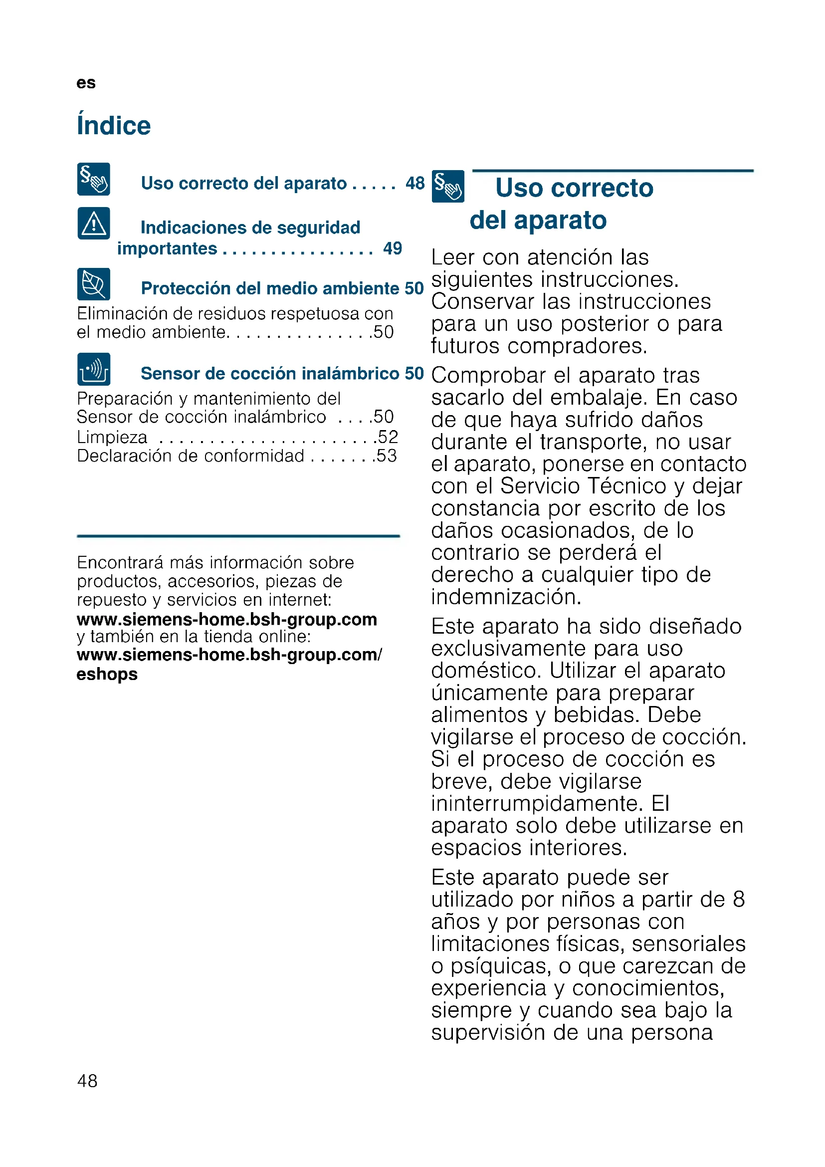 - Declaración de conformidad Produktinfo Encontrará más información sobre productos, accesorios, piezas de repuesto y servicios en internet: www.siemens-home.bsh-group.com y también en la tienda online: www.siemens-home.bsh-group.com/ eshops 8 Uso correcto del aparato Uso correcto del aparato Leer con atención las siguientes instrucciones. Conservar las instrucciones para un uso posterior o para futuros compradores. Comprobar el aparato tras sacarlo del embalaje. En caso de que haya sufrido daños durante el transporte, no usar el aparato, ponerse en contacto con el Servicio Técnico y dejar constancia por escrito de los daños ocasionados, de lo contrario se perderá el derecho a cualquier tipo de indemnización. Este aparato ha sido diseñado exclusivamente para uso doméstico. Utilizar el aparato únicamente para preparar alimentos y bebidas. Debe vigilarse el proceso de cocción. Si el proceso de cocción es breve, debe vigilarse ininterrumpidamente. El aparato solo debe utilizarse en espacios interiores. Este aparato puede ser utilizado por niños a partir de 8 años y por personas con limitaciones físicas, sensoriales o psíquicas, o que carezcan de experiencia y conocimientos, siempre y cuando sea bajo la supervisión de una personaes p. 53