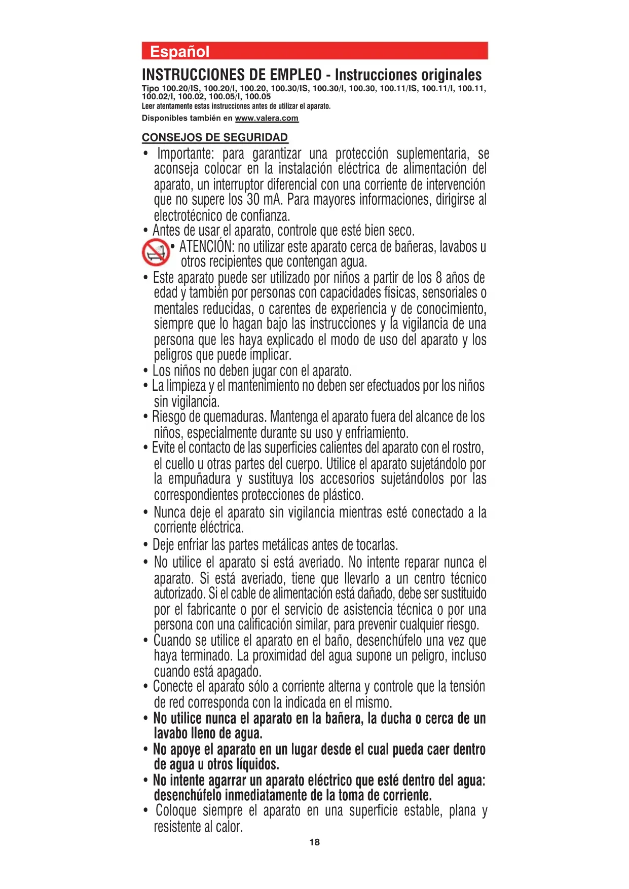 SEGURIDAD y FUNCIÓN “HOT” El aparato se apaga automáticamente a los 60 minutos del encendido: - en los modelos 100.20/IS, 100.20/I, 100.20, 100.30/IS, 100.30/I, 100.30, 100.11/IS, 100.11/I, 100.11, 5 minutos antes del apagado automático, en el display (fig. 1, ref. 7) se alternan la temperatura y “off”. Pasados los 60 minutos, si no se vuelve a activar la tecla de encendido (fig. 1, ref. 3), las placas (fig. 1, ref. 2) empiezan a enfriarse; en el display aparece “Hot”, que se mantiene visible, hasta alcanzar una temperatura suficientemente baja para no quemarse con las placas metálicas. - en los modelos 100.02/I, 100.02, 100.05/I y 100.05, 5 minutos antes del apagado automático, el led (fig. 1, ref. 6) parpadea muy lentamente. Pasados los 60 minutos, si no se vuelve a activar la tecla de encendido (fig. 1, ref. 3), las placas (fig. 1, ref. 2) empiezan a enfriarse y el led parpadea rápidamente, hasta alcanzar una temperatura suficientemente baja para no quemarse con las placas metálicas. 00060777 int 2018_12_Layout 1 05/02/2019 16:45 Pagina 1920 VALERA es una marca registrada de Ligo Electric S.A. - Suiza El símbolo en el producto o en su embalaje indica que este producto no se puede tratar como desperdicios normales de hogar. El producto con este indicativo se debe entregar en el punto de recolección de equipos eléctricos y electrónicos para reciclaje. Al asegurarse de que este producto se desecha correctamente, usted ayudara a evitar posibles consecuencias negativas para el medio ambiente y la salud publica, lo cual podría ocurrir si este producto no se recicla de forma adecuada. Para obtener información mas detallada sobre el reciclaje de este producto, póngase en contacto con la administración publica de su ciudad, servicio de desechos del hogar o bien con la tienda o distribuidor donde lo compró.