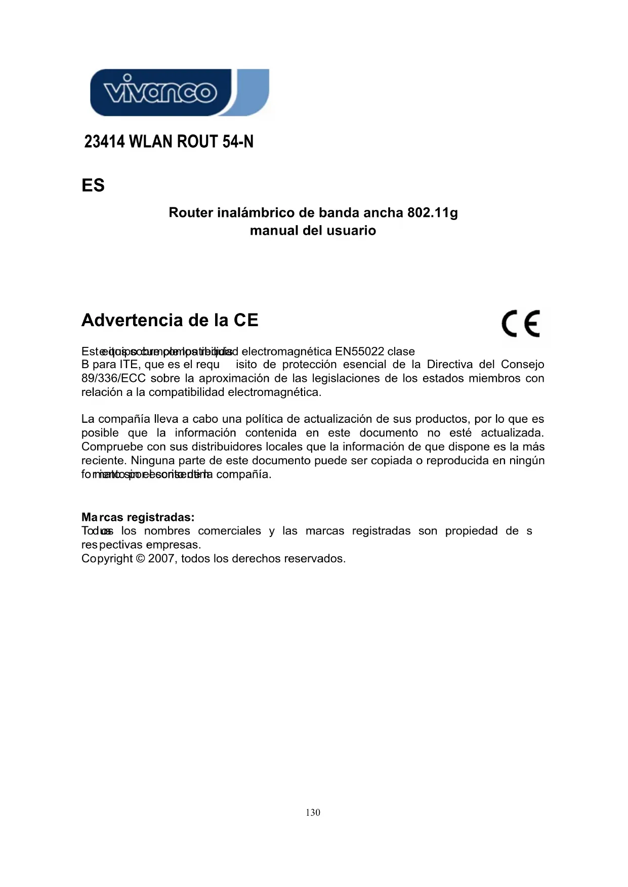 Router inalámbrico de banda ancha 802.11g ual del usuario Advertencia de la C e itos sobre compatibilidad electromagnética EN55022 clase isito de protección esencial de la Directiva del Consejo ción de las legislaciones de los estados miembros con ctromagnética. La compañía lleva a cabo una política de actualización de sus productos, por lo que es posible que la información contenida en este documento no esté actualizada. ción de que dispone es la más ciente. Ninguna parte de este documento puede ser copiada o reproducida en ningún r iento por escrito de la compañía.