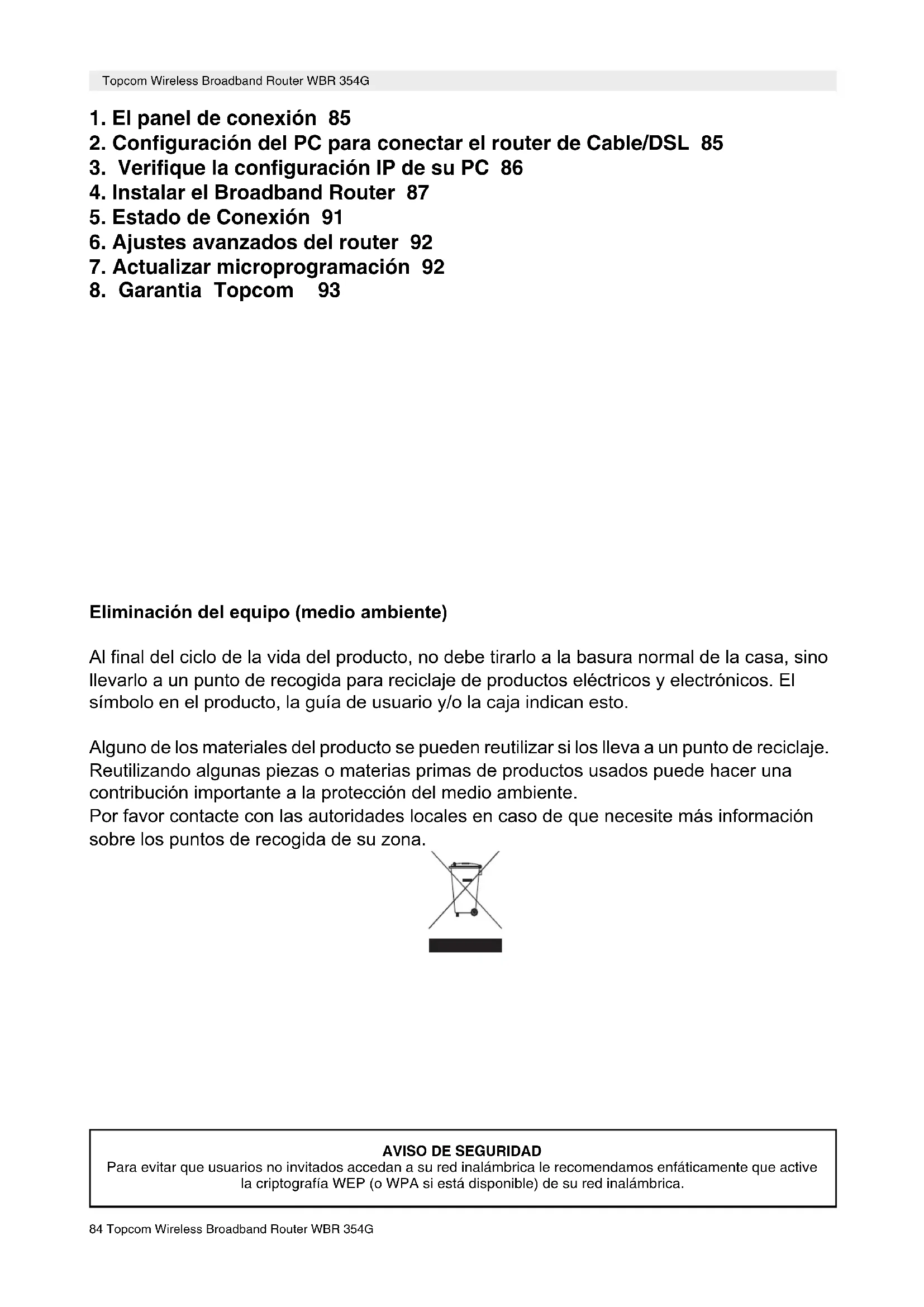 Para evitar que usuarios no invitados accedan a su red inalámbrica le recomendamos enfáticamente que active la criptografía WEP (o WPA si está disponible) de su red inalámbrica.Topcom Wireless Broadband Router WBR 354G 85 ESPAÑOL Topcom Wireless Broadband Router WBR 354G