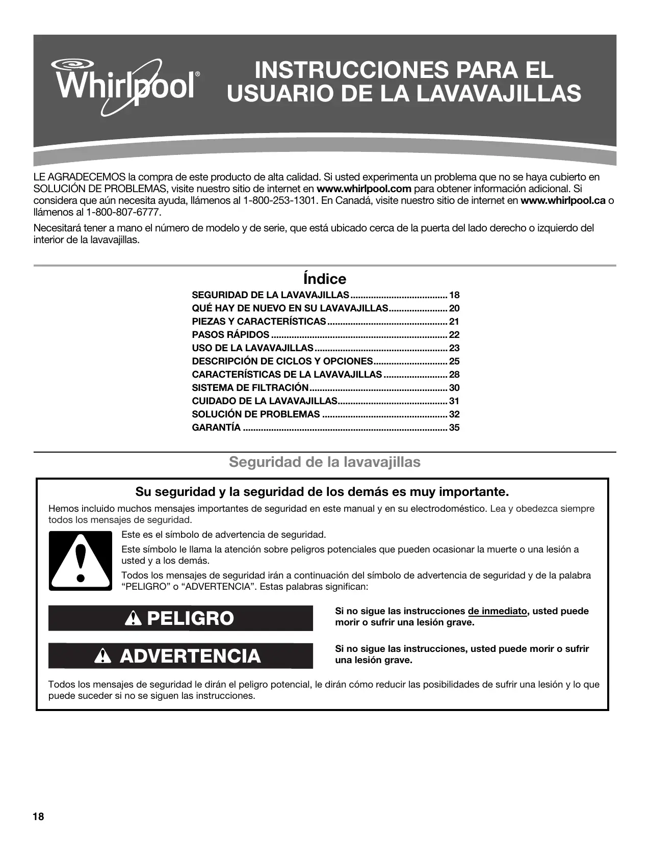 SOLUCIÓN DE PROBLEMAS, visite nuestro sitio de internet en www.whirlpool.com para obtener información adicional. Si considera que aún necesita ayuda, llámenos al 1-800-253-1301. En Canadá, visite nuestro sitio de internet en www.whirlpool.ca o llámenos al 1-800-807-6777. Necesitará tener a mano el número de modelo y de serie, que está ubicado cerca de la puerta del lado derecho o izquierdo del interior de la lavavajillas.
