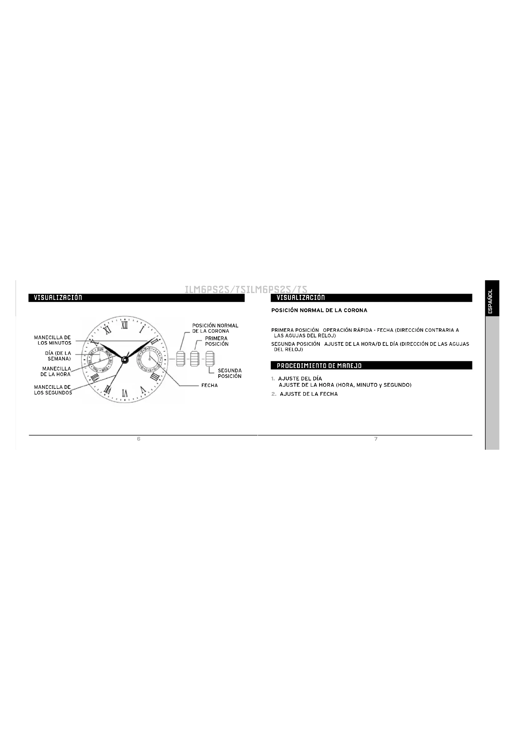 No ajuste la fecha entre las 9:00 p.m. y las 0:30 a.m. La fecha podría no cambiar correctamente al día siguiente.13 English En aplicación de la normativa sobre los desechos de equipos eléctricos y electrónicos, los productos de relojería de cuarzo que se encuentran al final de su vida útil deben ser sometidos a una recogida selectiva en vistas a su posterior tratamiento. También puede depositar nuestros productos de relojería de cuarzo en uno de nuestros puntos de venta autorizados, así como en cualquier punto de recogida habilitado. La recogida selectiva, el tratamiento, la valoración y el reciclaje contribuyen a la salvaguarda de nuestro medio ambiente y a la protección de nuestra salud. ILM6P25/75 INSTRUCTION MANUAL Display