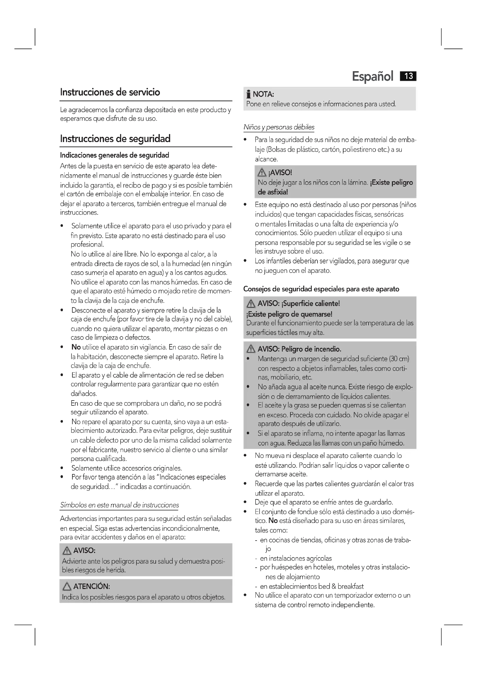 - Losinfantilesdeberíanservigilados,paraasegurarque no jueguen con el aparato. Consejos de seguridad especiales para este aparato AVISO: ¡Superficie caliente! ¡Existe peligro de quemarse! Durante el funcionamiento puede ser la temperatura de las superficies táctiles muy alta. AVISO: Peligro de incendio.