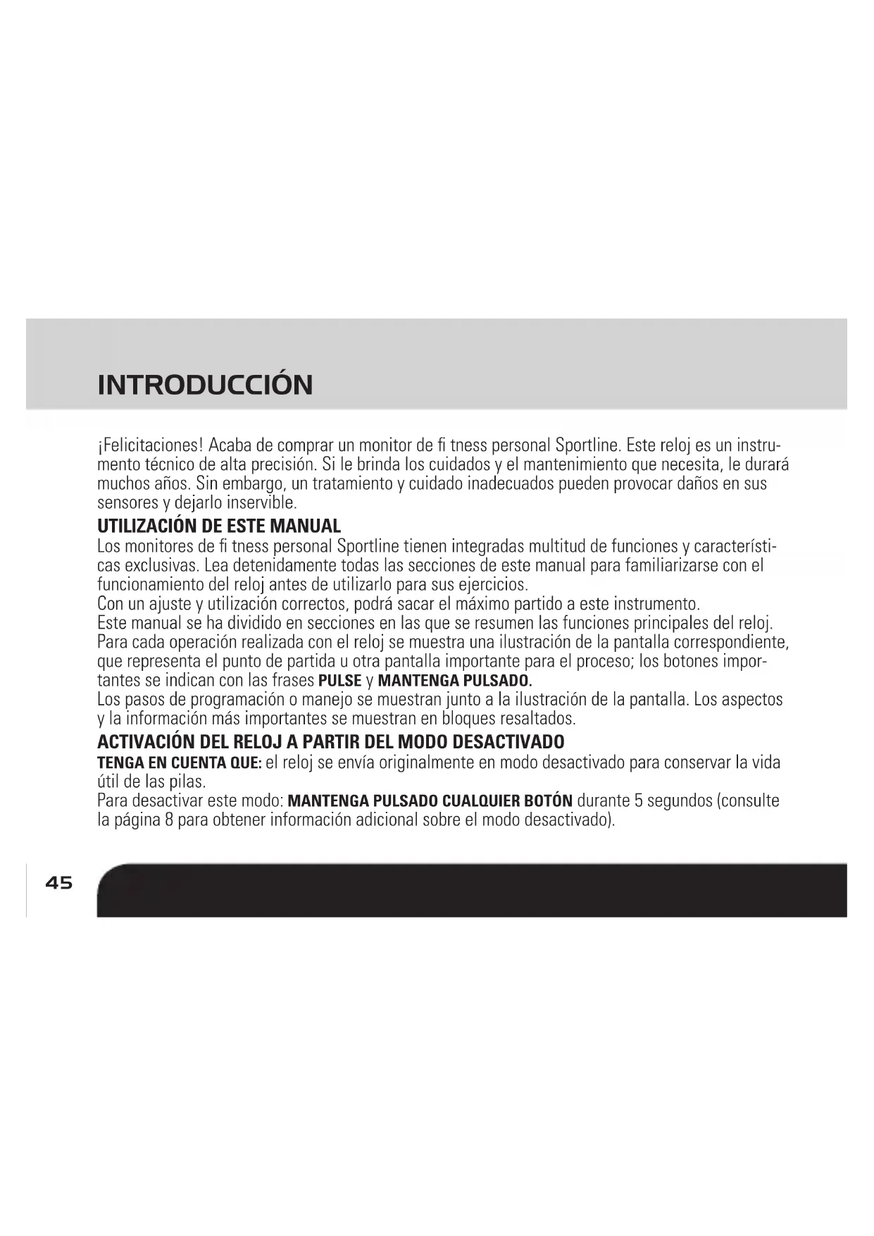 SP4964IS03SPO.indd 44SP4964IS03SPO.indd 44 7/28/10 3:42 PM7/28/10 3:42 PM45 INTRODUCCIÓN ¡Felicitaciones! Acaba de comprar un monitor de fi tness personal Sportline. Este reloj es un instru- mento técnico de alta precisión. Si le brinda los cuidados y el mantenimiento que necesita, le durará muchos años. Sin embargo, un tratamiento y cuidado inadecuados pueden provocar daños en sus sensores y dejarlo inservible.