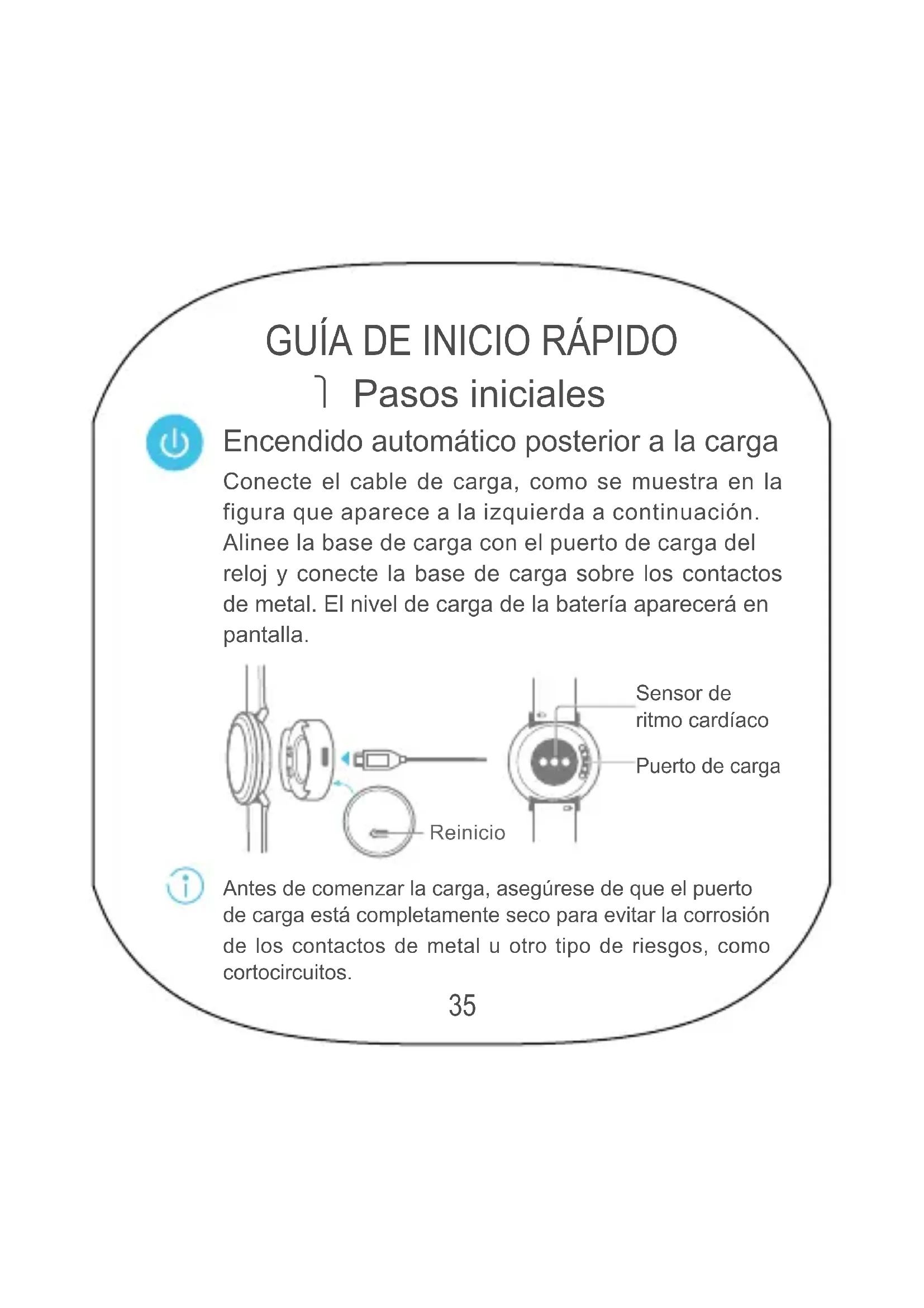 Encendido automático posterior a la carga Antes de comenzar la carga, asegúrese de que el puerto de carga está completamente seco para evitar la corrosión de los contactos de metal u otro tipo de riesgos, como cortocircuitos.Sensor de ritmo cardíacoPuerto de carga Reinicio36 Si desea reiniciar el reloj durante la carga, mantenga pulsado el botón de reinicio ubicado en la parte inferior de la base de carga durante 10 segundos. No inserte agujas ni otros objetos cortantes dentro del oricio de reinicio, ya que podrían dañarlo. Instalación de la aplicación Huawei Wear Una vez encendido el reloj, deslice el dedo hacia la izquierda en la pantalla de inicio para visualizar la pantalla del código QR. Escanee el código con el teléfono para descargar e instalar la aplicación Huawei Wear. Alternativamente, descargue la aplicación de la tienda Huawei HiApp o de Apple App Store. Huawei Wear