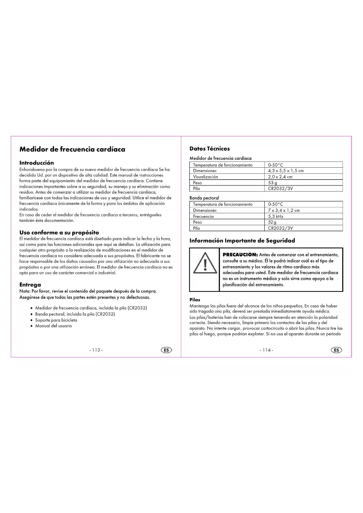 PRECAUCIÓN: Antes de comenzar con el entrenamiento, consulte a su médico. Él le podrá indicar cuál es el tipo de entrenamiento y los valores de ritmo cardíaco más adecuados para usted. Este medidor de frecuencia cardíaca no es un instrumento médico y solo sirve como apoyo a la planificación del entrenamiento. Pilas Mantenga las pilas fuera del alcance de los niños pequeños. En caso de haber sido tragada una pila, deverá ser prestada inmediatamente ayuda médica. Las pilas/baterías han de colocarse siempre teniendo en atención la polaridad correcta. Siendo necesario, limpie primero los contactos de las pilas y del aparato. No intente cargar, provocar cortocircuito o abrir las pilas. Nunca tire las pilas al fuego, porque podrían explotar. Si no usa el aparato durante un periodo-