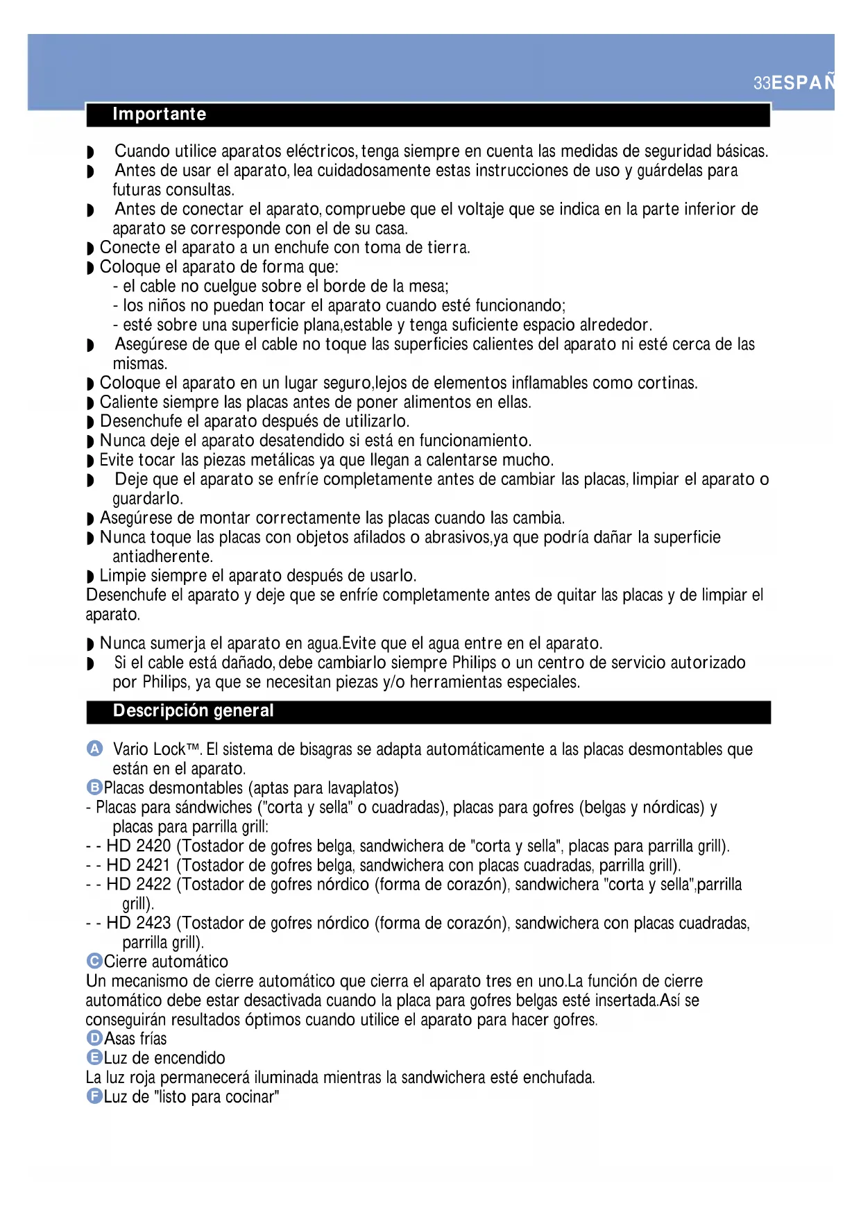 Descarga las instrucciones para tu Pinza para croque monsieur en formato PDF gratis! Encuentra tus instrucciones Cucina HD2422 - PHILIPS y toma tu dispositivo electrónico nuevamente en la mano. En esta página están publicados todos los documentos necesarios para el uso de su dispositivo. Cucina HD2422 de la marca PHILIPS.