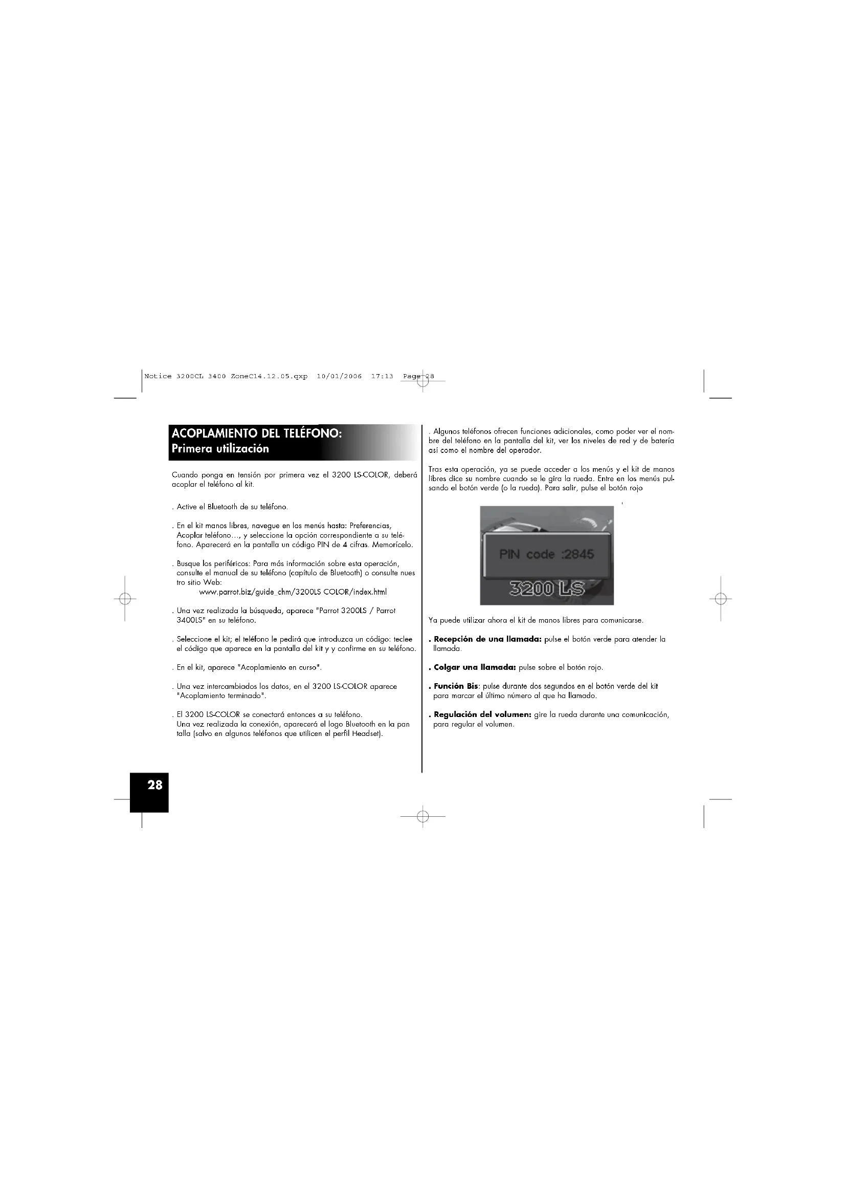 Pantalla LCD de color. Cable de instalación. Caja electrónica. Manual de empleo. Soportes de sujeción. Micrófono. INSTALACIÓN En primer lugar, elija el emplazamiento de la pantalla de color en el habitáculo del vehículo. Le aconsejamos que la coloque en el centro del salpicadero o cerca del conductor. Cerciórese de tener un buen ángulo de visión de la pantalla y que ésta no obstaculice el campo de visión de la carretera. Una vez instalado y puesto en marcha el kit de manos libres podrá regular la luminosidad de la pantalla. La conexión del micrófono se instala en dos lugares a su elección. Directamente en la parte lateral de la pantalla o en el cable conectado en la parte inferior de la pantalla. El micrófono se coloca a la izquierda del retrovisor para obtener una mejor calidad de audio. .El cable de instalación lleva dos conectores "ISO", así como una salida "line out" para conectarse directamente al amplificador, si es que dispone de uno. Autorradio con entradas "line in": Utilice preferentemente este tipo de conexión. Para ello, debe conectar los cables marrón y blanco (o rojo y negro), así como el hilo amarillo del "Mute" en la parte posterior de su autorradio. Autorradio con conectores "ISO": Desconecte los cables de audio y de alimentación de la autorradio. Conecte los conectores hembra del cable del kit a la autorradio. Conecte los cables de audio y alimentación del vehículo a los conectores machos. Si la autorradio va equipado con una entrada "Mute", conecte el cable amarillo del cable del kit a una de las entradas "Mute" 1, 2 ó 3. Autorradio sin conectores "ISO": Debe conseguir un cable adaptador "ISO". Instalación del cable del kit: El hilo rojo del cable del kit debe conectarse a los +12V permanentes, el hilo naranja a los 12V después de contacto y el hilo negro a masa. . Compruebe el esquema eléctrico de los cables "ISO" de la autorradio. En algunos vehículos, hay que invertir los hilos rojo y naranja. Esta operación se realiza simplemente invirtiendo los dos portafusibles. . No conecte el hilo naranja a los 12V permanentes, ya que correría el riesgo de descargar la batería del vehículo. Comprobación de la instalación: . Si se ha instalado bien el 3200 LS-COLOR, debería ver en la pantalla el mensaje "hasta luego" cuando corte el contacto del coche. En caso contrario, ello es síntoma de que los 12V de la llave y los 12V permanentes están invertidos. En este caso, invierta los dos portafusibles del cable de alimentación del kit. Notice 3200CL 3400 ZoneC14.12.05.qxp 10/01/2006 17:13 Page 2627 Français English Italiano Deutsch Português Español Dutch Notice 3200CL 3400 ZoneC14.12.05.qxp 10/01/2006 17:13 Page 2728 ACOPLAMIENTO DEL TELÉFONO: Primera utilización Cuando ponga en tensión por primera vez el 3200 LS-COLOR, deberá acoplar el teléfono al kit. . Active el Bluetooth de su teléfono. . En el kit manos libres, navegue en los menús hasta: Preferencias, Acoplar teléfono…, y seleccione la opción correspondiente a su telé- fono. Aparecerá en la pantalla un código PIN de 4 cifras. Memorícelo. . Busque los periféricos: Para más información sobre esta operación, consulte el manual de su teléfono (capítulo de Bluetooth) o consulte nues tro sitio Web: www.parrot.biz/guide_chm/3200LS COLOR/index.html . Una vez realizada la búsqueda, aparece "Parrot 3200LS / Parrot 3400LS" en su teléfono. . Seleccione el kit; el teléfono le pedirá que introduzca un código: teclee el código que aparece en la pantalla del kit y y confirme en su teléfono. . En el kit, aparece "Acoplamiento en curso". . Una vez intercambiados los datos, en el 3200 LS-COLOR aparece "Acoplamiento terminado". . El 3200 LS-COLOR se conectará entonces a su teléfono. Una vez realizada la conexión, aparecerá el logo Bluetooth en la pan talla (salvo en algunos teléfonos que utilicen el perfil Headset). . Algunos teléfonos ofrecen funciones adicionales, como poder ver el nom- bre del teléfono en la pantalla del kit, ver los niveles de red y de batería así como el nombre del operador. Tras esta operación, ya se puede acceder a los menús y el kit de manos libres dice su nombre cuando se le gira la rueda. Entre en los menús pul- sando el botón verde (o la rueda). Para salir, pulse el botón rojo Ya puede utilizar ahora el kit de manos libres para comunicarse. . Recepción de una llamada: pulse el botón verde para atender la llamada. . Colgar una llamada: pulse sobre el botón rojo. . Función Bis: pulse durante dos segundos en el botón verde del kit para marcar el último número al que ha llamado. . Regulación del volumen: gire la rueda durante una comunicación, para regular el volumen. Notice 3200CL 3400 ZoneC14.12.05.qxp 10/01/2006 17:13 Page 2829 FUNCIONES En la pantalla del kit, encontrará las principales informaciones sobre el teléfono, principalmente su agenda. Descarga automática de la agenda telefónica. Presentación del nombre y la imagen de la persona que llama. Llamada de contactos, mediante el reconocimiento de voz del kit. Corte de la autorradio durante la comunicación. Diario de llamadas. Regulación del volumen durante la comunicación. Gestión de llamadas. Marcación automática del último número. Cambio del fondo de la pantalla. Regulación de la luminosidad. Selección del sonido de la llamada. Regulación del idioma. DTMF: cuando reciba una llamada de su mensajería, pulse en la rueda para acceder a las cifras que permiten gestionar sus mensajes. Nota: la mayoría de estas funciones depende del teléfono que usted tenga. Français English Italiano Deutsch Português Español Dutch Notice 3200CL 3400 ZoneC14.12.05.qxp 10/01/2006 17:13 Page 29o Agenda A, B, C... o Llamadas Llamadas recibidas Llamadas emitidas Llamadas perdidas o Marcar o Preferencias Gestionar los contactos contactos A, B, C... Nombre grabar huella vocal Suprimir Visualizar la foto Suprimir la foto Borrar contactos Recibir contactos Borrar todos los contact