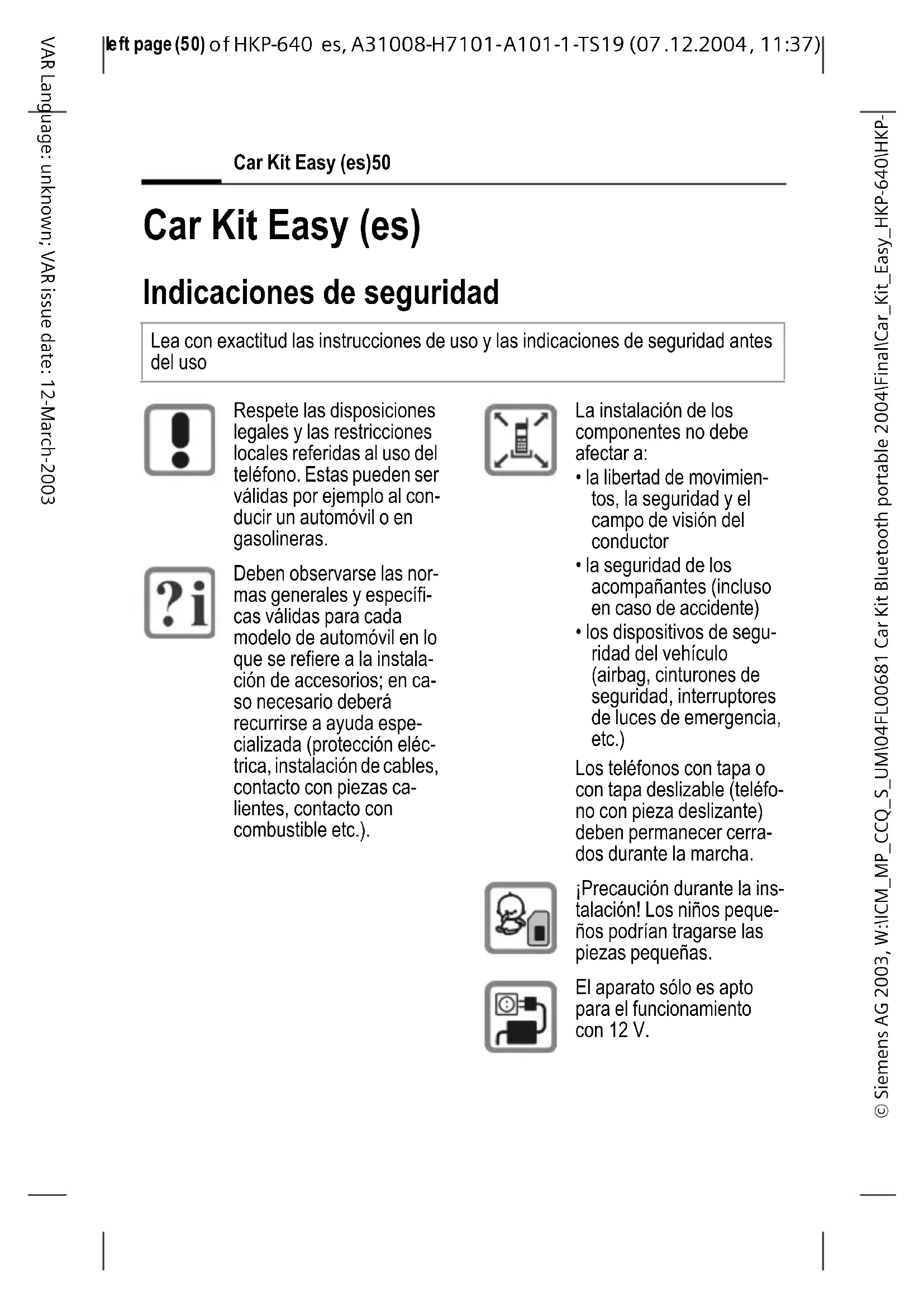 37) Car Kit Easy (es)50 VAR Language: unknown; VAR issue date: 12-March-2003 Car Kit Easy (es) Indicaciones de seguridad Lea con exactitud las instrucciones de uso y las indicaciones de seguridad antes del uso Respete las disposiciones legales y las restricciones locales referidas al uso del teléfono. Estas pueden ser válidas por ejemplo al con- ducir un automóvil o en gasolineras. Deben observarse las nor- mas generales y específi- cas válidas para cada modelo de automóvil en lo que se refiere a la instala- ción de accesorios; en ca- so necesario deberá recurrirse a ayuda espe- cializada (protección eléc- trica, instalación de cables, contacto con piezas ca- lientes, contacto con combustible etc.). La instalación de los componentes no debe afectar a: