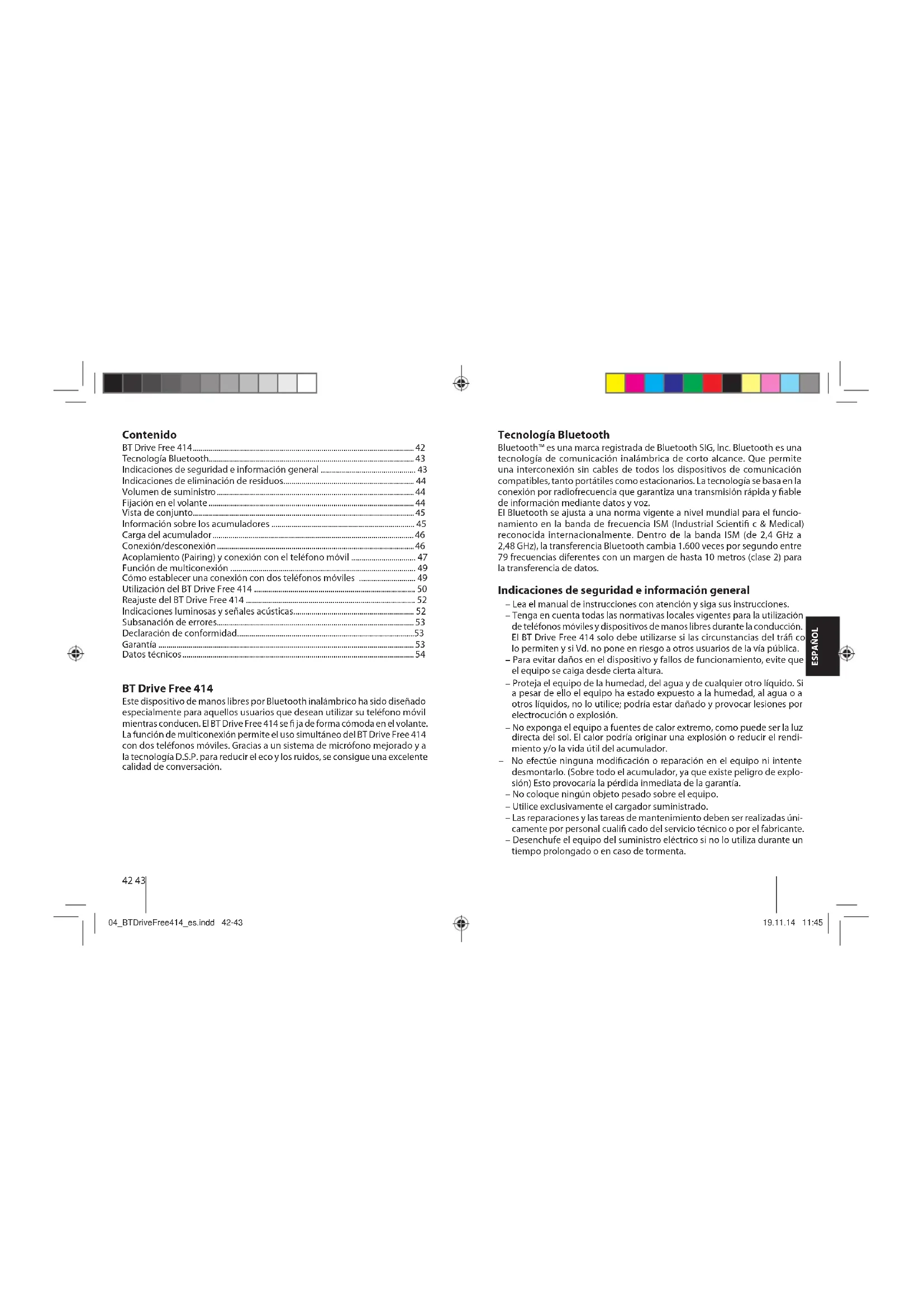 - Chargeur 5 V - 6 V DC, 300 mA Sous réserve de modi cations ! 03_BTDriveFree414_fr.indd 40-4103_BTDriveFree414_fr.indd 40-41 19.11.14 11:4419.11.14 11:4442 43 ESPAÑOL Contenido BT Drive Free 414 p. 42