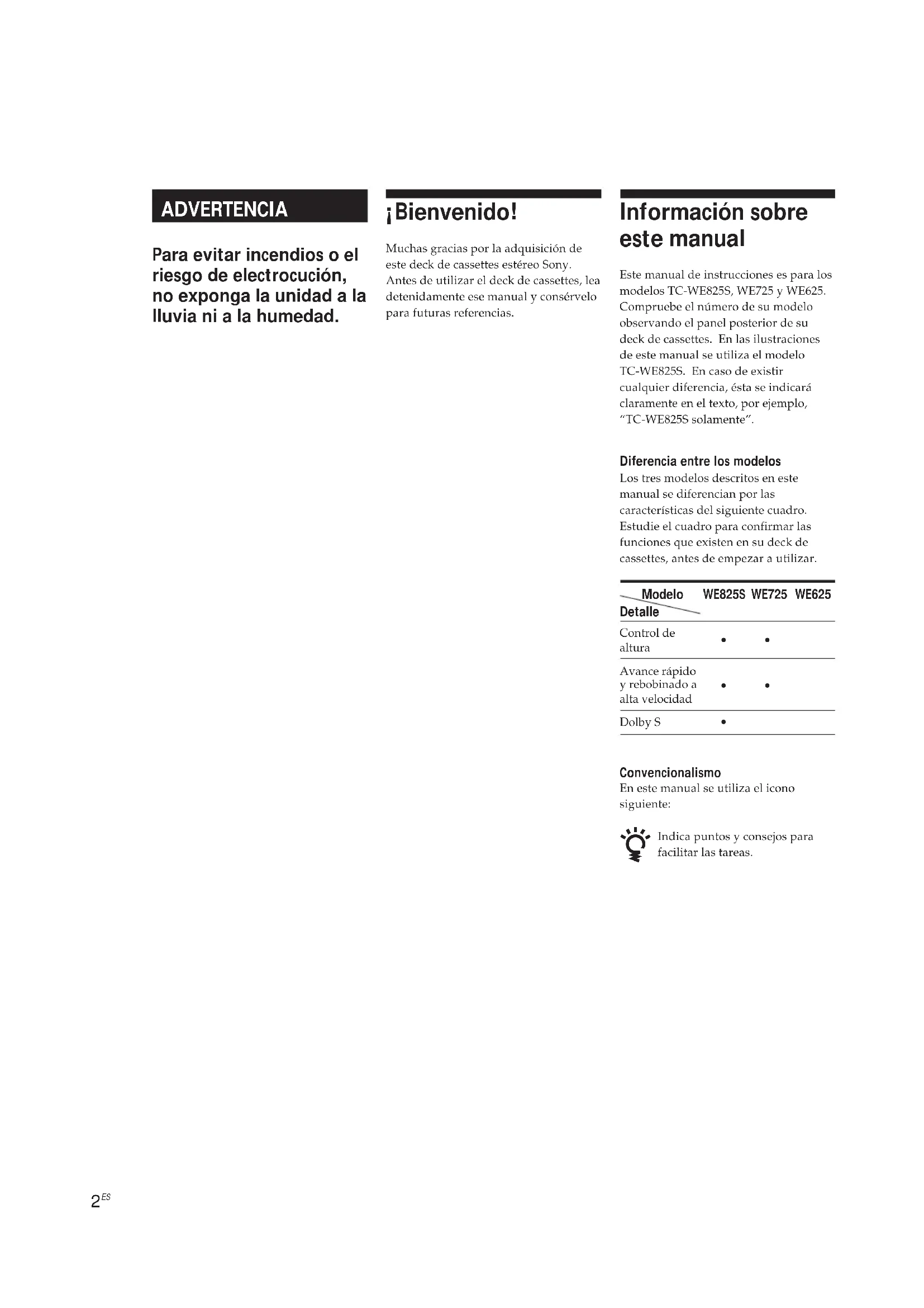 ADVERTENCIA Para evitar incendios o el riesgo de electrocución, no exponga la unidad a la lluvia ni a la humedad. Información sobre este manual Este manual de instrucciones es para losmodelos TC-WE825S, WE725 y WE625.Compruebe el número de su modeloobservando el panel posterior de sudeck de cassettes. En las ilustracionesde este manual se utiliza el modeloTC-WE825S. En caso de existircualquier diferencia, ésta se indicaráclaramente en el texto, por ejemplo,“TC-WE825S solamente”. Diferencia entre los modelos Los tres modelos descritos en estemanual se diferencian por lascaracterísticas del siguiente cuadro.Estudie el cuadro para confirmar lasfunciones que existen en su deck decassettes, antes de empezar a utilizar. ¡Bienvenido! Muchas gracias por la adquisición deeste deck de cassettes estéreo Sony.Antes de utilizar el deck de cassettes, leadetenidamente ese manual y consérvelopara futuras referencias. Detalle Modelo Control dealturaAvance rápidoy rebobinado aalta velocidadDolby S Convencionalismo En este manual se utiliza el iconosiguiente: Indica puntos y consejos parafacilitar las tareas. WE825S