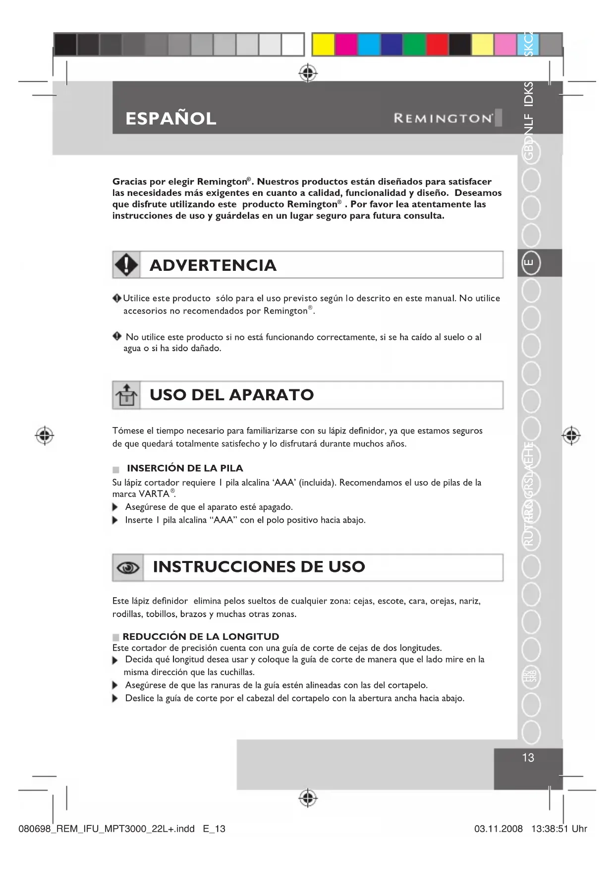 El aparato funciona con una pila alcalina. No tire el producto al cubo de la basura al terminar su vida útil. Puede entregarlo en nuestros centros de servicio o llevarlo a un punto de reco- lección apropiado. ADVERTENCIA: No queme ni destruya las pilas porque pueden explotar o liberar sustancias tóxicas. Para más información sobre reciclaje visite nuestra página web www.remington-europe.com 080698_REM_IFU_MPT3000_22L+.indd E_14080698_REM_IFU_MPT3000_22L+.indd E_14 03.11.2008 13:38:51 Uhr03.11.2008 13:38:51 UhrESPAÑOL