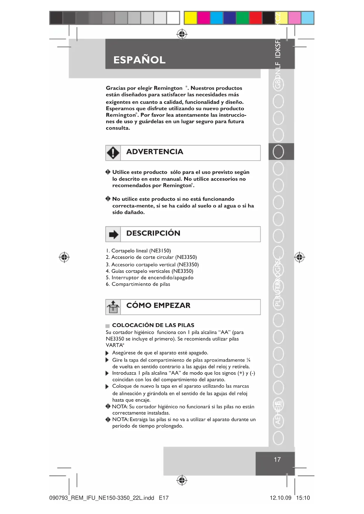 COLOCACIÓN DE LAS PILASSu cortador higiénico funciona con 1 pila alcalina “AA” (para NE3350 se incluye el primero). Se recomienda utilizar pilas VARTA Asegúrese de que el aparato esté apagado. Gire la tapa del compartimiento de pilas aproximadamente ¼ de vuelta en sentido contrario a las agujas del reloj y retírela. Introduzca 1 pila alcalina “AA” de modo que los signos (+) y (-) coincidan con los del compartimiento del aparato. Coloque de nuevo la tapa en el aparato utilizando las marcas de alineación y girándola en el sentido de las agujas del reloj hasta que encaje. NOTA: Su cortador higiénico no funcionará si las pilas no están correctamente instaladas. NOTA: Extraiga las pilas si no va a utilizar el aparato durante un período de tiempo prolongado. 090793_REM_IFU_NE150-3350_22L.indd E17090793_REM_IFU_NE150-3350_22L.indd E17 12.10.09 15:1012.10.09 15:1018 CAMBIO DE LOS ACCESORIOS (NE3350) Asegúrese de que el aparato esté apagado. Retire el cabezal girándolo en el sentido de las agujas del reloj hasta la posición de desbloqueo y tire de él hacia fuera. Coloque el otro cabezal colocándolo en la parte superior de la unidad y girándolo en el sentido de las agujas del reloj para que encaje.