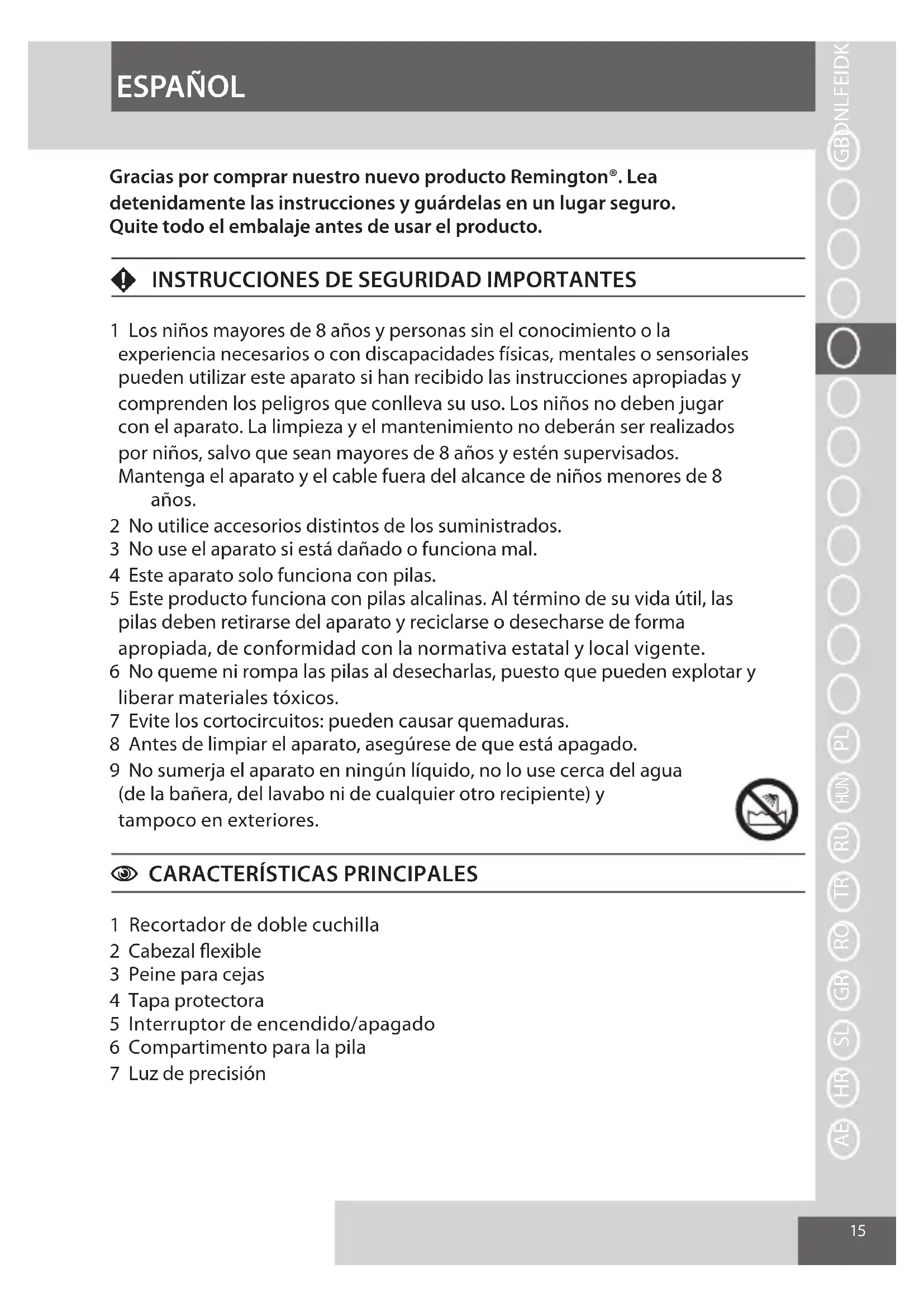 1 Los niños mayores de 8 años y personas sin el conocimiento o la experiencia necesarios o con discapacidades físicas, mentales o sensoriales pueden utilizar este aparato si han recibido las instrucciones apropiadas y comprenden los peligros que conlleva su uso. Los niños no deben jugar con el aparato. La limpieza y el mantenimiento no deberán ser realizados por niños, salvo que sean mayores de 8 años y estén supervisados. Mantenga el aparato y el cable fuera del alcance de niños menores de 8 años. 2 No utilice accesorios distintos de los suministrados. 3 No use el aparato si está dañado o funciona mal. 4 Este aparato solo funciona con pilas. 5 Este producto funciona con pilas alcalinas. Al término de su vida útil, las pilas deben retirarse del aparato y reciclarse o desecharse de forma apropiada, de conformidad con la normativa estatal y local vigente. 6 No queme ni rompa las pilas al desecharlas, puesto que pueden explotar y liberar materiales tóxicos. 7 Evite los cortocircuitos: pueden causar quemaduras. 8 Antes de limpiar el aparato, asegúrese de que está apagado. 9 No sumerja el aparato en ningún líquido, no lo use cerca del agua (de la bañera, del lavabo ni de cualquier otro recipiente) y tampoco en exteriores.