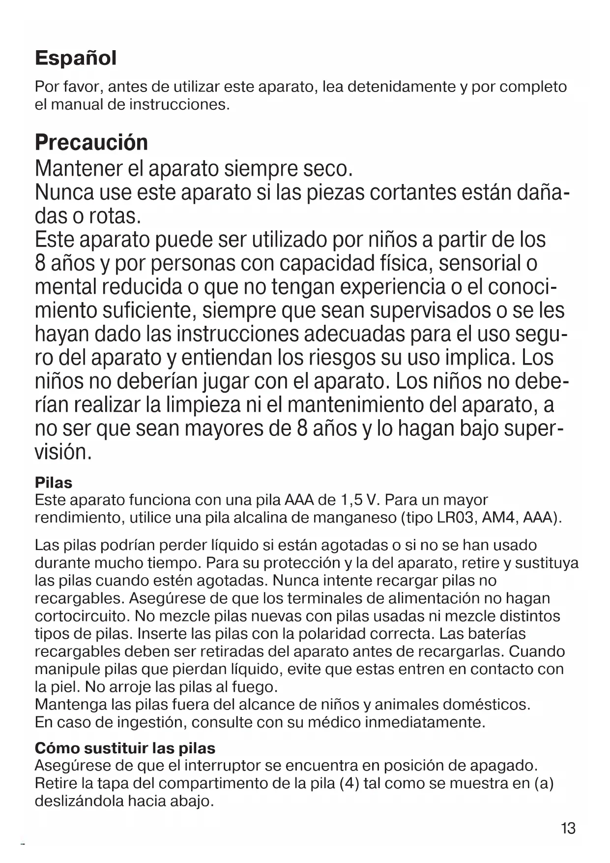 endant la dur ée de la garantie, Braun prendra gratuitement à sa charge la réparation des vices de fabrication ou de matière en se réservant le droit de décider si certaines pièces doivent être réparées ou si l’appareil lui-même doit être échangé. Cette garantie s’étend à tous les pays où cet appareil est commercialisé par Braun ou son distributeur exclusif. Cette garantie ne couvre pas : les dommages occasionnés par une utilisation inadéquate et l’usure normale. Cette garantie devient caduque si des réparations ont été effectuées par des personnes non agréées par Braun et si des pièces de rechange ne provenant pas de Braun ont été utilisées. Pour toute réclamation intervenant pendant la période de garantie, retournez ou rapportez l’appareil ainsi que l’attestation de garantie à votre revendeur ou à un Centre Service Agréé Braun. Veuillez vous référer à www.service.braun.com ou appeler le 0 800 944 802 (ser vice consommateur s – service & appel gratuits) pour connaître le Centre Service Agréé Braun le plus proche de chez vous. Clause spéciale pour la France Outre la garantie contractuelle exposée ci-dessus, nos clients bénéficient de la gar antie légale des vices cachés pr évue aux articles 1641 et suivants du Code civil. 91221272_PT_5010_EURO_S4-86.indd 1291221272_PT_5010_EURO_S4-86.indd 12 02.11.16 11:4602.11.16 11:46 CSS APPROVED Effective Date 4Nov2016 GMT - Printed 04Jan2017 Page 12 of 8613 Por favor, antes de utilizar este aparato, lea detenidamente y por completo el manual de instrucciones. Precaución Mantener el aparato siempre seco. Nunca use este aparato si las piezas cortantes están daña- das o rotas. Este aparato puede ser utilizado por niños a partir de los 8 años y por personas con capacidad física, sensorial o mental reducida o que no tengan experiencia o el conoci- miento suficiente, siempre que sean supervisados o se les hayan dado las instrucciones adecuadas para el uso segu- ro del aparato y entiendan los riesgos su uso implica. Los niños no deberían jugar con el aparato. Los niños no debe- rían realizar la limpieza ni el mantenimiento del aparato, a no ser que sean mayores de 8 años y lo hagan bajo super- visión. Pilas Este aparato funciona con una pila AAA de 1,5 V. Para un mayor rendimiento, utilice una pila alcalina de manganeso (tipo LR03, AM4, AAA). Las pilas podrían perder líquido si están agotadas o si no se han usado durante mucho tiempo. Para su protección y la del aparato, retire y sustituya las pilas cuando estén agotadas. Nunca intente recargar pilas no recargables. Asegúrese de que los terminales de alimentación no hagan cortocircuito. No mezcle pilas nuevas con pilas usadas ni mezcle distintos tipos de pilas. Inserte las pilas con la polaridad correcta. Las baterías recargables deben ser retiradas del aparato antes de recargarlas. Cuando manipule pilas que pierdan líquido, evite que estas entren en contacto con la piel. No arroje las pilas al fuego. Mantenga las pilas fuera del alcance de niños y animales domésticos. En caso de ingestión, consulte con su médico inmediatamente. Cómo sustituir las pilas Asegúrese de que el interruptor se encuentra en posición de apagado. Retire la tapa del compartimento de la pila (4) tal como se muestra en (a) deslizándola hacia abajo. Español 91221272_PT_5010_EURO_S4-86.indd 1391221272_PT_5010_EURO_S4-86.indd 13 02.11.16 11:4602.11.16 11:46 CSS APPROVED Effective Date 4Nov2016 GMT - Printed 04Jan2017 Page 13 of 8614 Introduzca la pila con el polo (+) hacia arriba y cierre el compartimento de la pila. Modo de uso Este aparato está perfectamente diseñado para eliminar de forma apurada y segura cualquier pelo no deseado del cuerpo y de la cara (p.ej. cuello, espalda, cejas). Deslice el interruptor de encendido/apagado (3) hacia arriba para encender el aparato. Sitúe el cabezal de corte (2) sobre el pelo para eliminarlo y guíelo lentamente en sentido contrario a la dirección de crecimiento del pelo. Para unos resultados óptimos, mantenga la piel estirada con una mano mientras usa el aparato. Este aparato viene con dos peines de recorte de diferente longitud para cortar el pelo a una longitud uniforme (p.ej., para arreglar las cejas):