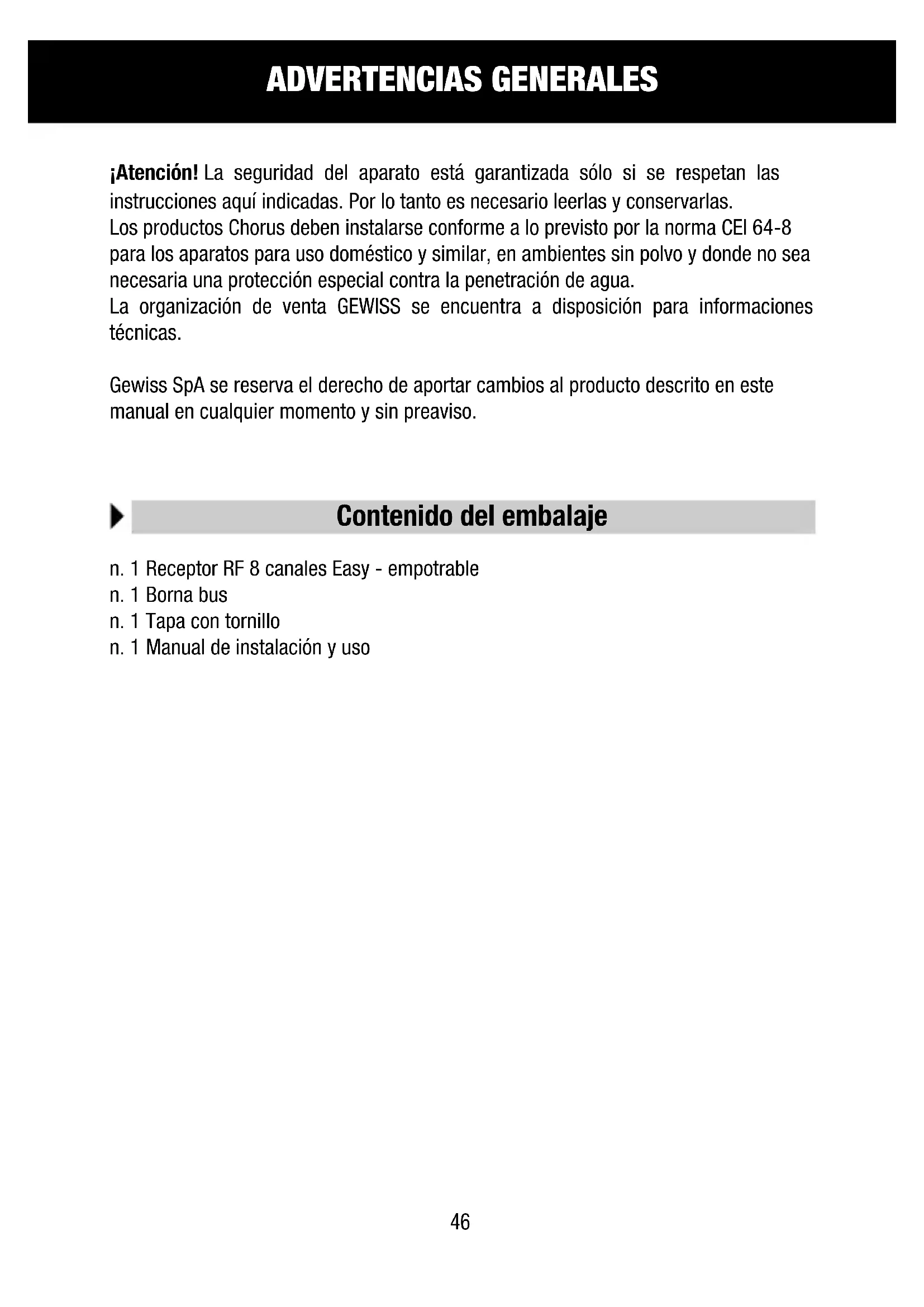 jAtencion! La seguridad del aparato está garantizada solo si se respetan las instruccionesquiryindicadas. Por lo tanto es necessario leerlas y conservas. Los productos Chorus deben instalarse conforme a lo previsto por la norma CEI 64-8 para los aparatos para uso domestico y similar, en ambientes sin polvo y donde no sea necessitiesuna proteccion especial contra la penetracion de agua. La organizacion deventa GEWISSseencuentraadispisoonpara informaciones