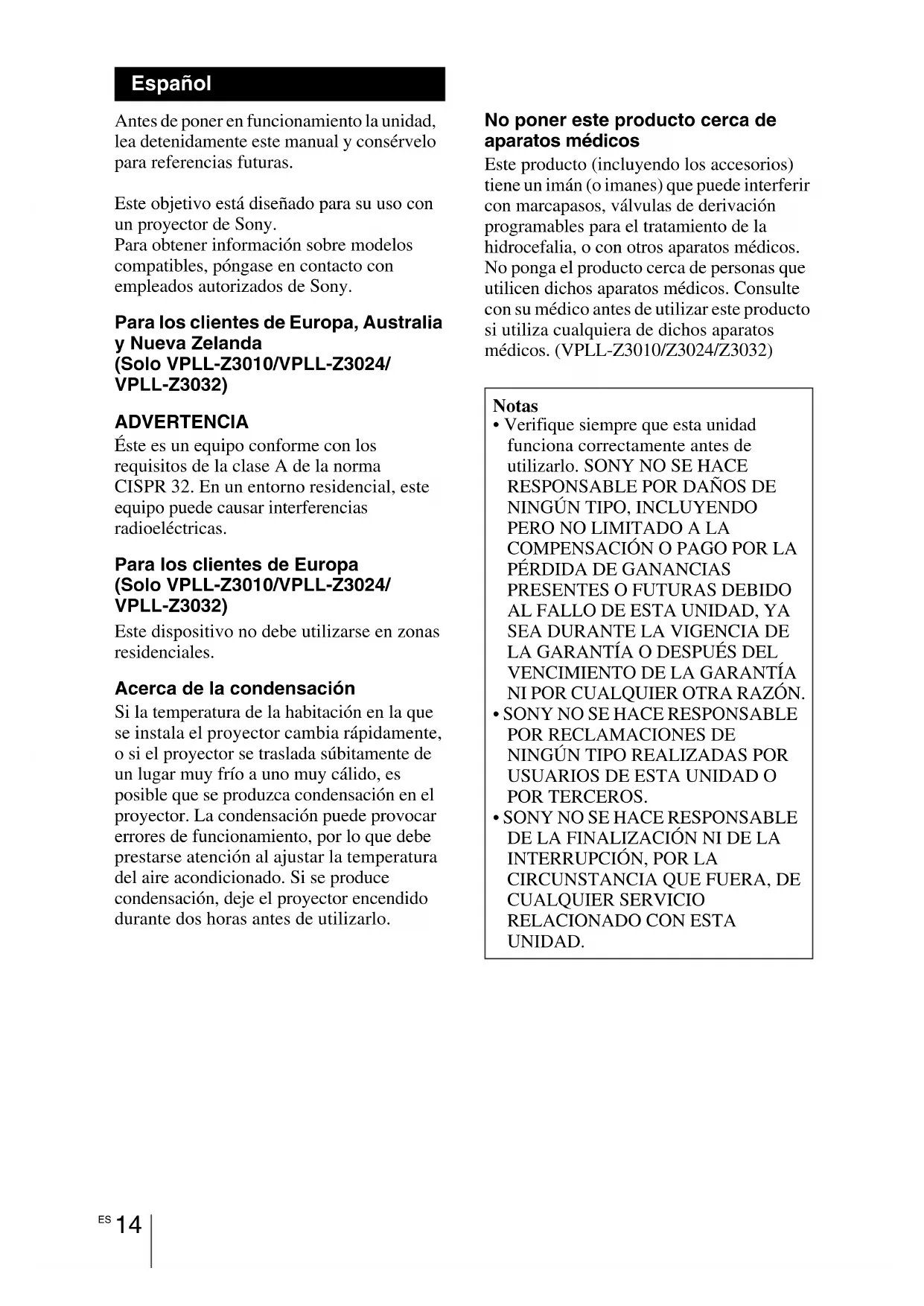Antes de poner en funcionamiento la unidad, lea detenidamente este manual y consérvelo para referencias futuras. Este objetivo está diseñado para su uso con un proyector de Sony. Para obtener información sobre modelos compatibles, póngase en contacto con empleados autorizados de Sony. Para los clientes de Europa, Australia y Nueva Zelanda (Solo VPLL-Z3010/VPLL-Z3024/ VPLL-Z3032) ADVERTENCIA Éste es un equipo conforme con los requisitos de la clase A de la norma CISPR 32. En un entorno residencial, este equipo puede causar interferencias radioeléctricas. Para los clientes de Europa (Solo VPLL-Z3010/VPLL-Z3024/ VPLL-Z3032) Este dispositivo no debe utilizarse en zonas residenciales. Acerca de la condensación Si la temperatura de la habitación en la que se instala el proyector cambia rápidamente, o si el proyector se traslada súbitamente de un lugar muy frío a uno muy cálido, es posible que se produzca condensación en el proyector. La condensación puede provocar errores de funcionamiento, por lo que debe prestarse atención al ajustar la temperatura del aire acondicionado. Si se produce condensación, deje el proyector encendido durante dos horas antes de utilizarlo. No poner este producto cerca de aparatos médicos Este producto (incluyendo los accesorios) tiene un imán (o imanes) que puede interferir con marcapasos, válvulas de derivación programables para el tratamiento de la hidrocefalia, o con otros aparatos médicos. No ponga el producto cerca de personas que utilicen dichos aparatos médicos. Consulte con su médico antes de utilizar este producto si utiliza cualquiera de dichos aparatos médicos. (VPLL-Z3010/Z3024/Z3032) Notas