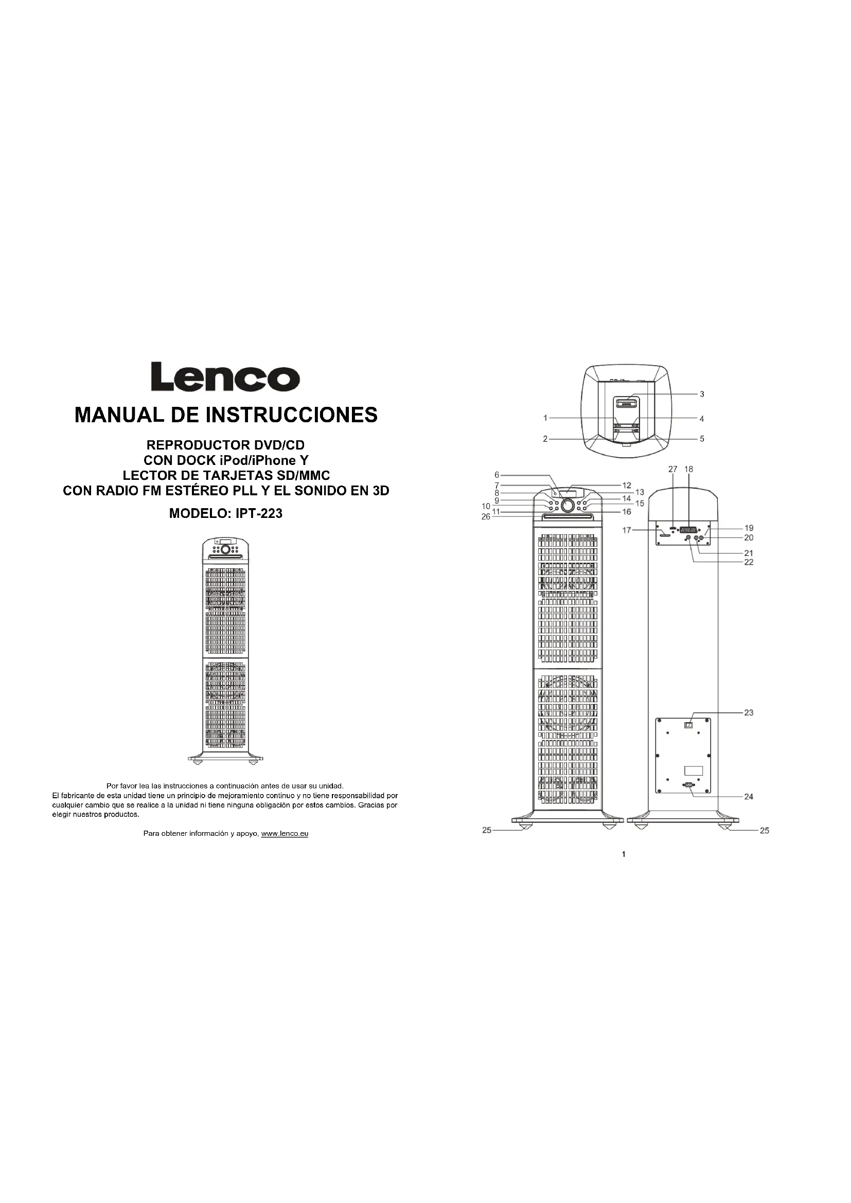 Por favor lea las instrucciones a continuación antes de usar su unidad. El fabricante de esta unidad tiene un principio de mejoramiento continuo y no tiene responsabilidad por cualquier cambio que se realice a la unidad ni tiene ninguna obligación por estos cambios. Gracias por elegir nuestros productos. Para obtener información y apoyo, www.lenco.eu