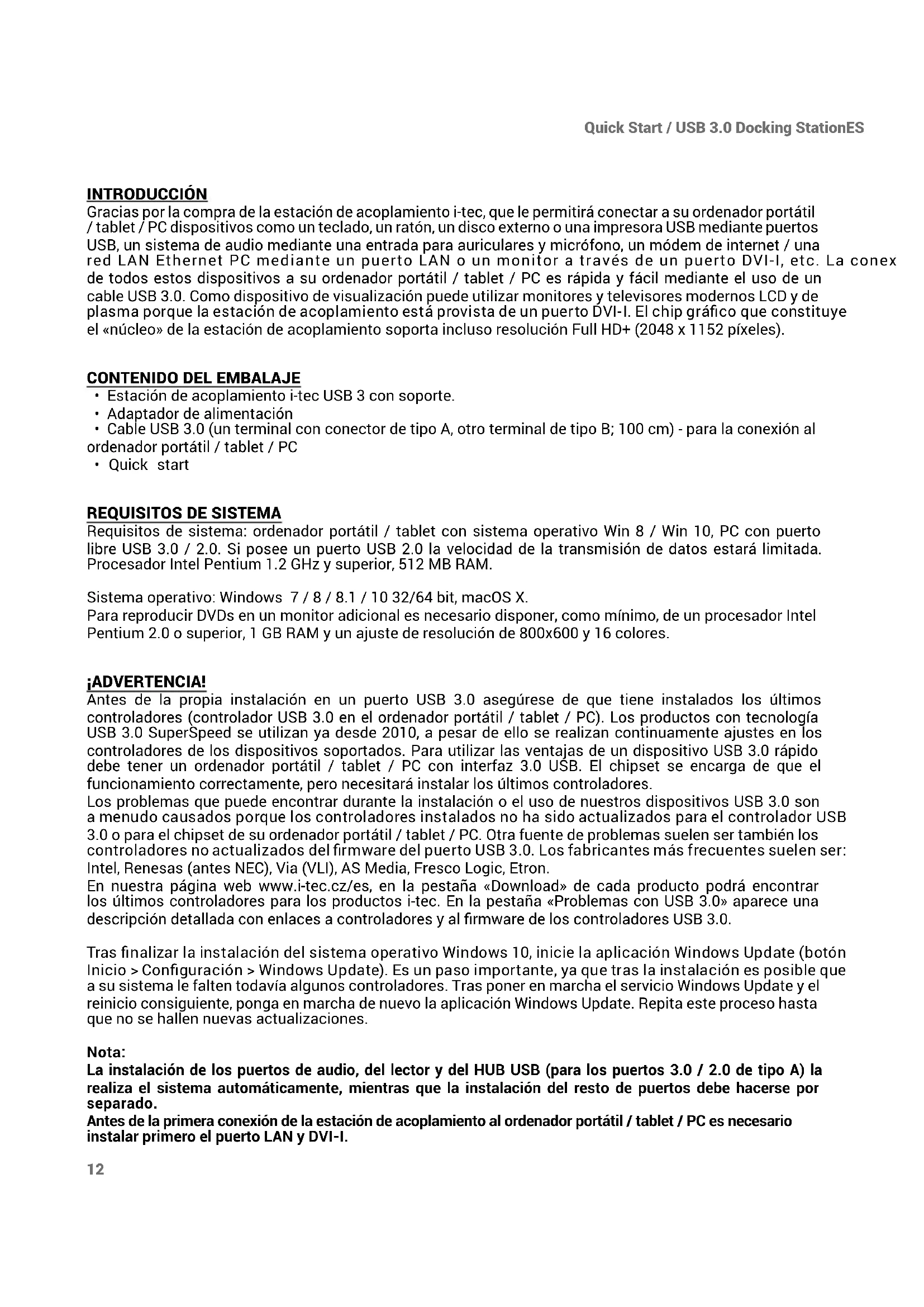 controladores no actualizados del firmware del puerto USB 3.0. Los fabricantes más frecuentes suelen ser: Intel, Renesas (antes NEC), Via (VLI), AS Media, Fresco Logic, Etron. En nuestra página web www.i-tec.cz/es, en la pestaña «Download» de cada producto podrá encontrar los últimos controladores para los productos i-tec. En la pestaña «Problemas con USB 3.0» aparece una descripción detallada con enlaces a controladores y al firmware de los controladores USB 3.0. Tras finalizar la instalación del sistema operativo Windows 10, inicie la aplicación Windows Update (botón Inicio > Configuración > Windows Update). Es un paso importante, ya que tras la instalación es posible que a su sistema le falten todavía algunos controladores. Tras poner en marcha el servicio Windows Update y el reinicio consiguiente, ponga en marcha de nuevo la aplicación Windows Update. Repita este proceso hasta que no se hallen nuevas actualizaciones. Nota: La instalación de los puertos de audio, del lector y del HUB USB (para los puertos 3.0 / 2.0 de tipo A) la realiza el sistema automáticamente, mientras que la instalación del resto de puertos debe hacerse por separado. Antes de la primera conexión de la estación de acoplamiento al ordenador portátil / tablet / PC es necesario instalar primero el puerto LAN y DVI-I.13 Quick Start / USB 3.0 Docking Station ES INSTALACIÓN DE CONTROLADORES EN WINDOWS 7 / 8 / 8.1 / 10 (VERSIÓN DE 32/64 BITS) No conecte la estación de acoplamiento al ordenador portátil / tablet / PC hasta que no instale los controladores correspondientes para el puerto LAN y DVI-I. Solo necesita instalar los controladores del dispositivo una vez, antes del primer uso. Descargue el software requerido de nuestra web www.i-tec.cz/es en la pestaña «Download» del producto en cuestión. Instale los controladores siguiendo el siguiente procedimiento: Para el puerto LAN y DVI-I ejecute el archivo descargado, elija el idioma de la instalación y proceda según las instrucciones que aparecen en la pantalla. Nota: En Windows 7 / 8 / 8.1 / 10 instale el puerto DVI-I en calidad de «Administrador». Durante la instalación es posible que la pantalla parpadee, pero es un proceso estándar. Tras finalizar la instalación, recomendamos realizar un reinicio del ordenador portátil / tablet / PC. INSTALACIÓN DE HARDWARE (CONEXIÓN DE LA ESTACIÓN DE ACOPLAMIENTO AL ORDENADOR PORTÁTIL / TABLET / PC).
