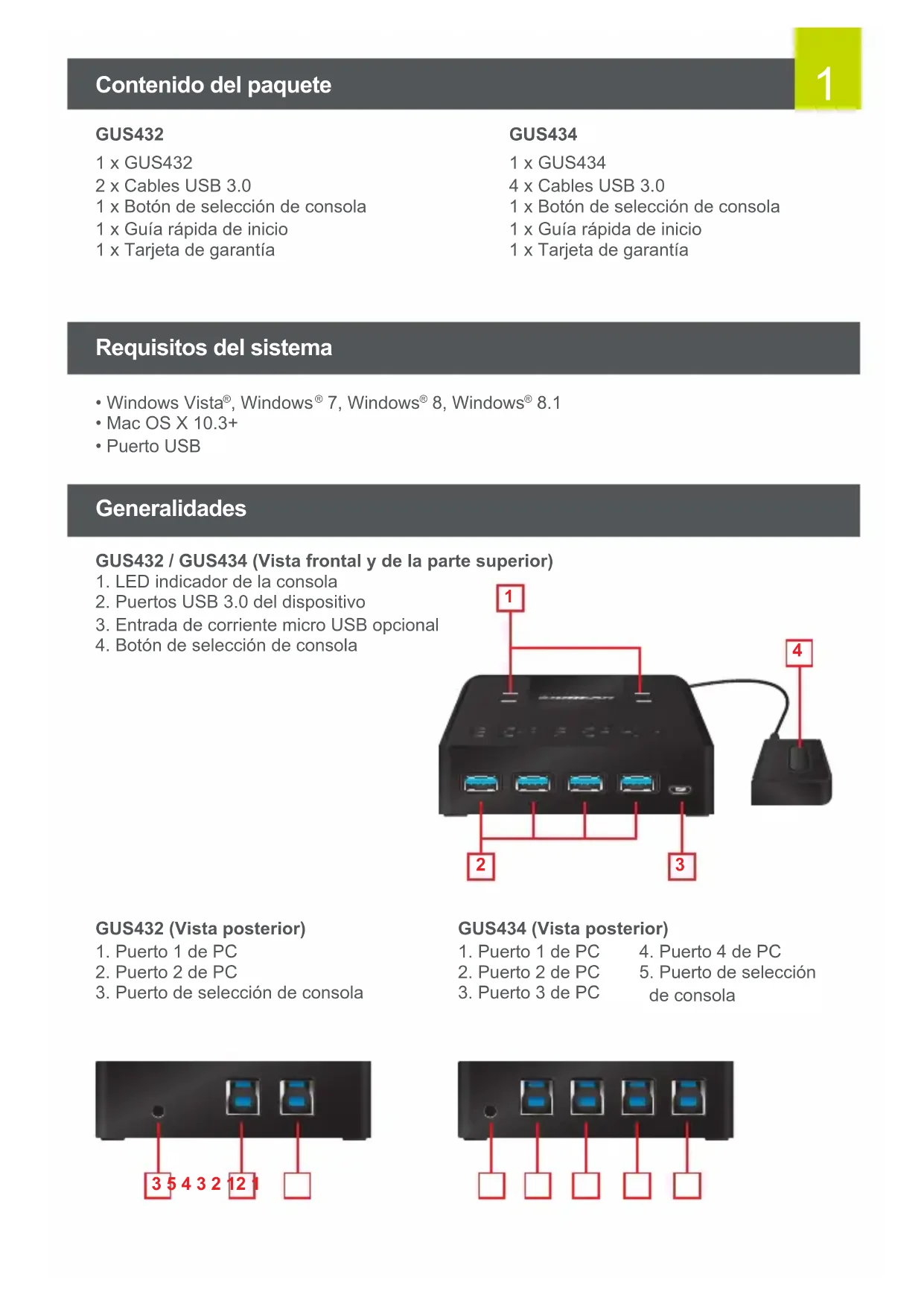 Los GUS432 y GUS434 permitted que varias computadoras compan un unico teclado, raton, impersona, monitor compatible con USB, disco duro, lector de tarjetas yculospositivos USB 3.0. Para partir un monitor no USB, IOGEAR ofrece adaptadores (que se venden por separado) que permiten la connexion de monitores DVI, HDMI o DisplayPort a un puerto USB 3.0. Los siguientes numeros de partes estan disponibles en www.iogear.com yculosistimientos de vente al publico: