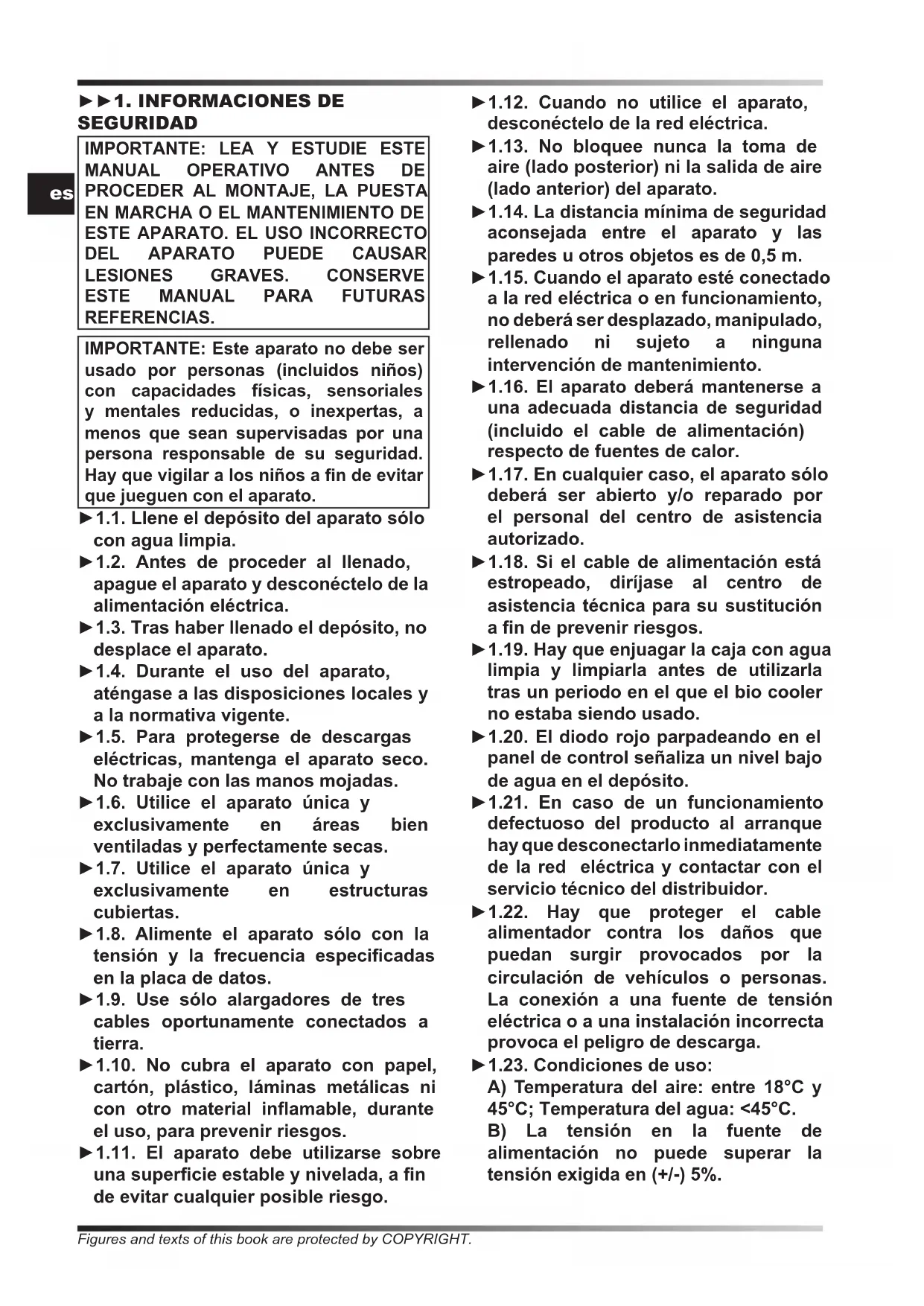 REFERENCIAS. IMPORTANTE: Este aparato no debe ser usado por personas (incluidos niños) con capacidades físicas, sensoriales y mentales reducidas, o inexpertas, a menos que sean supervisadas por una persona responsable de su seguridad. Hay que vigilar a los niños a n de evitar que jueguen con el aparato. ►1.1. Llene el depósito del aparato sólo con agua limpia. ►1.2. Antes de proceder al llenado, apague el aparato y desconéctelo de la alimentación eléctrica. ►1.3. Tras haber llenado el depósito, no desplace el aparato. ►1.4. Durante el uso del aparato, aténgase a las disposiciones locales y a la normativa vigente. ►1.5. Para protegerse de descargas eléctricas, mantenga el aparato seco. No trabaje con las manos mojadas. ►1.6. Utilice el aparato única y exclusivamente en áreas bien ventiladas y perfectamente secas. ►1.7. Utilice el aparato única y exclusivamente en estructuras cubiertas. ►1.8. Alimente el aparato sólo con la tensión y la frecuencia especicadas en la placa de datos. ►1.9. Use sólo alargadores de tres cables oportunamente conectados a tierra. ►1.10. No cubra el aparato con papel, cartón, plástico, láminas metálicas ni con otro material inamable, durante el uso, para prevenir riesgos. ►1.11. El aparato debe utilizarse sobre una supercie estable y nivelada, a n de evitar cualquier posible riesgo. ►1.12. Cuando no utilice el aparato, desconéctelo de la red eléctrica. ►1.13. No bloquee nunca la toma de aire (lado posterior) ni la salida de aire (lado anterior) del aparato. ►1.14. La distancia mínima de seguridad aconsejada entre el aparato y las paredes u otros objetos es de 0,5 m. ►1.15. Cuando el aparato esté conectado a la red eléctrica o en funcionamiento, no deberá ser desplazado, manipulado, rellenado ni sujeto a ninguna intervención de mantenimiento. ►1.16. El aparato deberá mantenerse a una adecuada distancia de seguridad (incluido el cable de alimentación) respecto de fuentes de calor. ►1.17. En cualquier caso, el aparato sólo deberá ser abierto y/o reparado por el personal del centro de asistencia autorizado. ►1.18. Si el cable de alimentación está estropeado, diríjase al centro de asistencia técnica para su sustitución a n de prevenir riesgos. ►1.19. Hay que enjuagar la caja con agua limpia y limpiarla antes de utilizarla tras un periodo en el que el bio cooler no estaba siendo usado. ►1.20. El diodo rojo parpadeando en el panel de control señaliza un nivel bajo de agua en el depósito. ►1.21. En caso de un funcionamiento defectuoso del producto al arranque hay que desconectarlo inmediatamente de la red eléctrica y contactar con el servicio técnico del distribuidor. ►1.22. Hay que proteger el cable alimentador contra los daños que puedan surgir provocados por la circulación de vehículos o personas. La conexión a una fuente de tensión eléctrica o a una instalación incorrecta provoca el peligro de descarga. ►1.23. Condiciones de uso: A) Temperatura del aire: entre 18°C y 45°C; Temperatura del agua: <45°C. B) La tensión en la fuente de alimentación no puede superar la tensión exigida en (+/-) 5%. Figures and texts of this book are protected by COPYRIGHT.es C) La entrada de aire tiene que estar libre de polvo e impurezas, o si fuera necesario hay que utilizar un sistema de depuración añadido. ►►2. DESEMBALAJE ►2.1. Quite todos los materiales de embalaje utilizados para embalar y enviar el aparato y elimínelos respetando las normas vigentes. ►2.2. Extraiga todos las piezas del embalaje. ►2.3. Controle si han sufrido desperfectos durante el transporte. Si el aparato presenta daños, informe inmediatamente al distribuidor que se lo vendió. ►►3. MONTAJE El aparato está equipado con ruedas para facilitar su manipulación. Según el modelo, las ruedas pueden venir montadas, o bien sin montar. Los componentes, suministrados con los correspondientes pernos de montaje, se encuentran en el interior del embalaje (Fig. 1). ►►4. FUNCIONAMIENTO ADVERTENCIA: Lea atentamente las ”INFORMACIONES DE SEGURIDAD”, antes de encender el aparato. ADVERTENCIA: Utilice sólo agua limpia para evitar averías u otras anomalías. ADVERTENCIA: Verique la correcta toma de tierra de su instalación eléctrica. La conexión a la red eléctrica debe realizarse de acuerdo con las normas nacionales vigentes. Alimente el aparato sólo con la tensión y la frecuencia especicadas en la placa de datos. NOTA: Estos modelos pueden conectarse a un sistema de conductos de agua a través de la conexión de una tubería al elemento de conexión (Fig. 10). ►►4.1. ENCENDIDO: ►4.1.1. Abra el portillo del depósito (Fig. 2). ►4.1.2. Llene de agua el depósito (Fig. 3); el nivel de agua debe estar comprendido entre las señales de MÍN y MÁX de la escala graduada, situada en el lateral del aparato (Fig. 4), a n de evitar riesgos. ►4.1.3. Cierre el portillo del depósito (Fig. 5). ►4.1.4. Conecte la toma de alimentación a la red eléctrica (Fig. 6). ►4.1.5. Presione el pulsador ON/OFF para encender el aparato (Fig. 9).